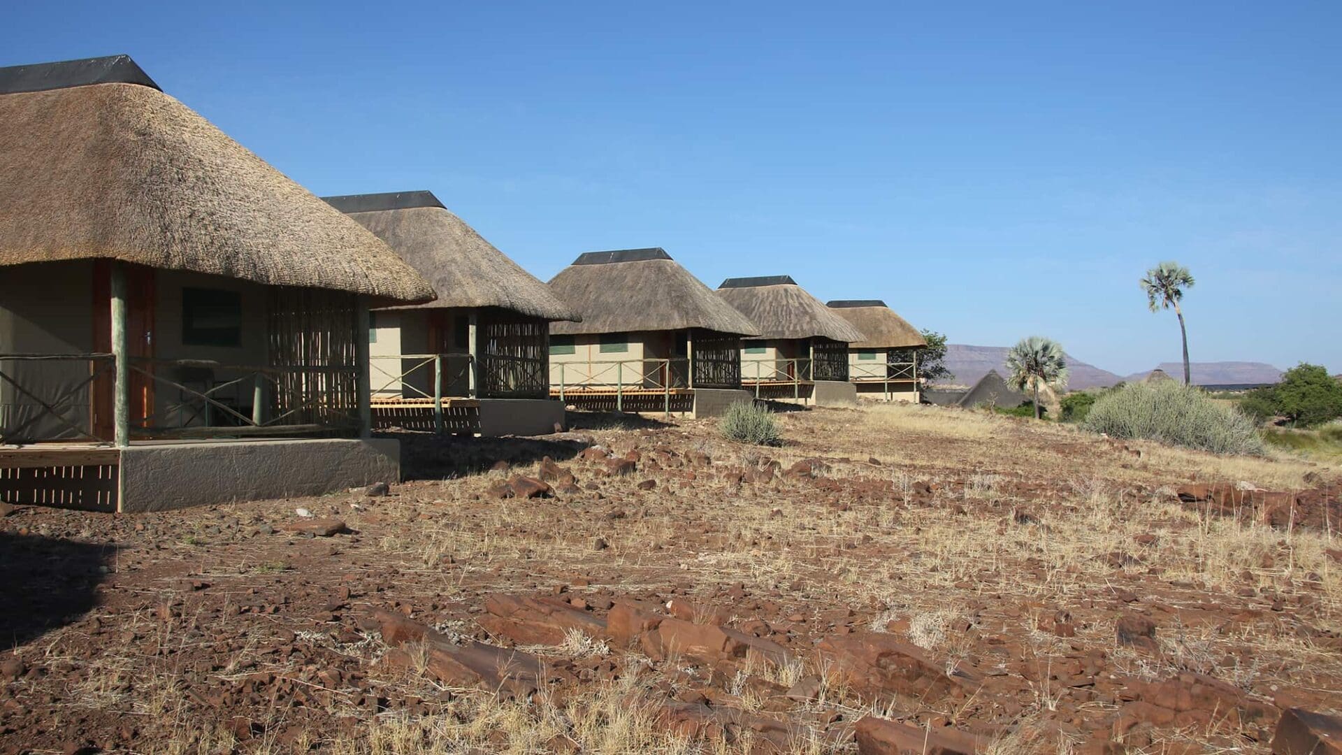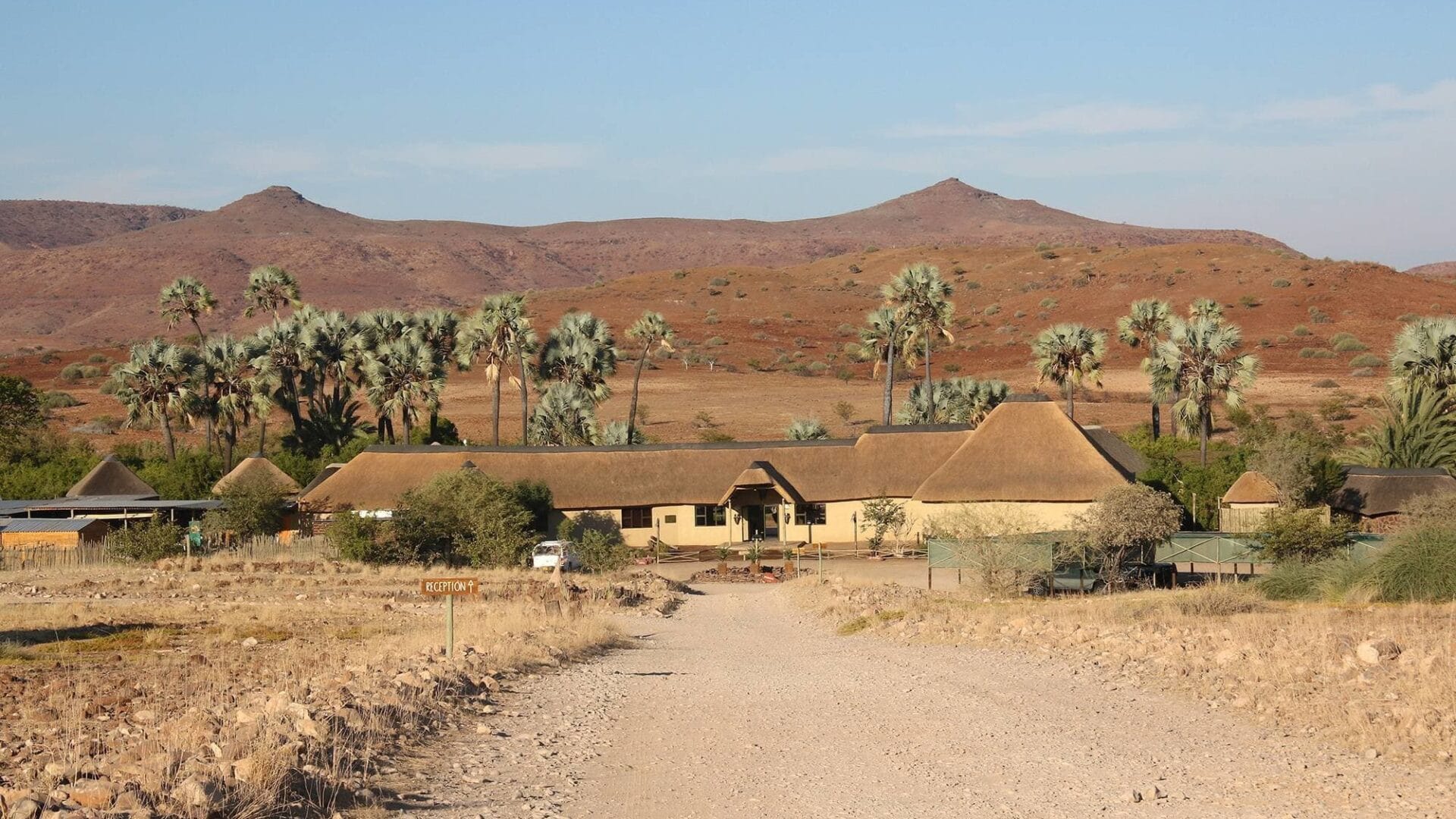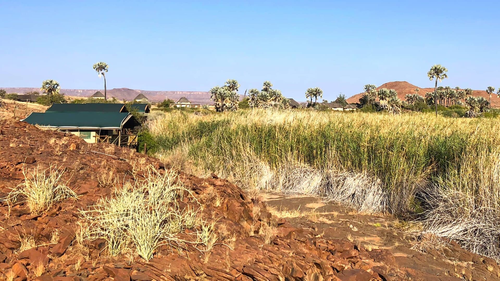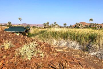 Between Kaokoland and the Skeleton Coast, where the flat-topped Etendeka mountains and the carpet of rich red rock greet the tributaries of the Uniab River, lies Palmwag Lodge and Camp. Amid swaying makalani palms and robust mopane trees nourished by underground water, the lodge overlooks the sweeping northern Damaraland landscape peppered with green euphorbias.