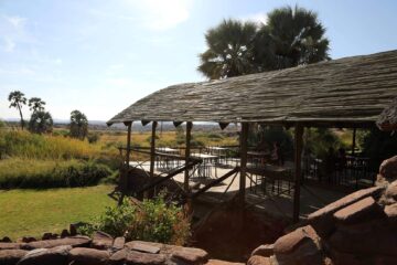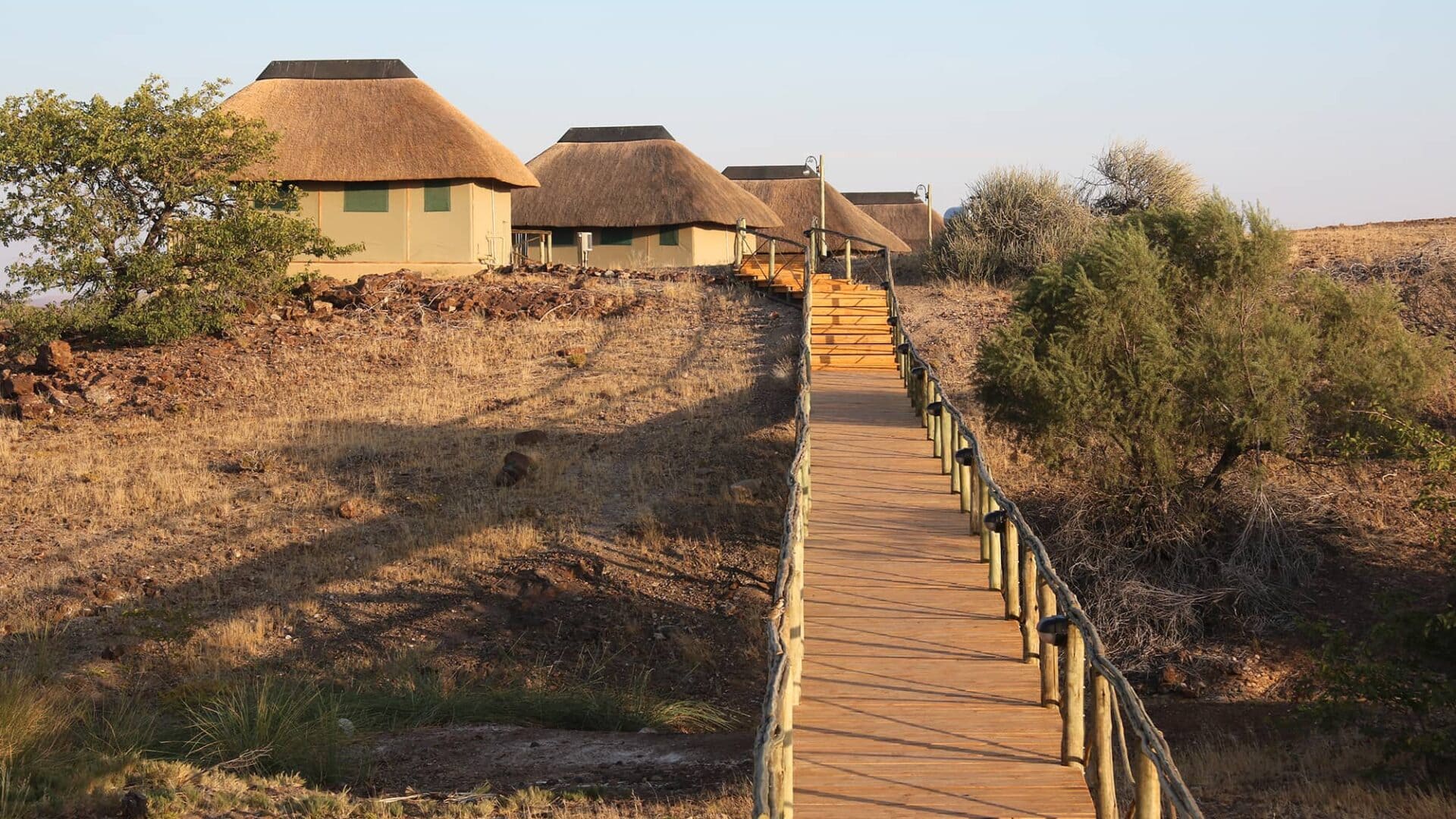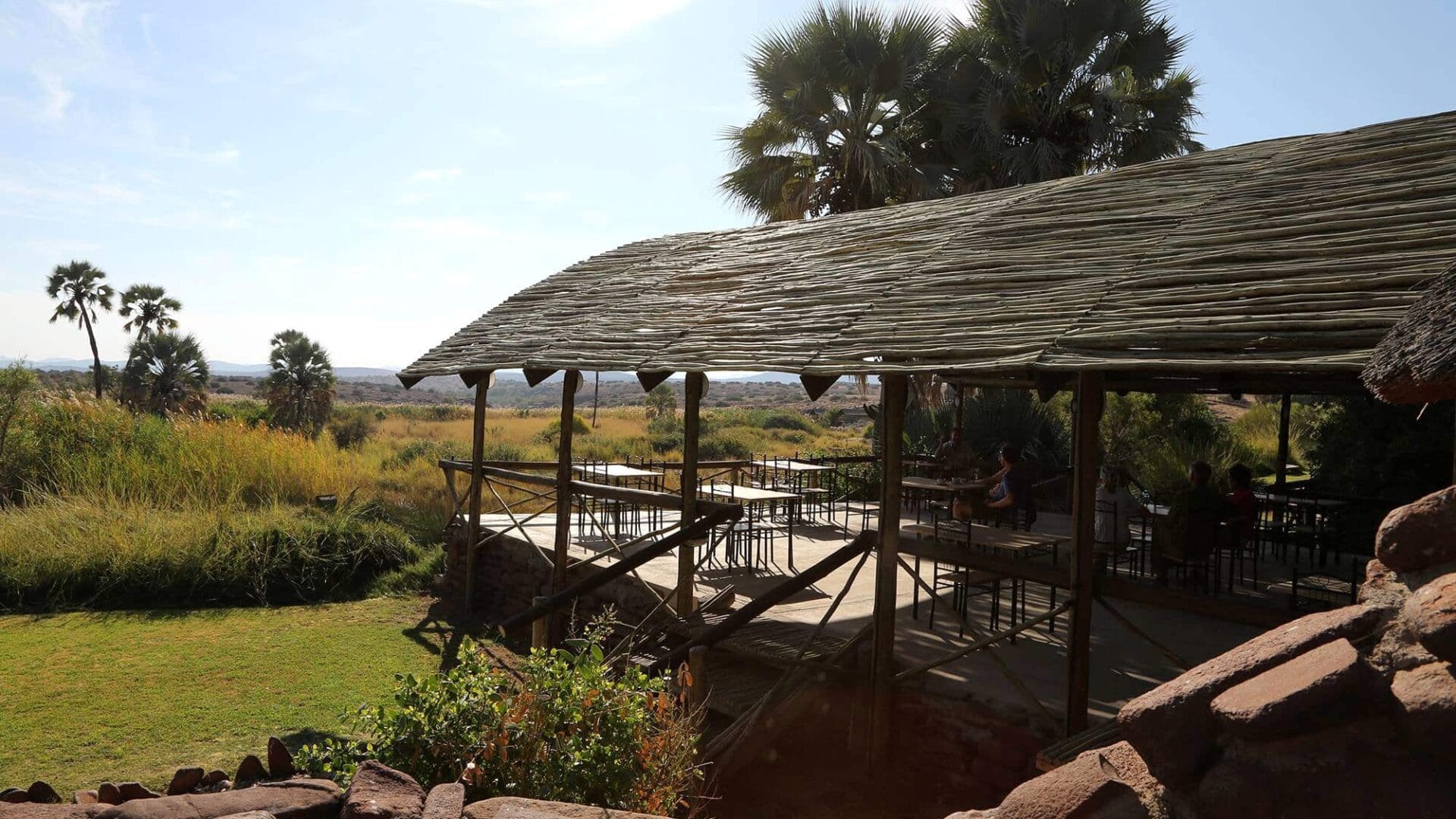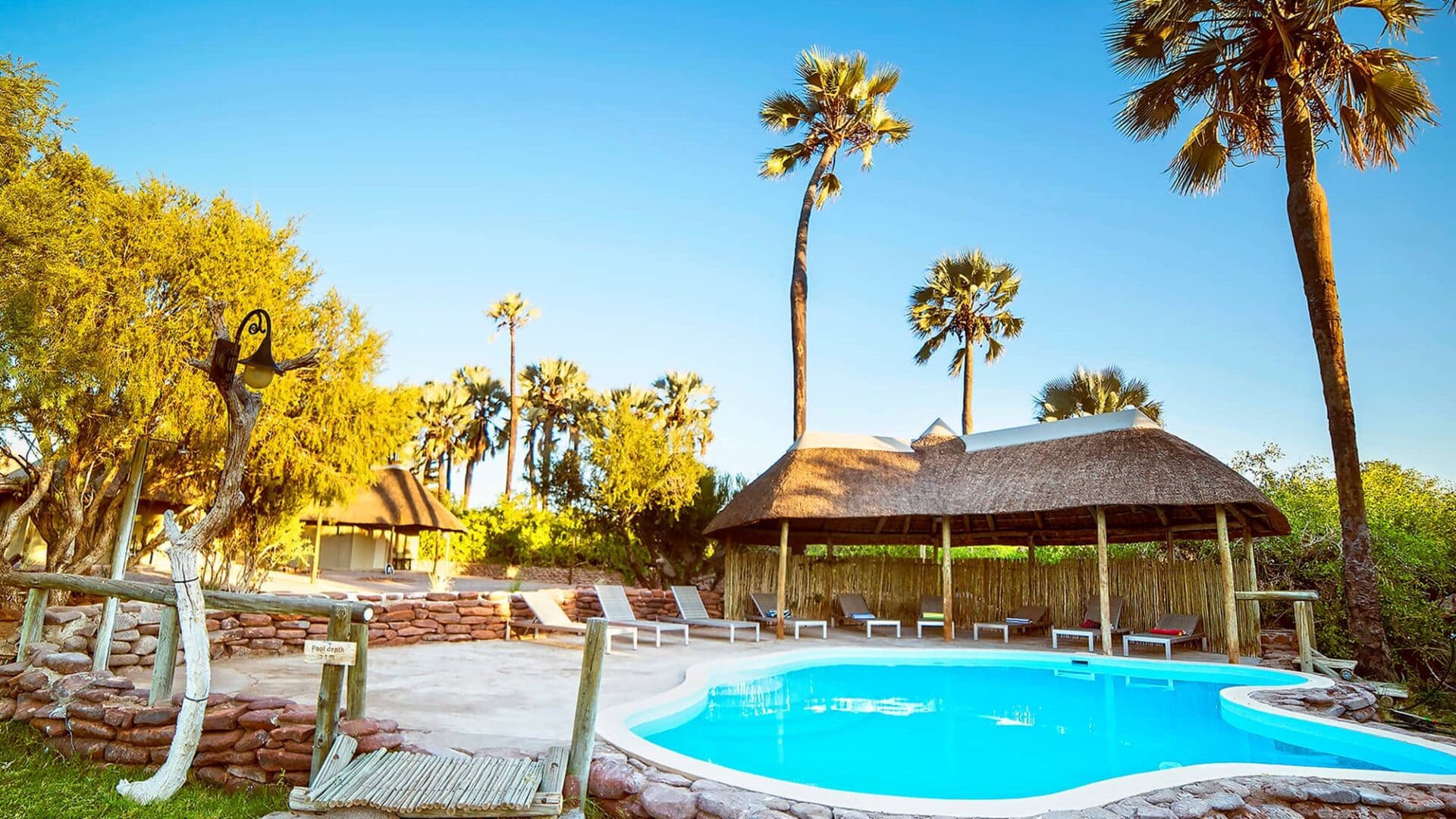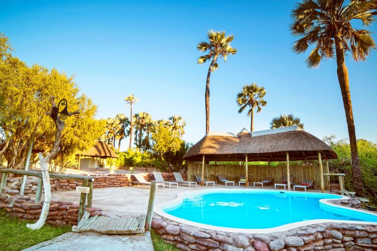 Between Kaokoland and the Skeleton Coast, where the flat-topped Etendeka mountains and the carpet of rich red rock greet the tributaries of the Uniab River, lies Palmwag Lodge and Camp. Amid swaying makalani palms and robust mopane trees nourished by underground water, the lodge overlooks the sweeping northern Damaraland landscape peppered with green euphorbias.