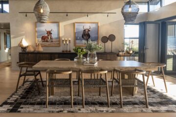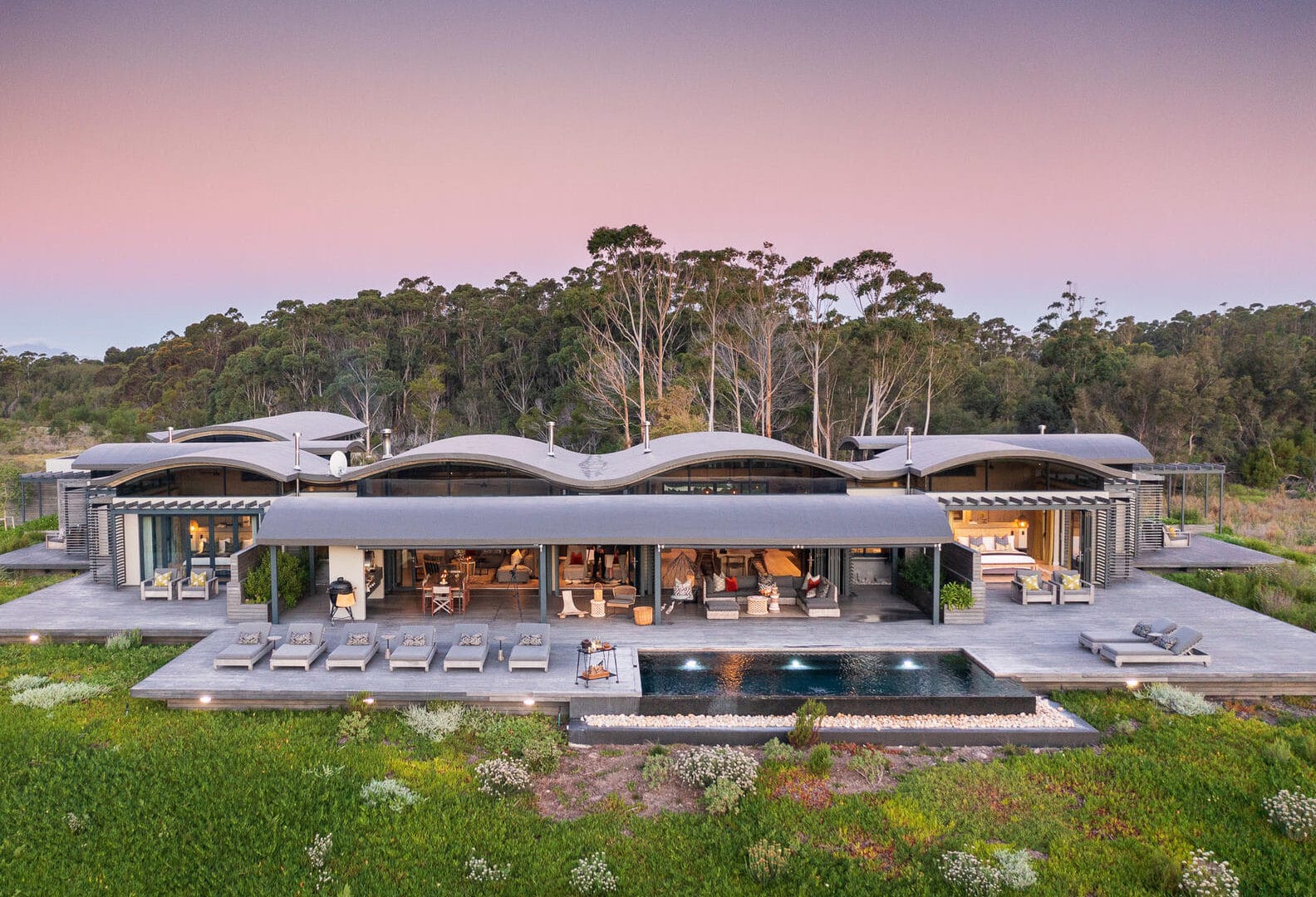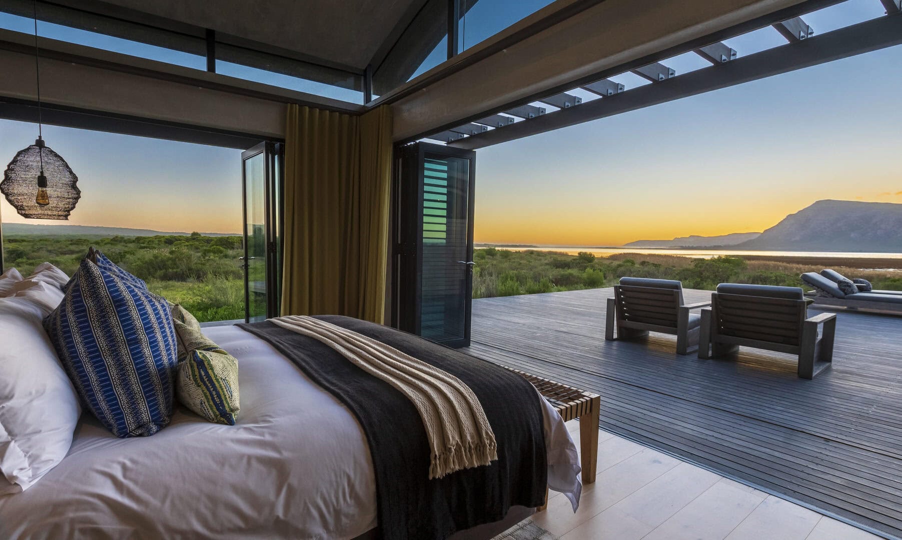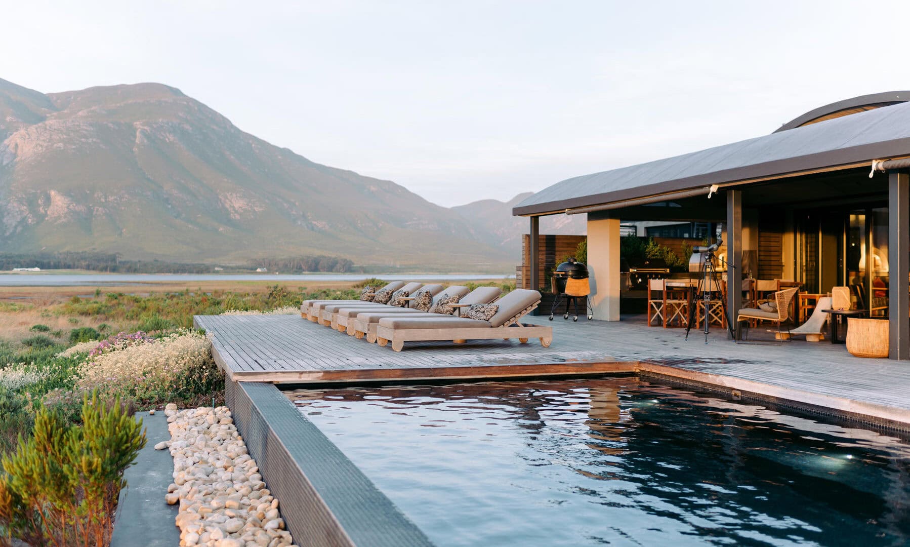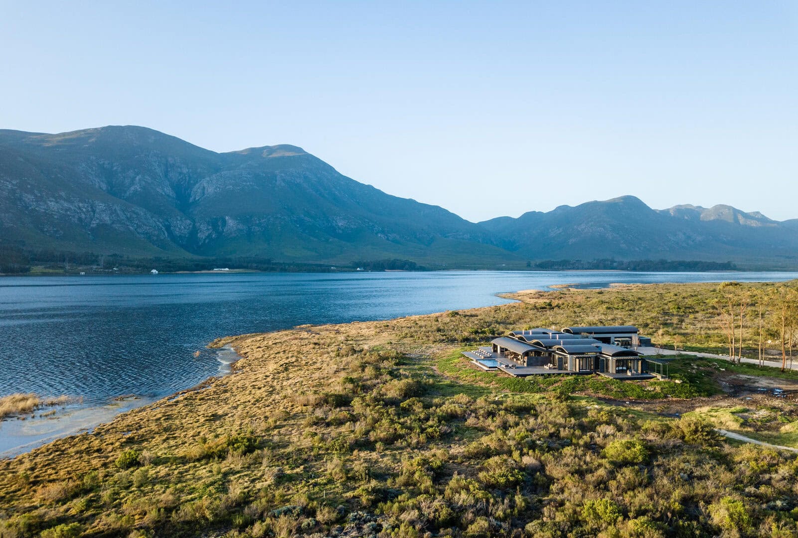 Perivoli Lagoon House is a secluded 4-bedroom luxury villa nestled in a 140-hectare wilderness of colorful Fynbos biome, overlooking the Kleinriver lagoon in South Africa’s Overberg region. This exclusive-use property offers panoramic views of the lagoon and majestic Kleinriver Mountains, providing a tranquil oasis amidst the Cape floral kingdom.