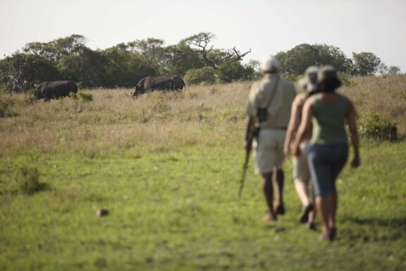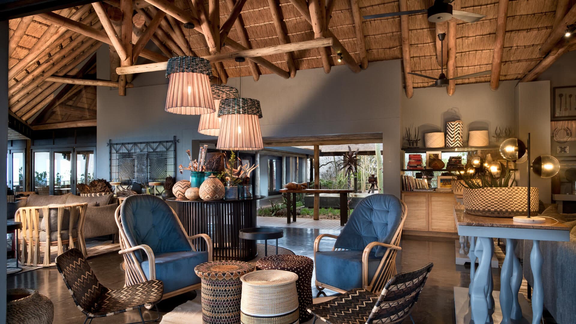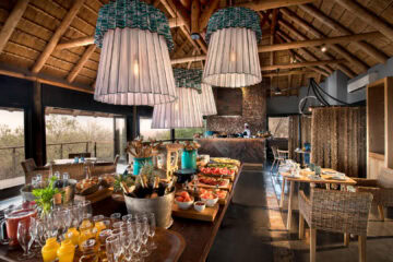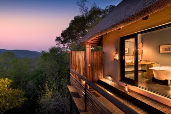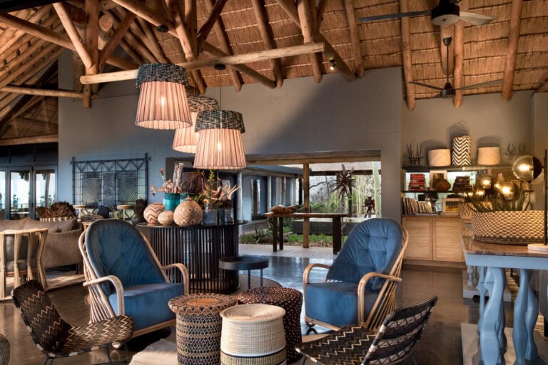 The rim flow pool follows the contours of the hill, with magnificent views of the Lebombo foothills, and the Safari shop showcases the best of regional basket and beadwork.