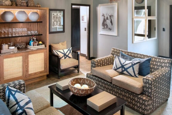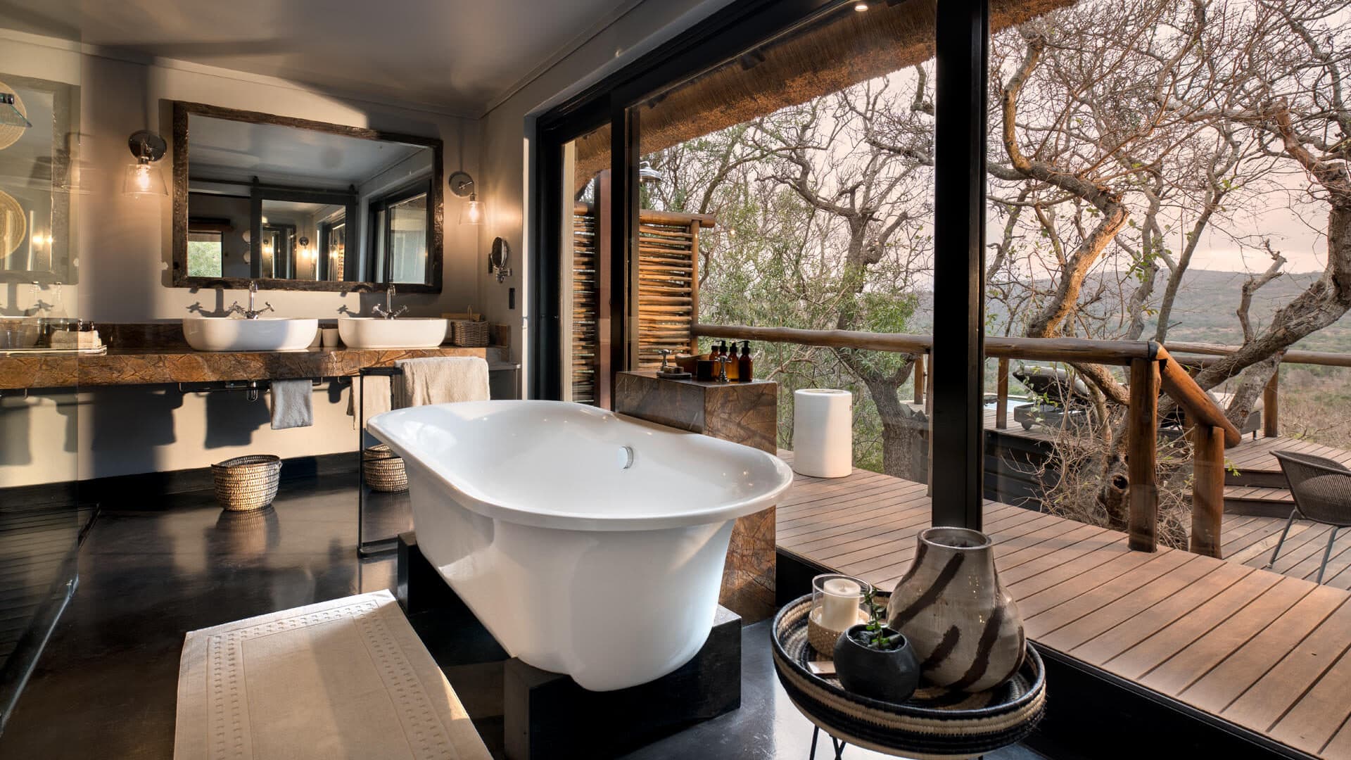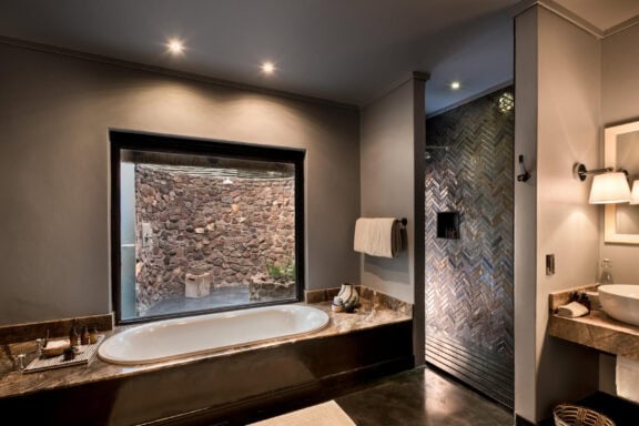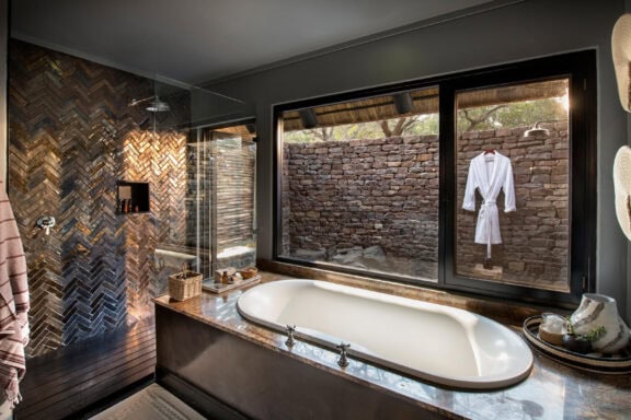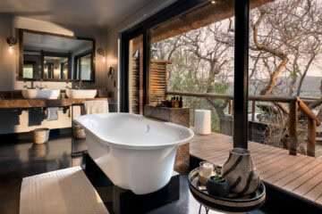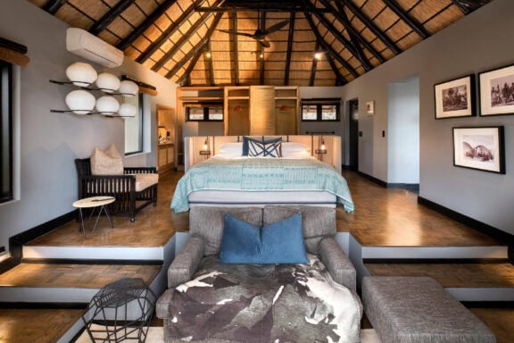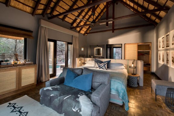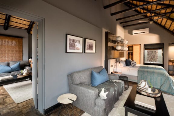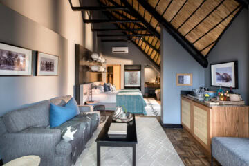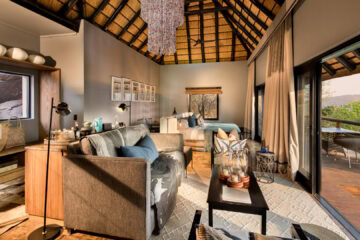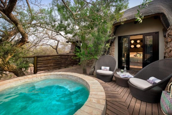 Roomy luxurious suites boast natural light through expansive glass windows, elegant ensuite bathrooms inspired by Zulu basketware designs, a beautifully appointed personal bar, private sitting area, sunken lounge and a spacious veranda with a plunge pool and outdoor shower.