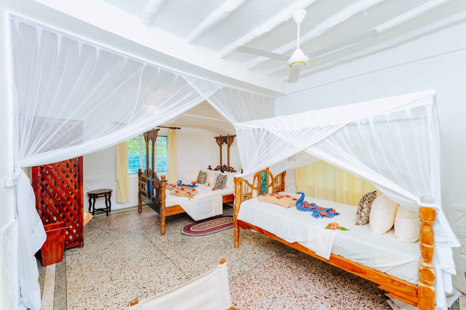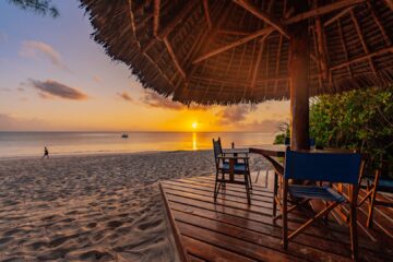 Pongwe Beach Hotel is nestled in a secluded cove with a coral lagoon, and offers an idyllic setting. The white sandy beach is dotted with coconut trees, some boasting hammocks for perfect relaxation.