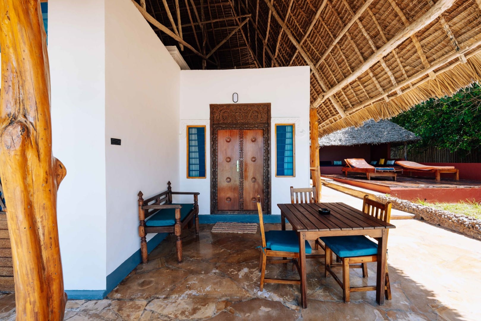 The hotel has several room categories, depending on your budget and preferences. There are garden rooms, beachfront rooms and a few selected sea-view suites with their own plunge pool. All feature a blend of traditional and modern elements. Crafted by local artisans, they feature coconut palm thatched roofs, hand-crafted wooden doors, and en-suite bathrooms with Moroccan-style showers.
