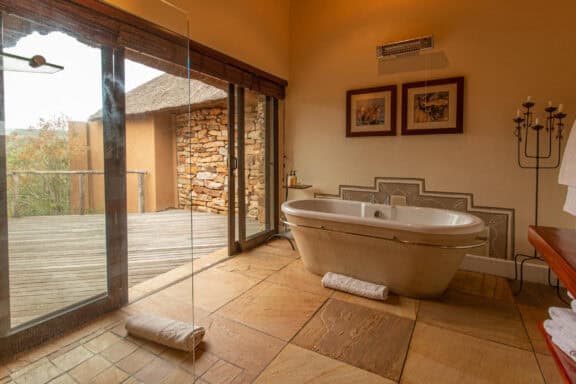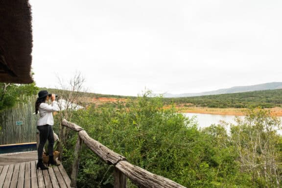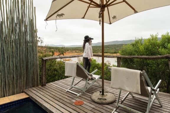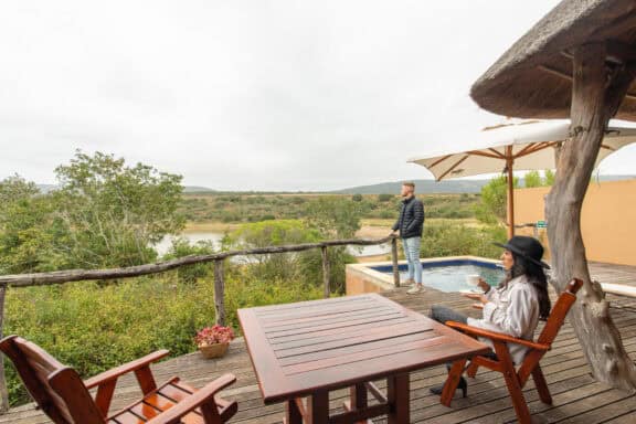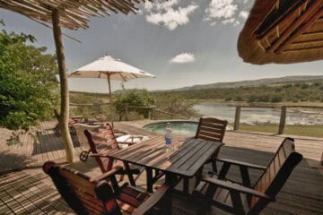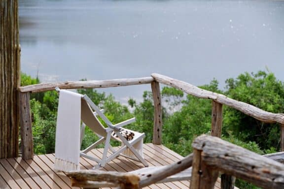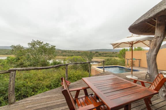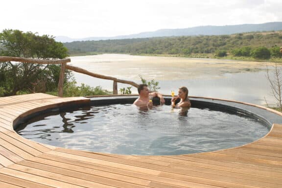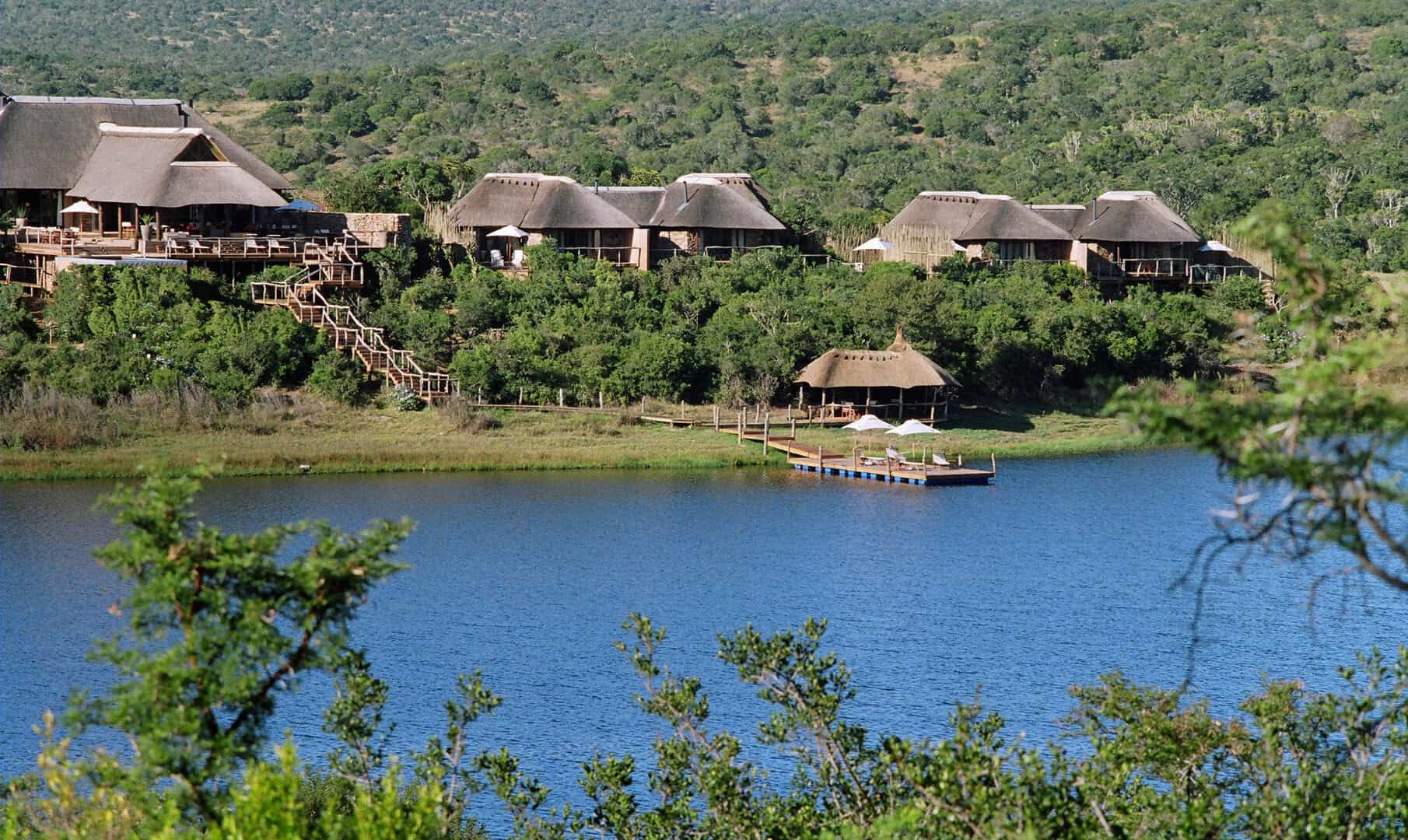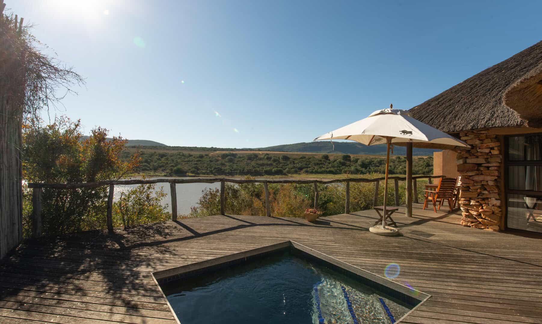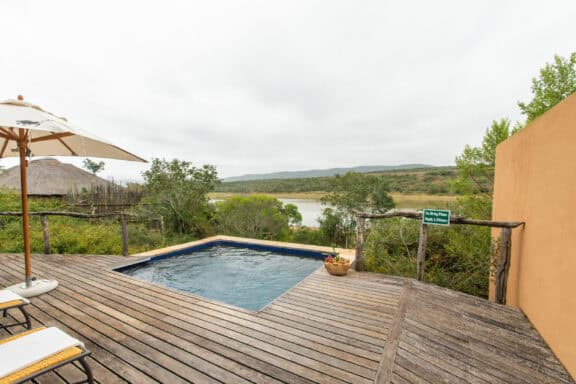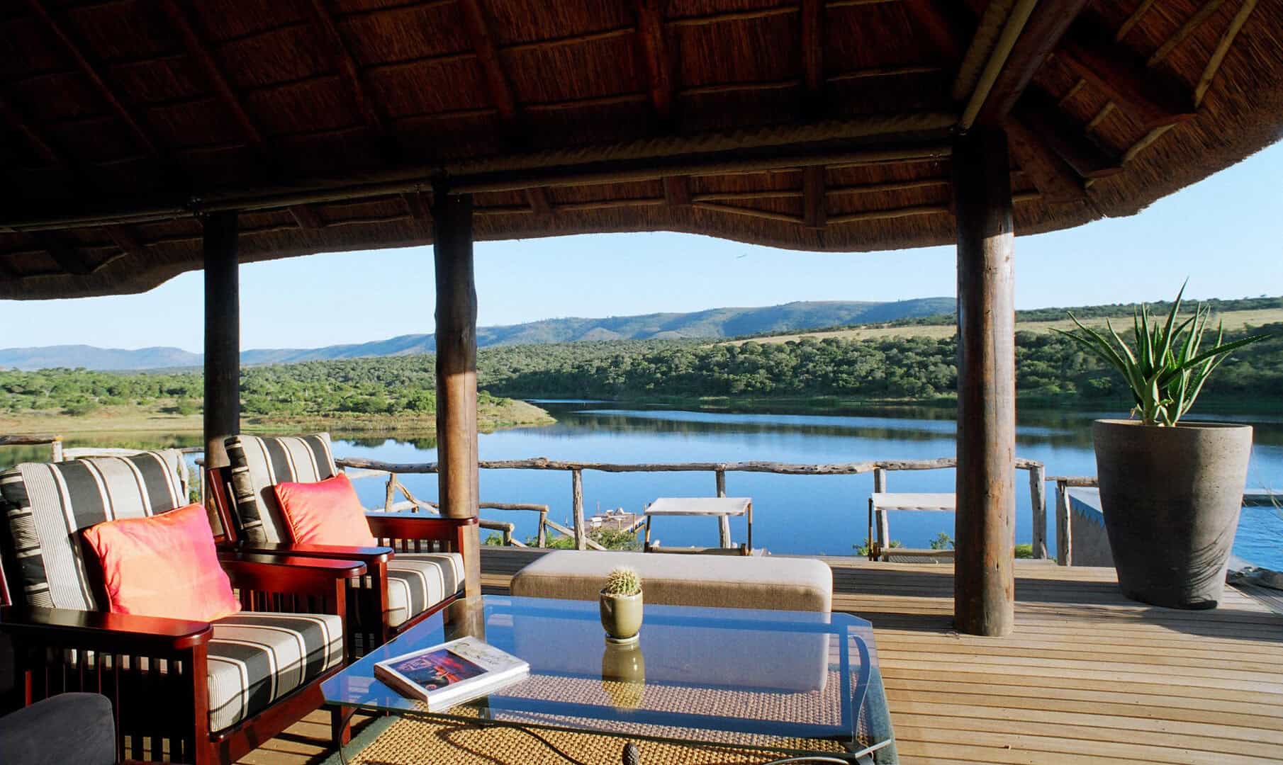 Water Lodge, set amongst dense bush veld overlooking Lake Kariega, offers 12 stone walled, thatched chalets leading off into meandering timber footpaths. All Chalets open onto private game viewing decks boasting plunge pools and outdoor showers. The indulgent bathrooms offer free-standing tubs and double basins, and each room is fitted with an earthenware fireplace