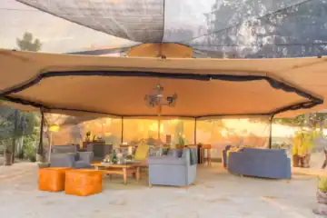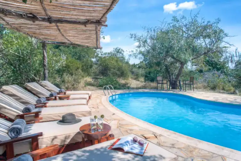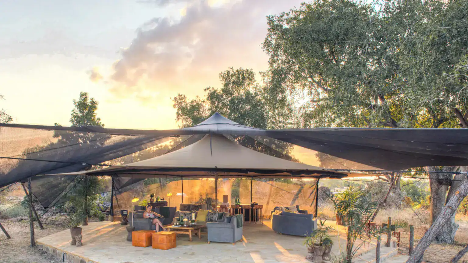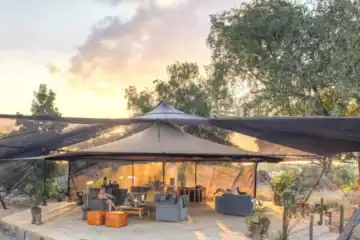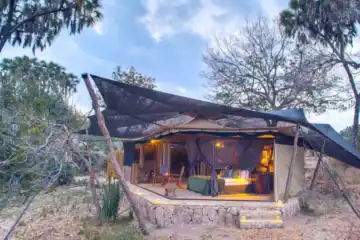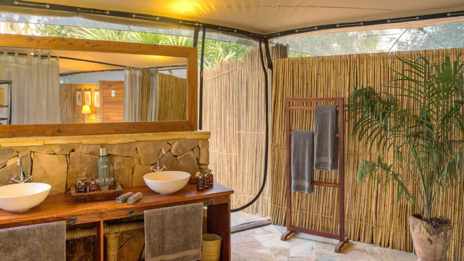 Communal areas include a lounge, bar, and dining tent set on stone bases under stretched canvas, flowing into shaded outdoor spaces. There is a swimming pool where you can cool off, WiFi in main areas, solar power backed by a generator, and a complimentary laundry service.