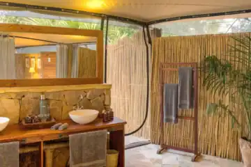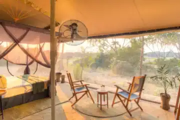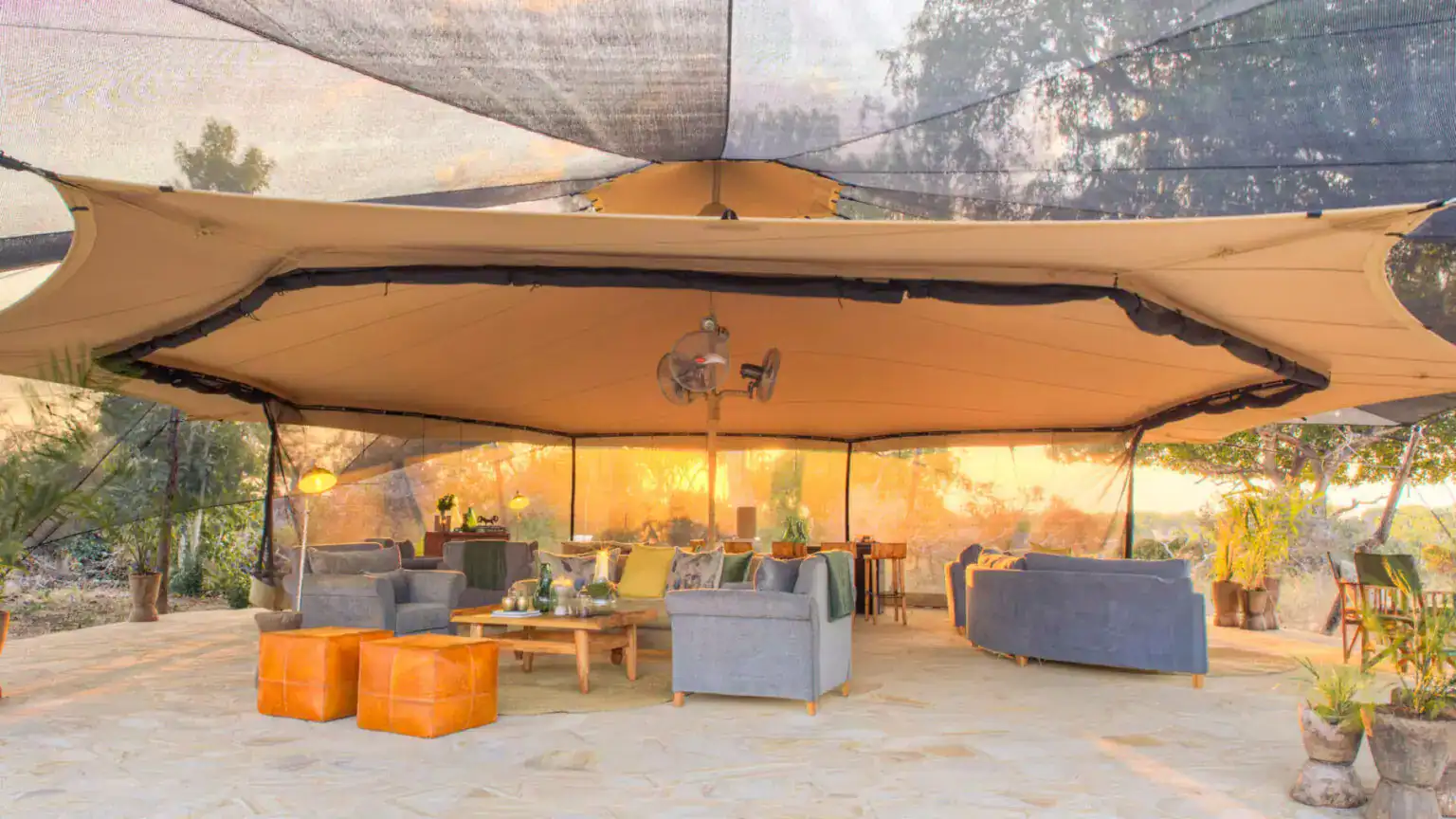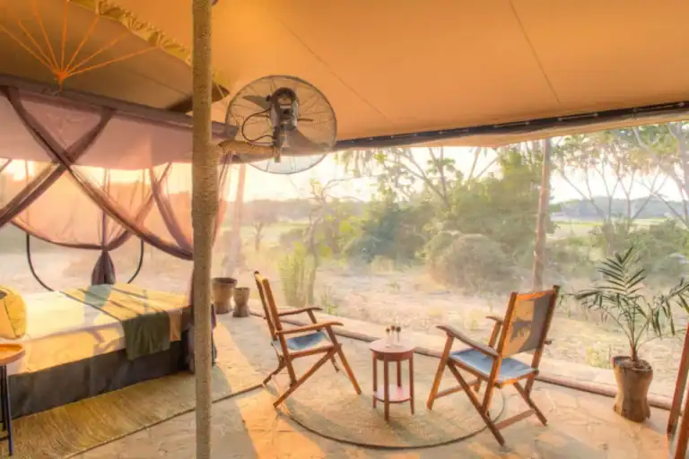 You’ll stay in one of eight canvas-tented suites, each tucked under trees with private verandas. The tents are spacious, built on stone-paved platforms, with en suite bathrooms featuring both indoor and outdoor showers. An ‘Evening Breeze’ cooling system above the bed and mesh-screened windows help you rest comfortably through warm nights.