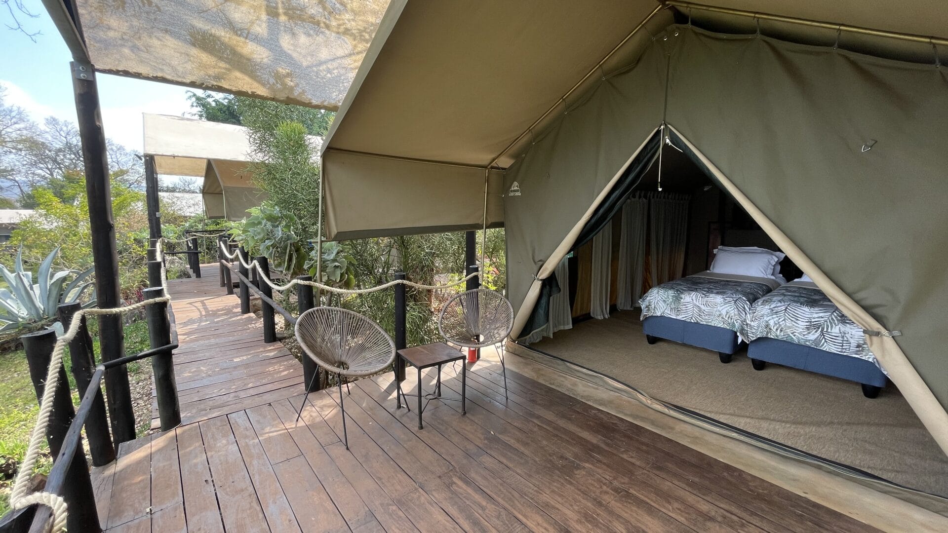Each of the six tents faces the lake, offering unobstructed views of spectacular sunsets from your private deck. The tents blend seamlessly into the landscape, surrounded by lush lawns and indigenous gardens that attract a variety of birdlife.