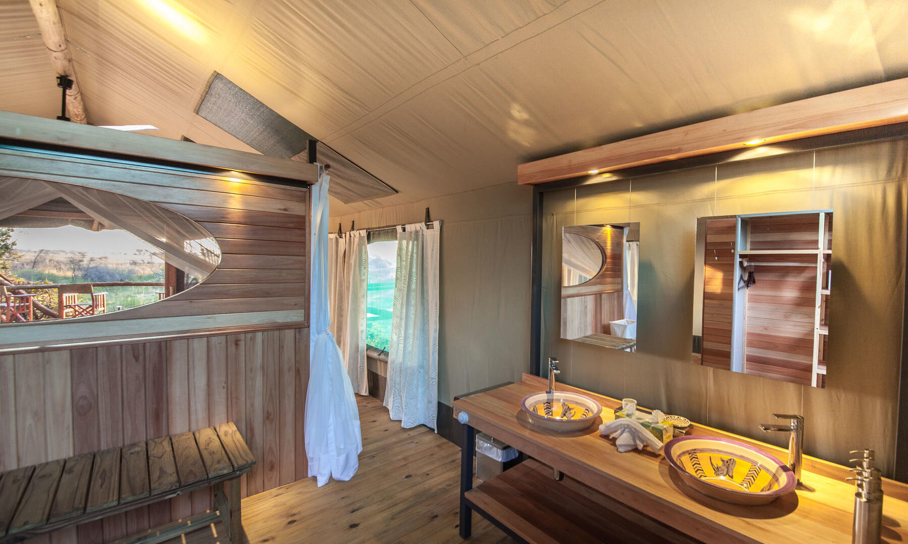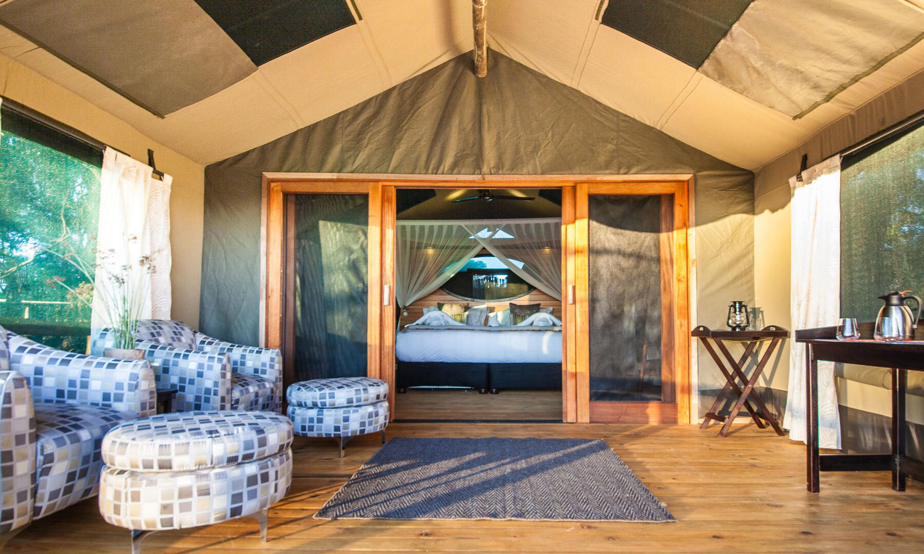 Adjacent to Moremi Game reserve on south eastern side of the Delta, overlooking the Gomoti River and its flood plains, the camps are located in a private concession of 67,000 acres and have been designed to embrace the natural surroundings of the riverine forest.