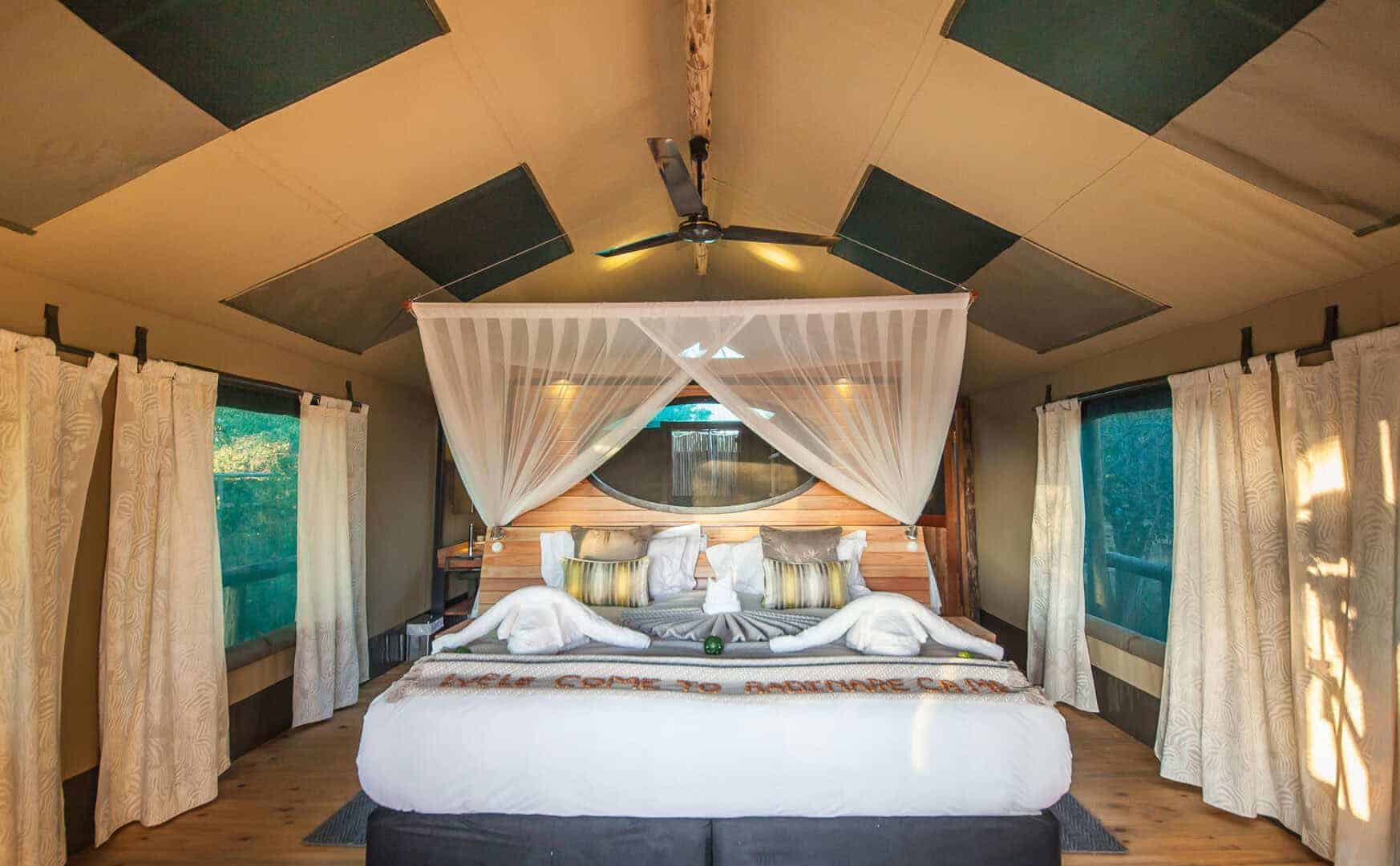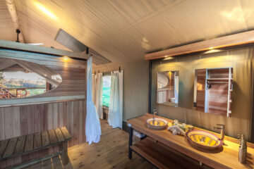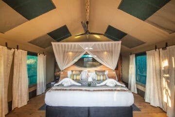 Adjacent to Moremi Game reserve on south eastern side of the Delta, overlooking the Gomoti River and its flood plains, the camps are located in a private concession of 67,000 acres and have been designed to embrace the natural surroundings of the riverine forest.