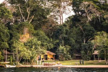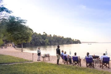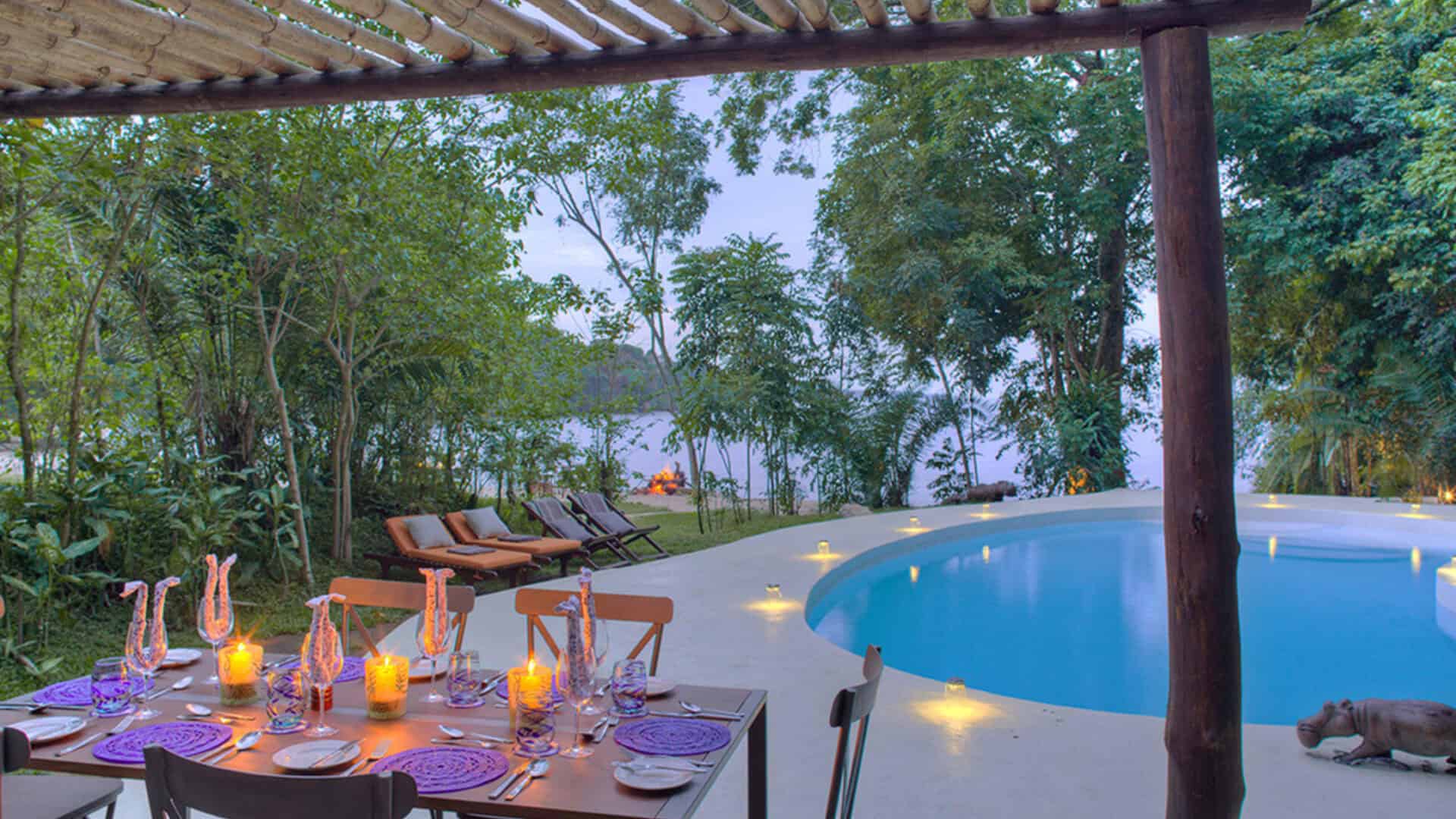 The camp features just eight lakefront chalets, designed with a light footprint and natural materials to blend into the surroundings. From your private deck, you can look across the water while listening to hippos grunting offshore or spotting brightly coloured birds flitting through the trees. A swimming pool and open-air dining areas provide restful spaces between activities.