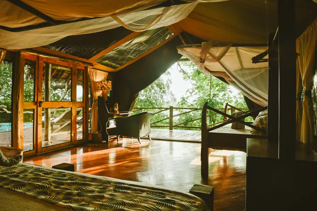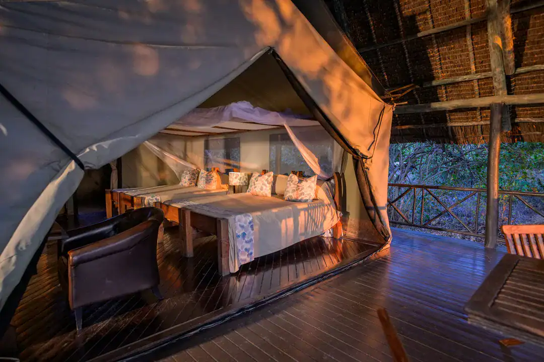 Settle into one of 11 classic, spacious tented accommodations or opt for a multi-room family suite. Each unit is pitched on a raised wooden platform and secured beneath a vast, cool thatched roof, offering an authentic safari feeling. The generous family suites are the perfect option for families, featuring a private plunge pool on your viewing deck.