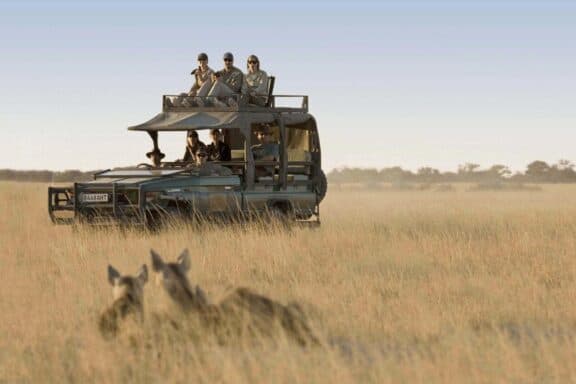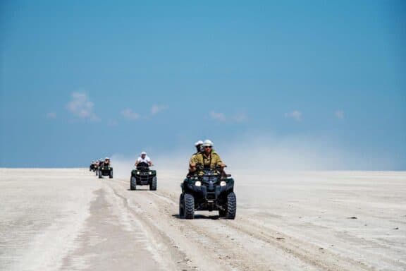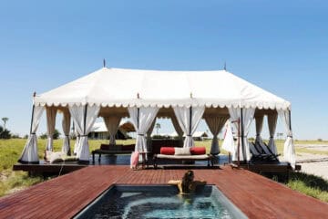 San Camp is open only for 6 months of the year during the dry season (16th of April to 15th of October).You are encouraged to go quad biking across the lunar expanse of the pans, lie out on the pans as the sun sets watching the planetarium show unfold with horizon-to-horizon stars. Get unbelievably up close and personal with meerkats; spend time walking and interacting with a group of Zu/’hoasi Bushmen to gain insight into their ancient culture; game drive to experience unique desert wildlife. You can visit Fallen Baobab, campsite of Livingstone & Selous and one of the three largest and oldest trees in Africa. Relax into the solitude of your environment under canopy of the yoga pavilion.
