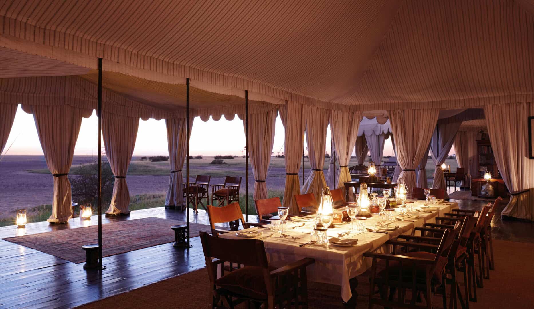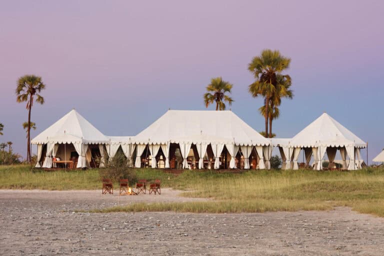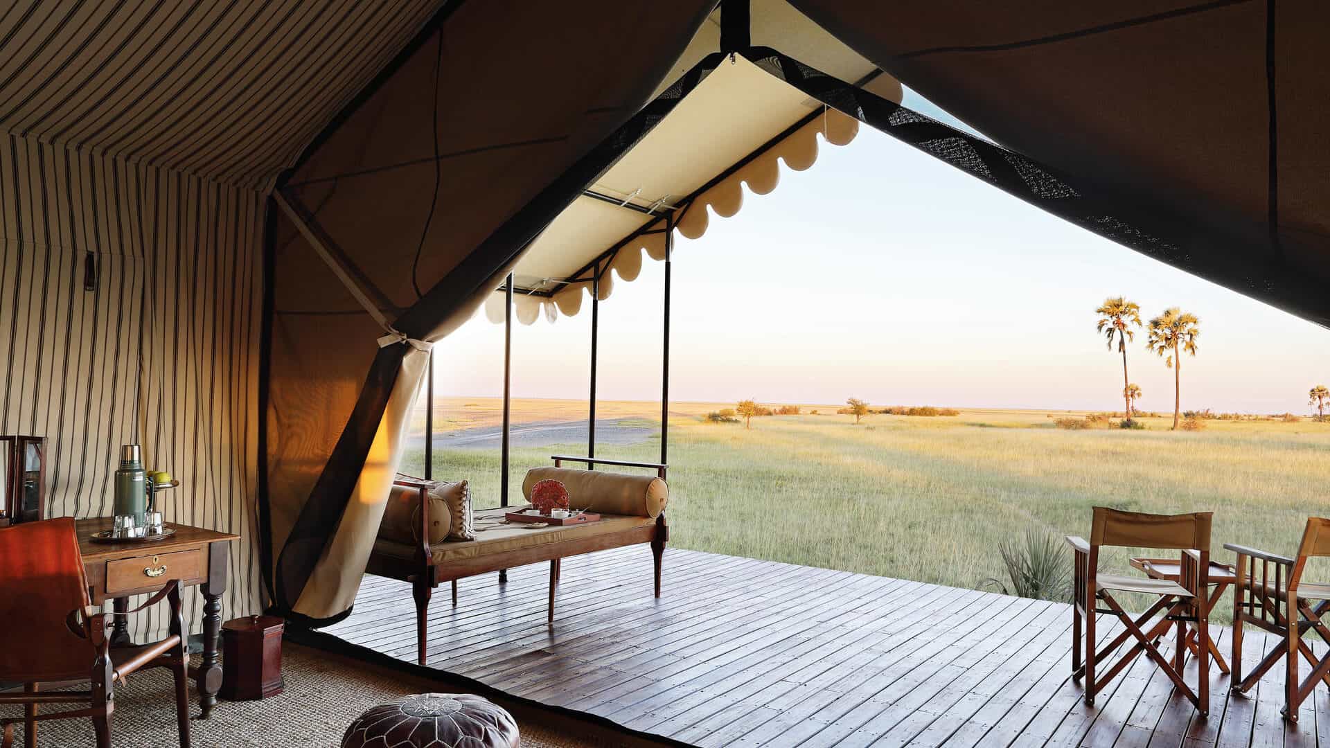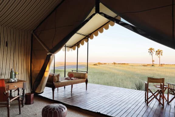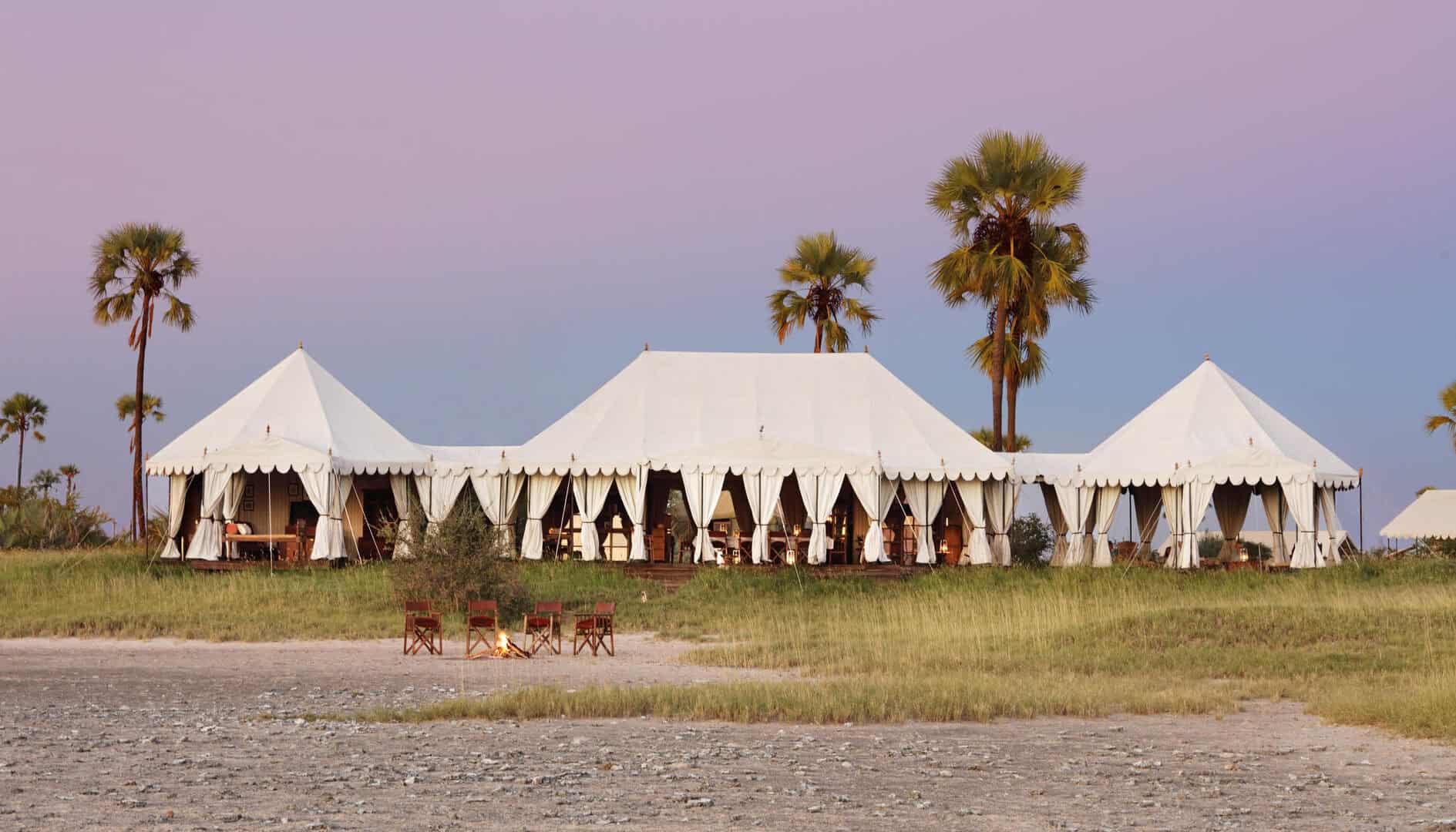 Classic white tents perched on the shore of an enormous sparkling salt pan, each sheltered by a cluster of stately desert palms. Spectacular vistas, soothing and serene – pared down safari elegance with minimal ecological impact, it is the nothingness that attracts. San Camp runs almost entirely on solar energy, thus dramatically reducing the use of fossil fuels. The perfect place to relax, unwind and retreat.
