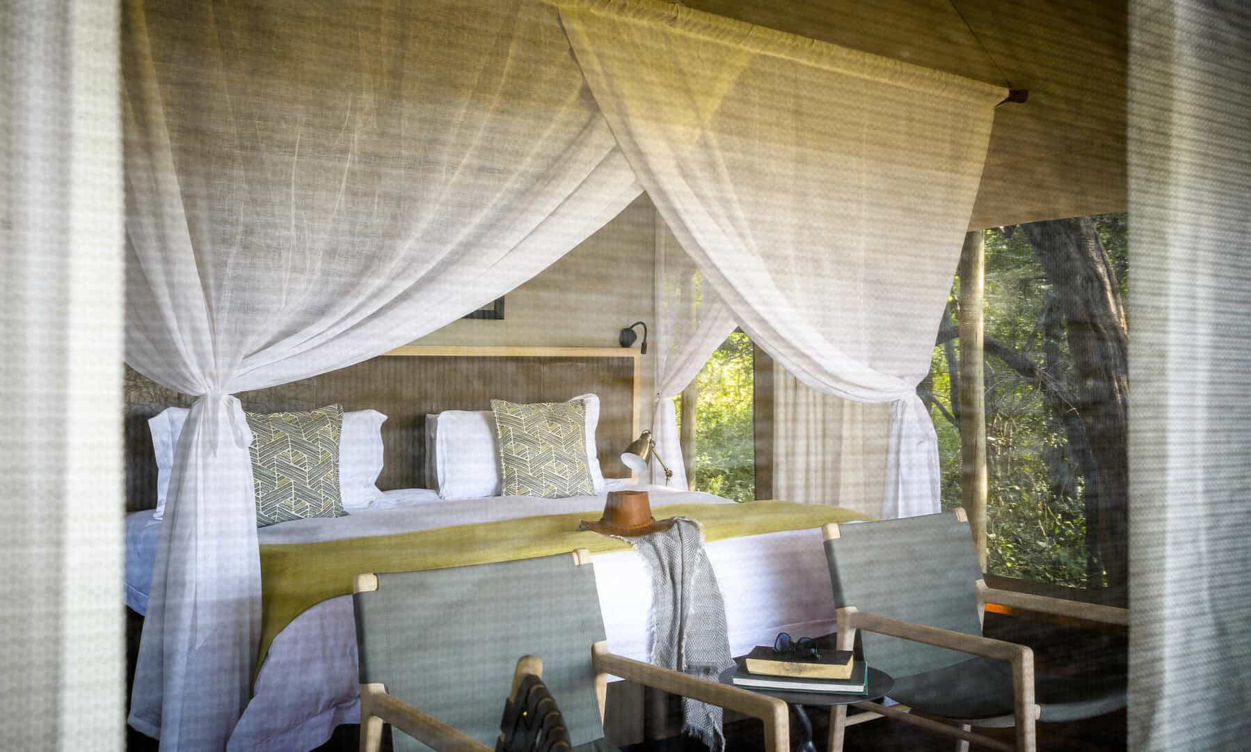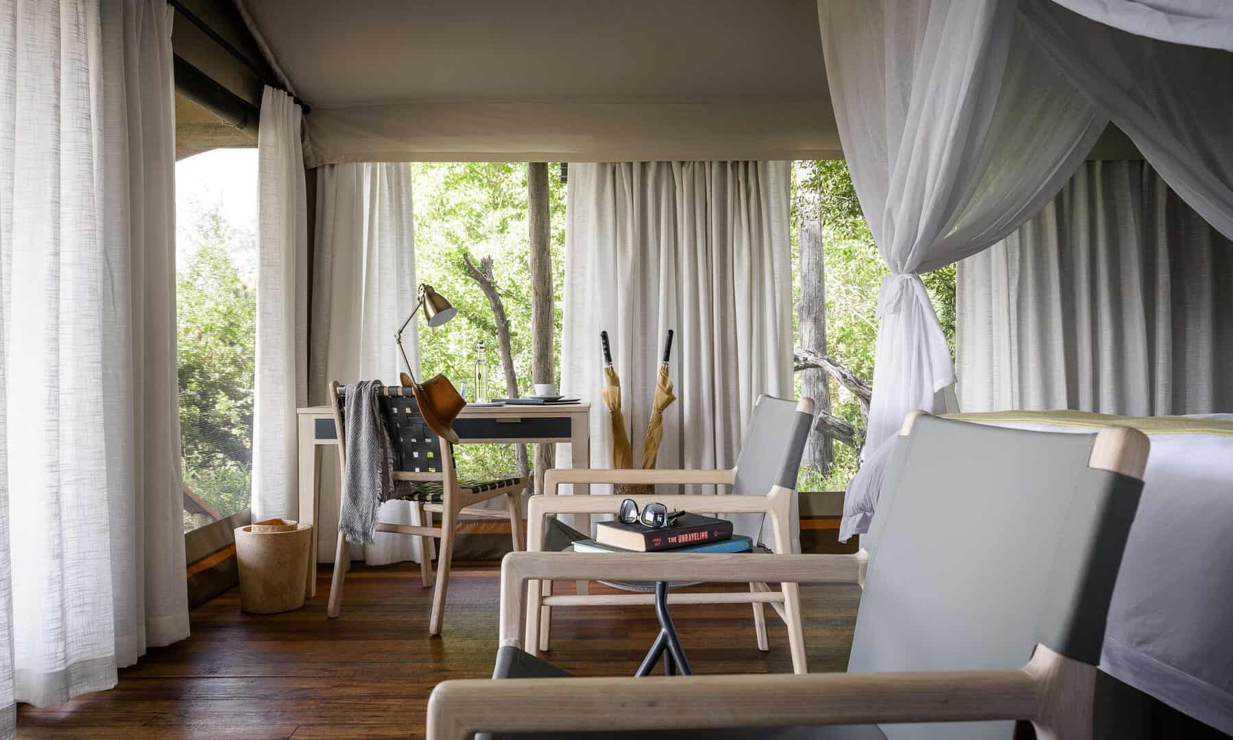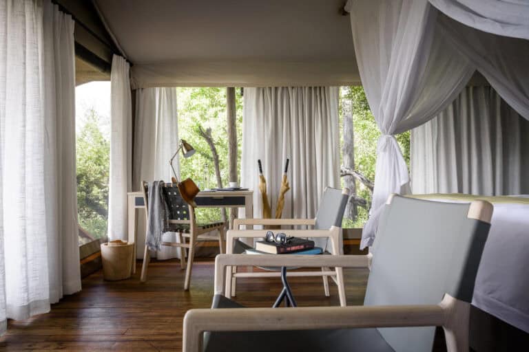 Shaded by ebony and kigelia trees, each villa features a private deck overlooking the floodplain, offering front-row seats to nature’s endless parade. The camp seamlessly blends classic safari elements with modern comforts, incorporating local artisanal touches like woven basket lights and original artwork while maintaining a minimal environmental footprint.
