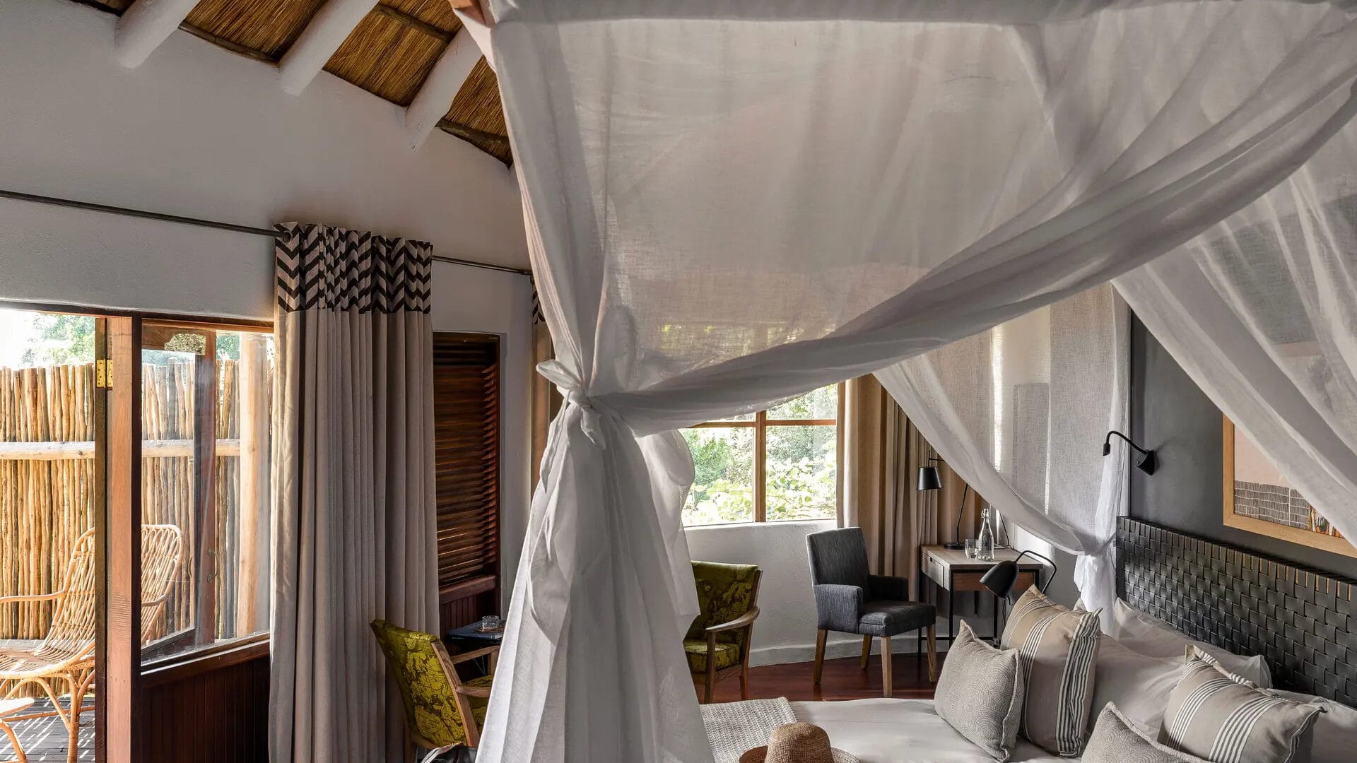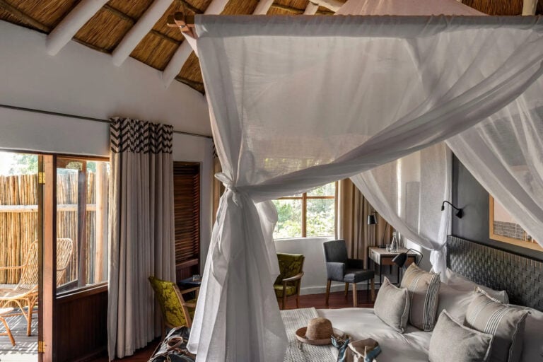 The air, filled with the distant roar of the world’s largest curtain of falling water, the lodge combines classic safari elegance with contemporary comfort, featuring elevated wooden structures adorned with exposed timber, soaring ceilings, and local Zambian flourishes.