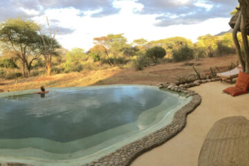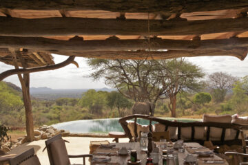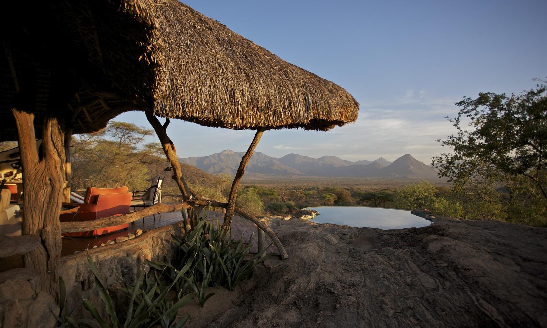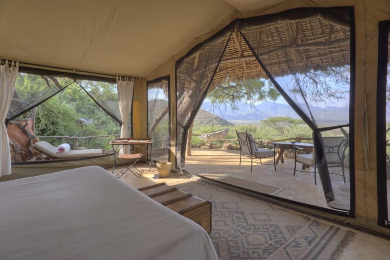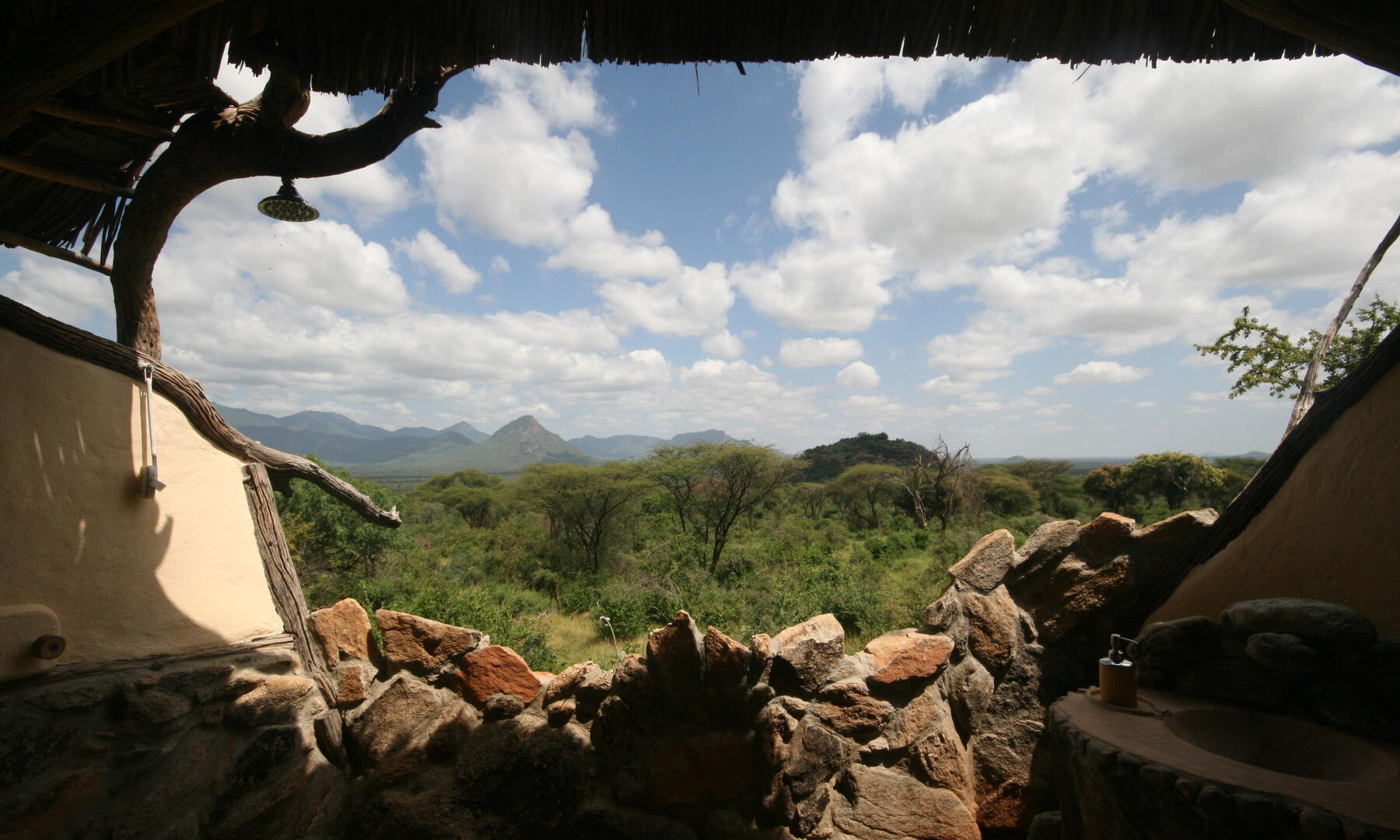 Sarara has six luxury tents, each positioned to maximize the stunning views of the Mathews Range of mountains and the animal watering hole. The tents are spacious and high-ceilinged, with plenty of cupboard space, electric lighting, and 24-hour hot and cold running water.