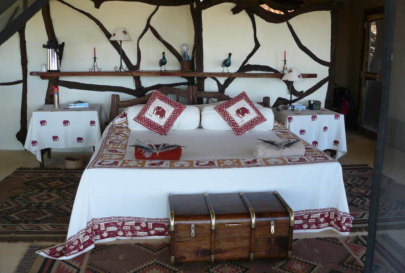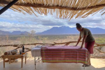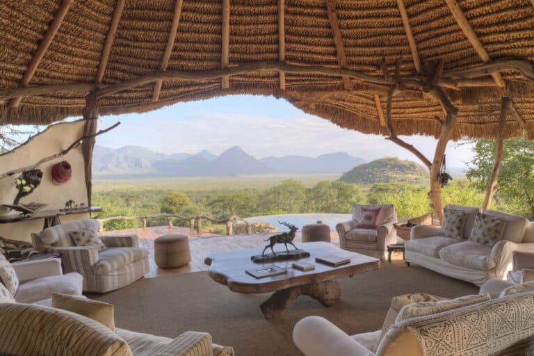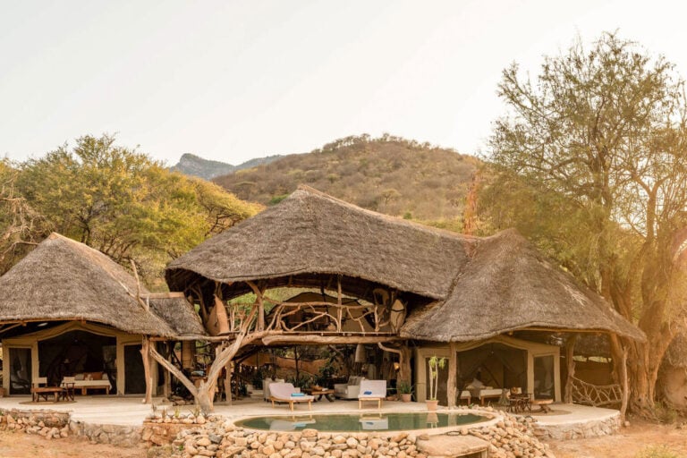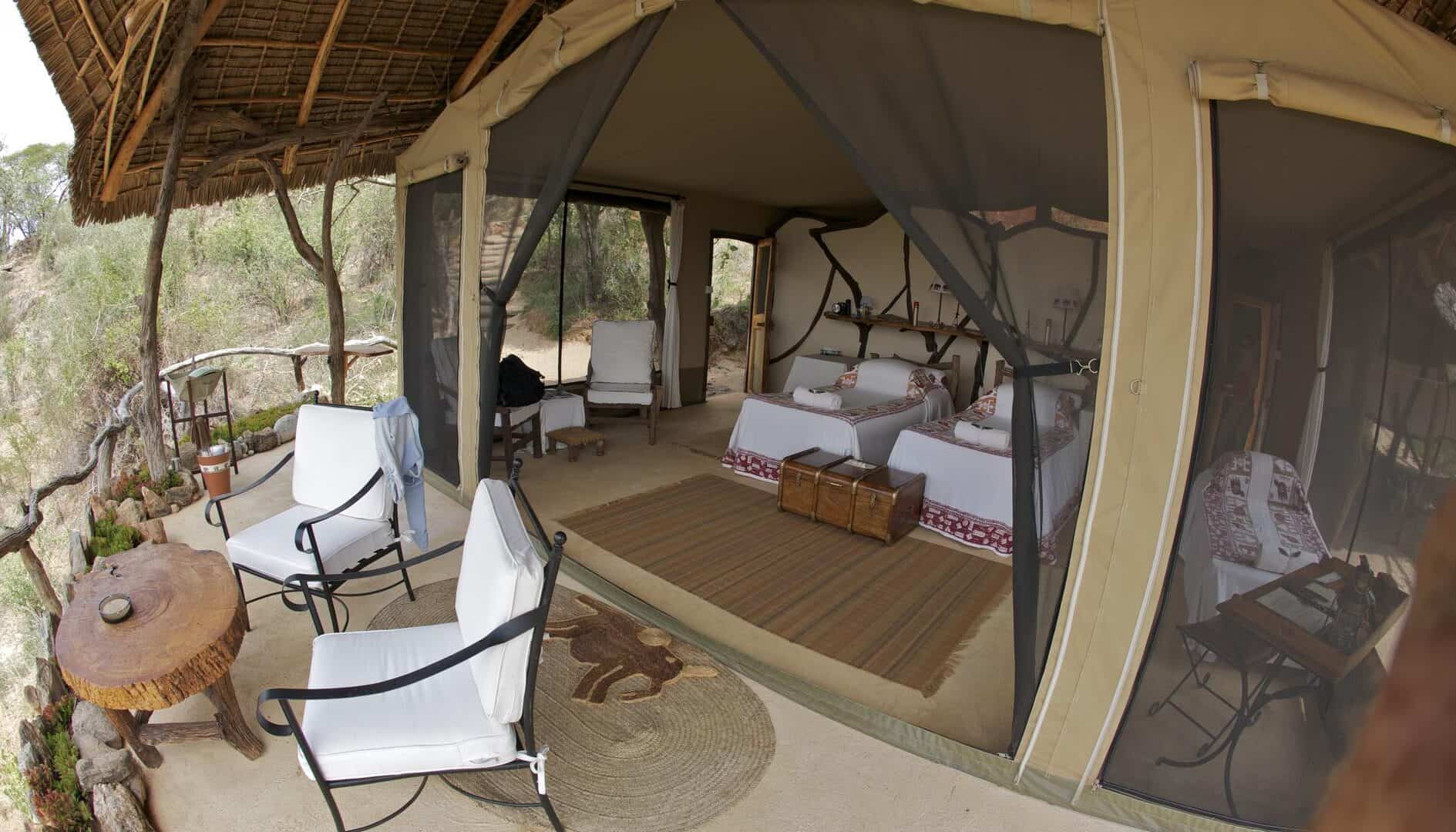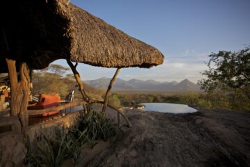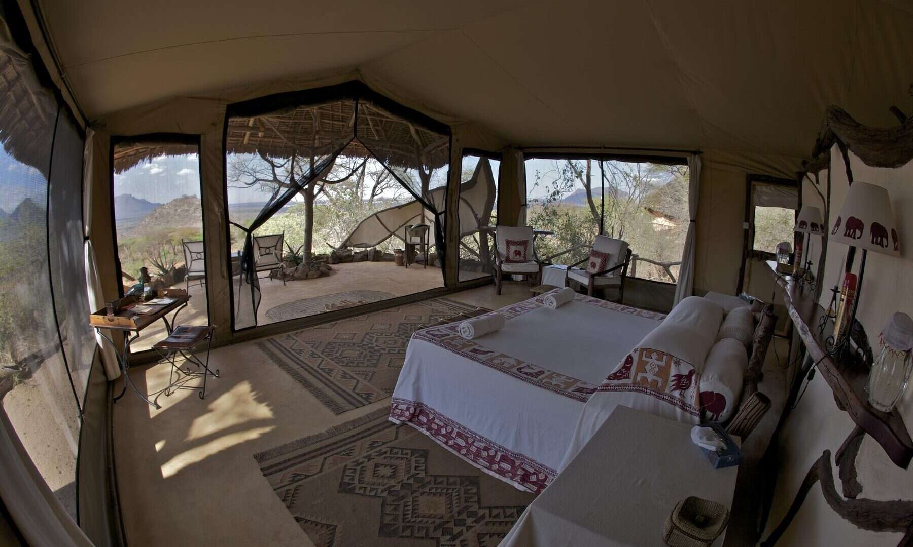 Sarara has six luxury tents, each positioned to maximize the stunning views of the Mathews Range of mountains and the animal watering hole. The tents are spacious and high-ceilinged, with plenty of cupboard space, electric lighting, and 24-hour hot and cold running water.