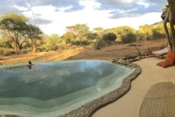 Sarara has an infinity pool up on the cliff overlooking the animals below. The camp is powered by solar energy generated by several sets of solar panels. The emphasis at Sarara is on walking safaris or walking with camels, but game drives are also available.