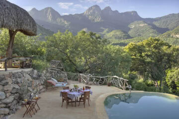 It features 8 tents built on platforms within the tree canopy, providing you with a distinctive view of wildlife roaming below. A main mass area and swimming pool command incredible views of Mount Uarges, one of the seven sacred mountains to the Samburu.