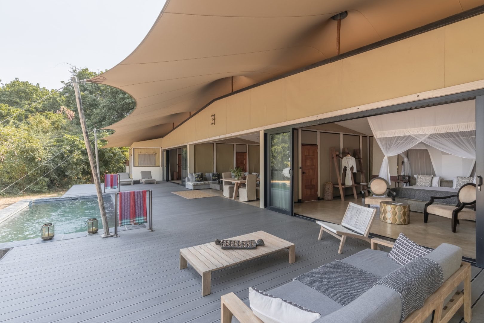 With a maximum of 18 guests accommodated in 7 luxury suites consist of lounge & dining areas, large deck and private plunge pool. The Kigelia family tent is made up of 2 en-suite bedrooms joined together by an open plan dining and lounge area with its own private plunge pool.