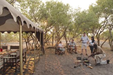 The guest areas comprise comfortable tents for dining, meeting for a pre-dinner drink or just whiling the time away between game drives. Welcoming camp staff serve delicious meals cooked over the glowing coals.