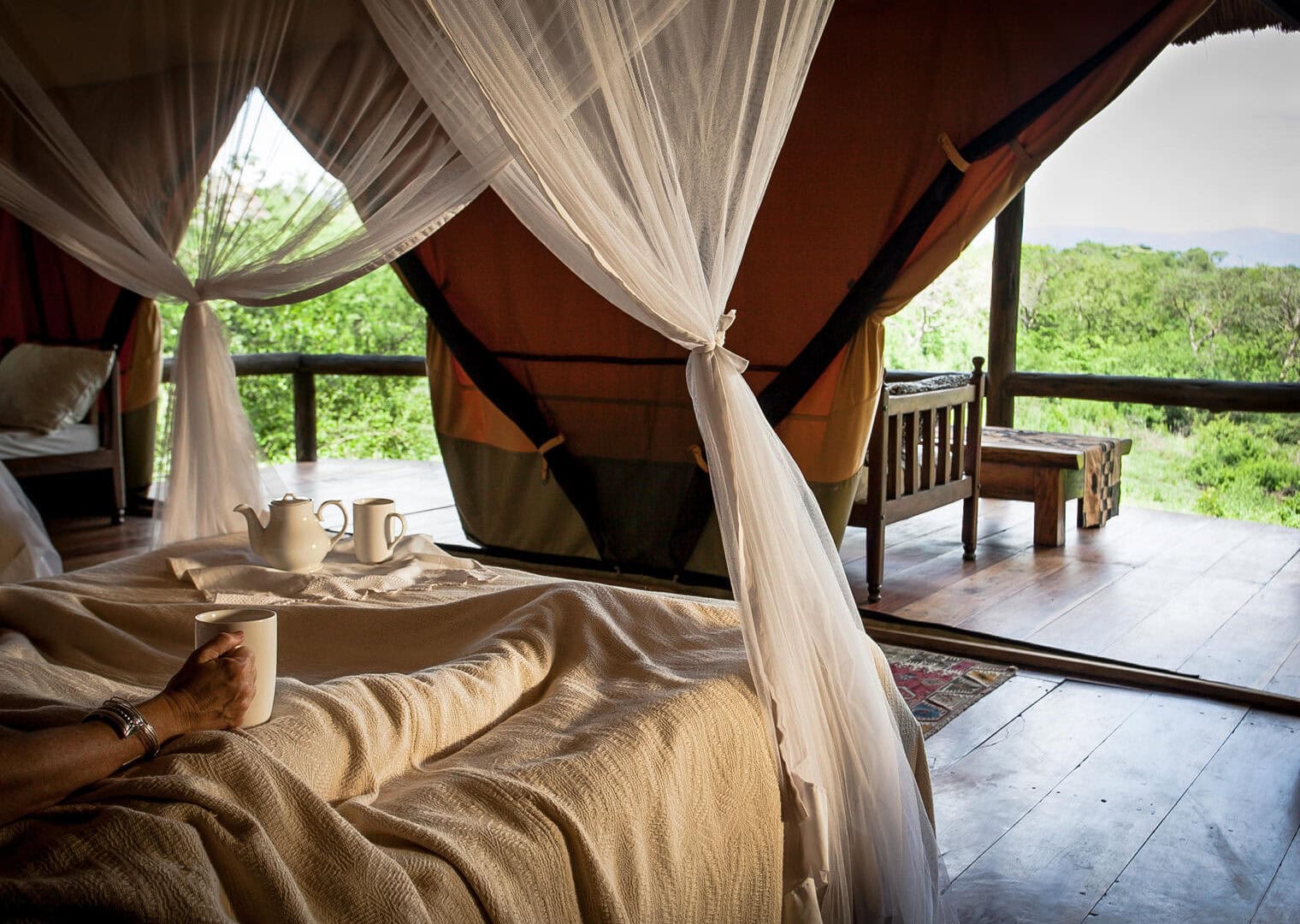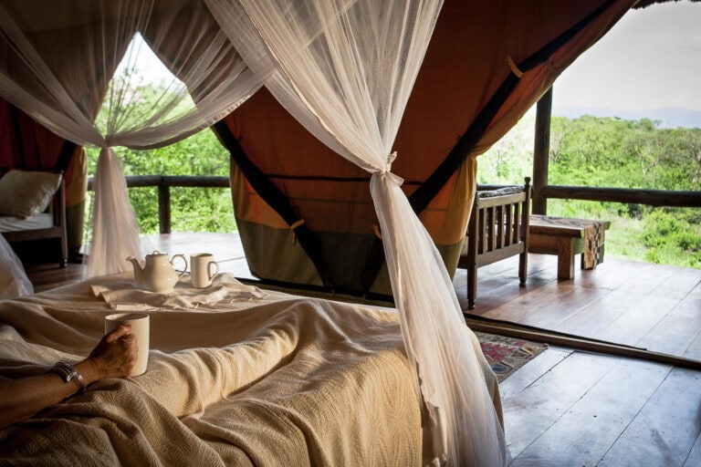 Stay in golden-hued tents with gleaming hardwood floors. Staying under canvas is one of the most romantic and exciting things to do in on safari in Africa. You hear the sounds, you feel the wind, you smell the rain before it comes. But this isn’t roughing it either: the tents are protected by a thick thatch roof and feature en-suite bathrooms with running water, hot showers and flush toilets.