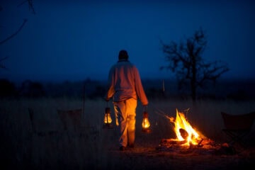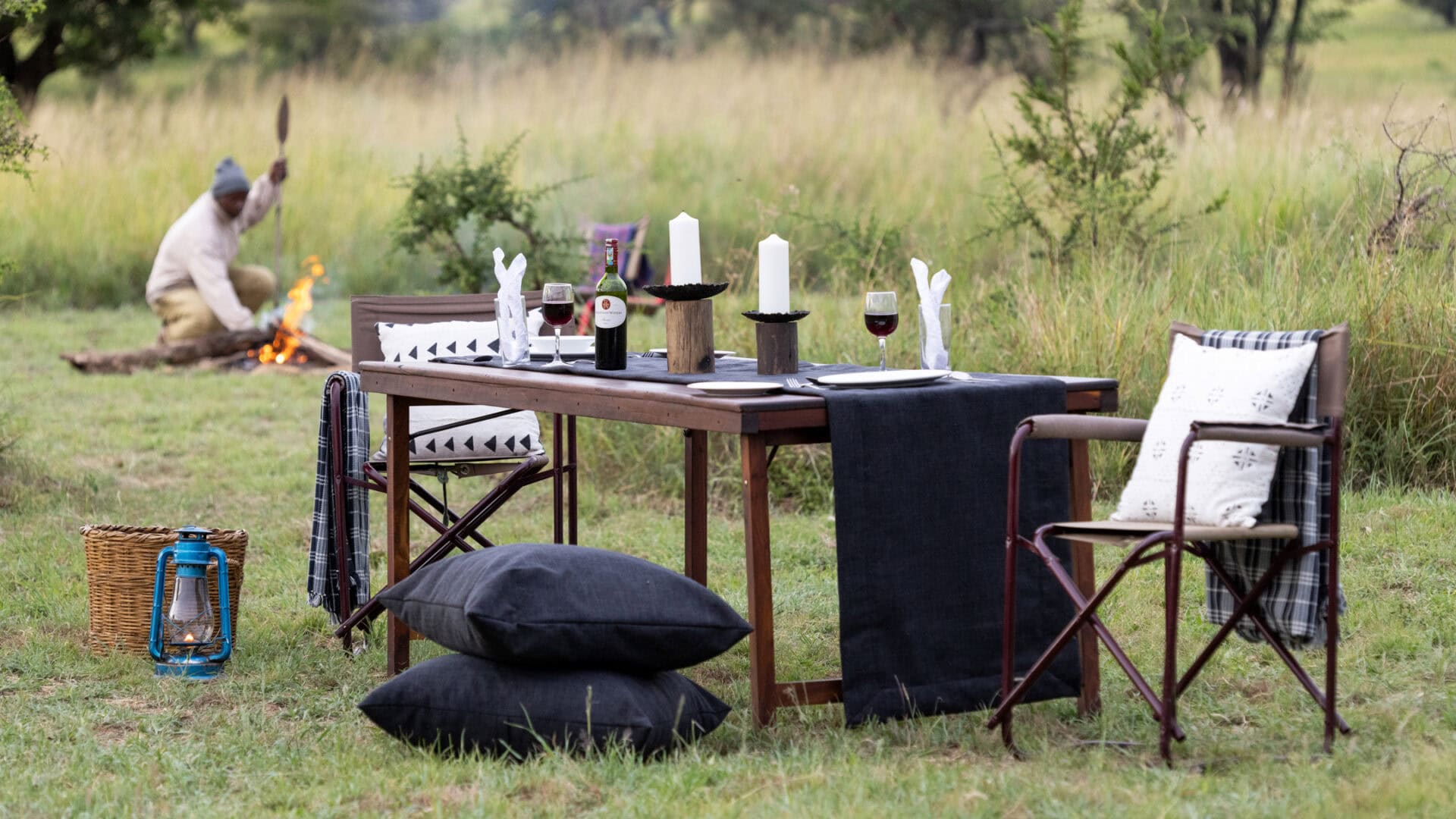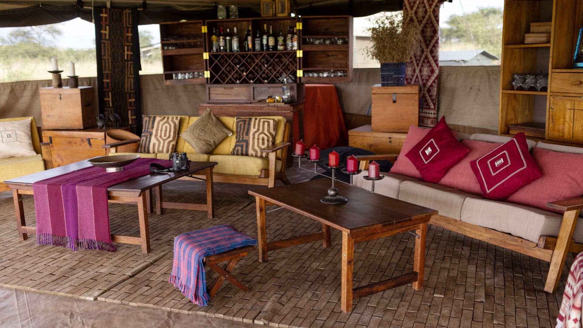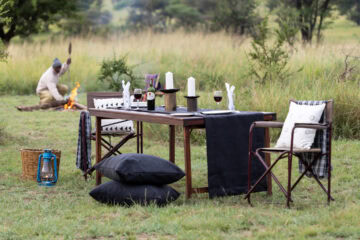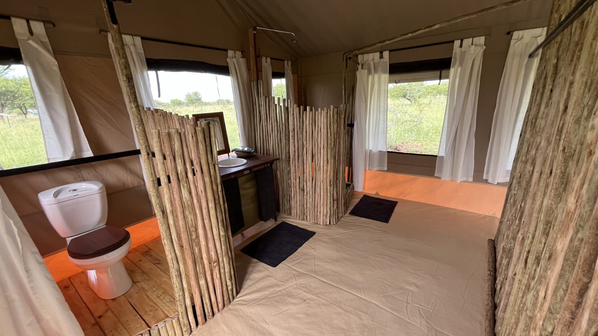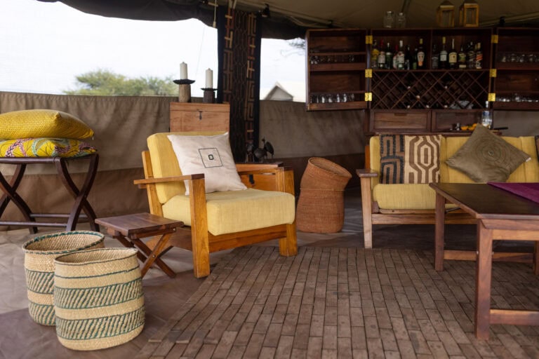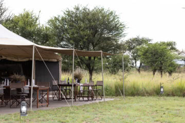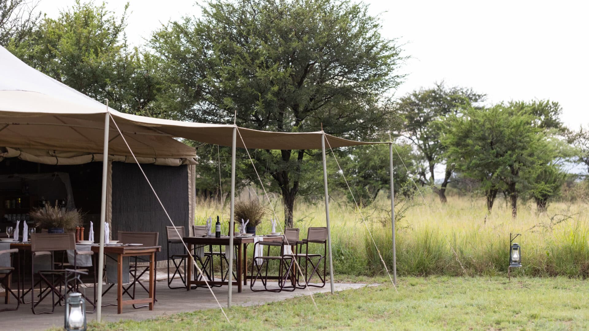 Each tent includes a large en-suite bathroom with a flush toilet, gravity-fed hot shower, and basin with vanity. Unwind on your private verandah, an ideal spot for watching the passing wildlife. A family tent is also available, suitable for families with young children aged six years and above. The camp also features a dining tent where you can enjoy sumptuous meals , a sociable lounge tent with a well-stocked bar and a small reference library , and a cosy campfire for evening sundowners and snacks.