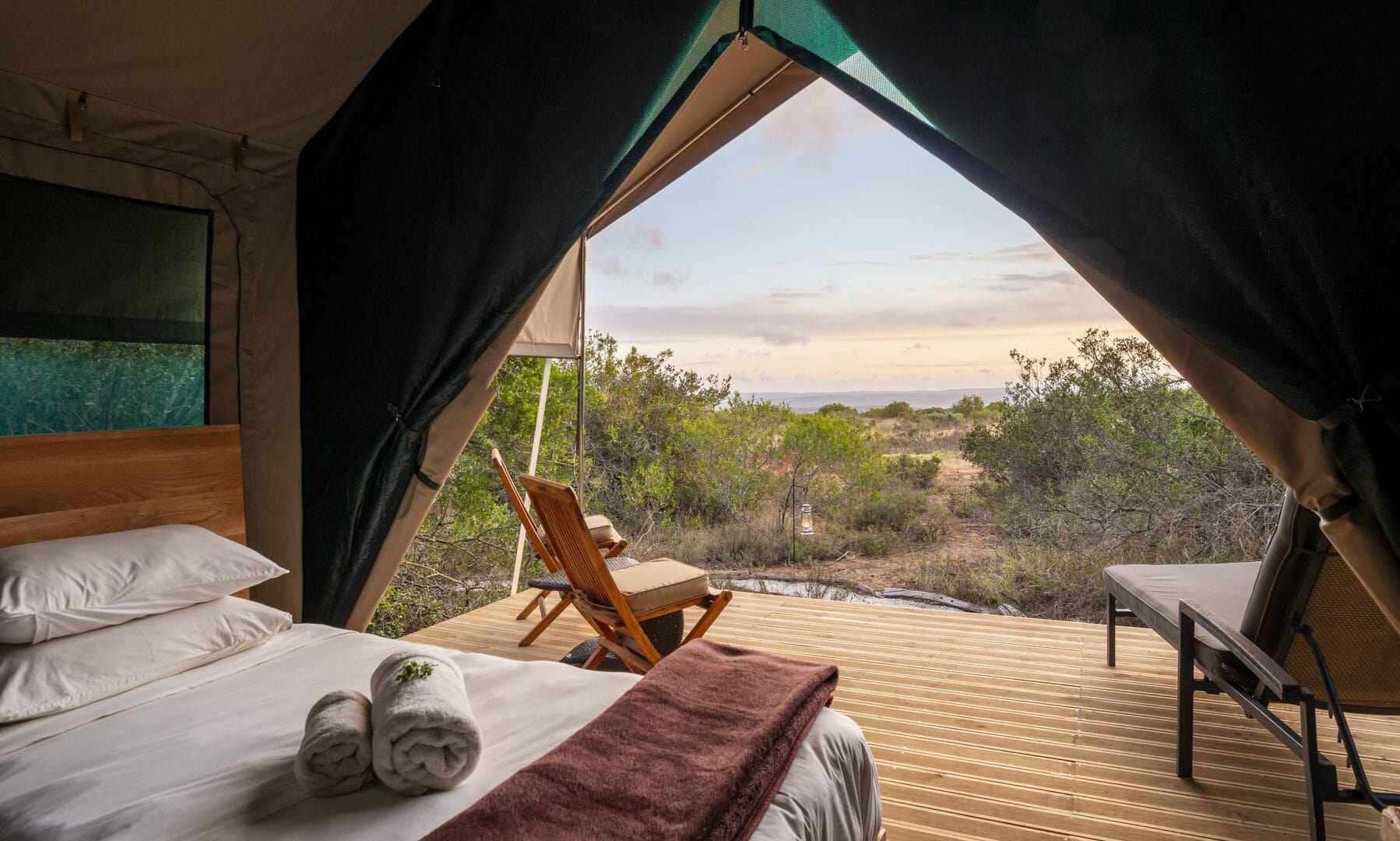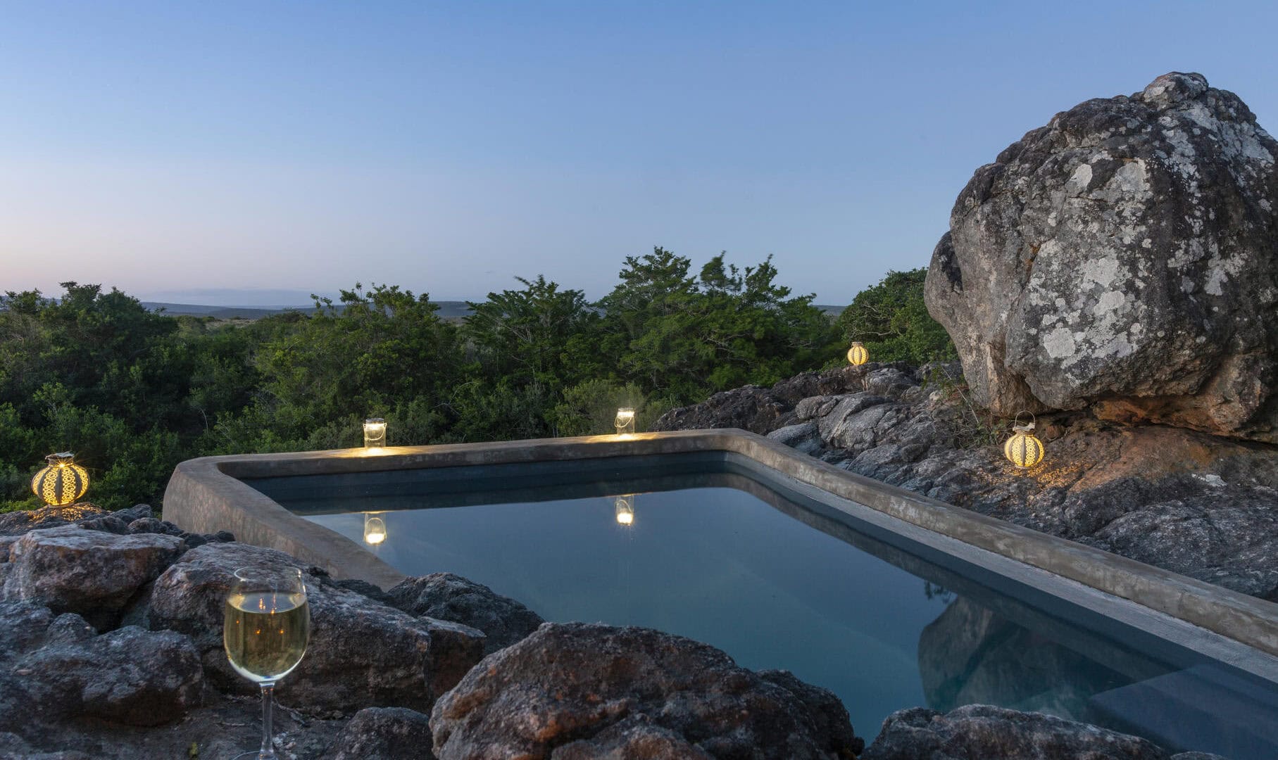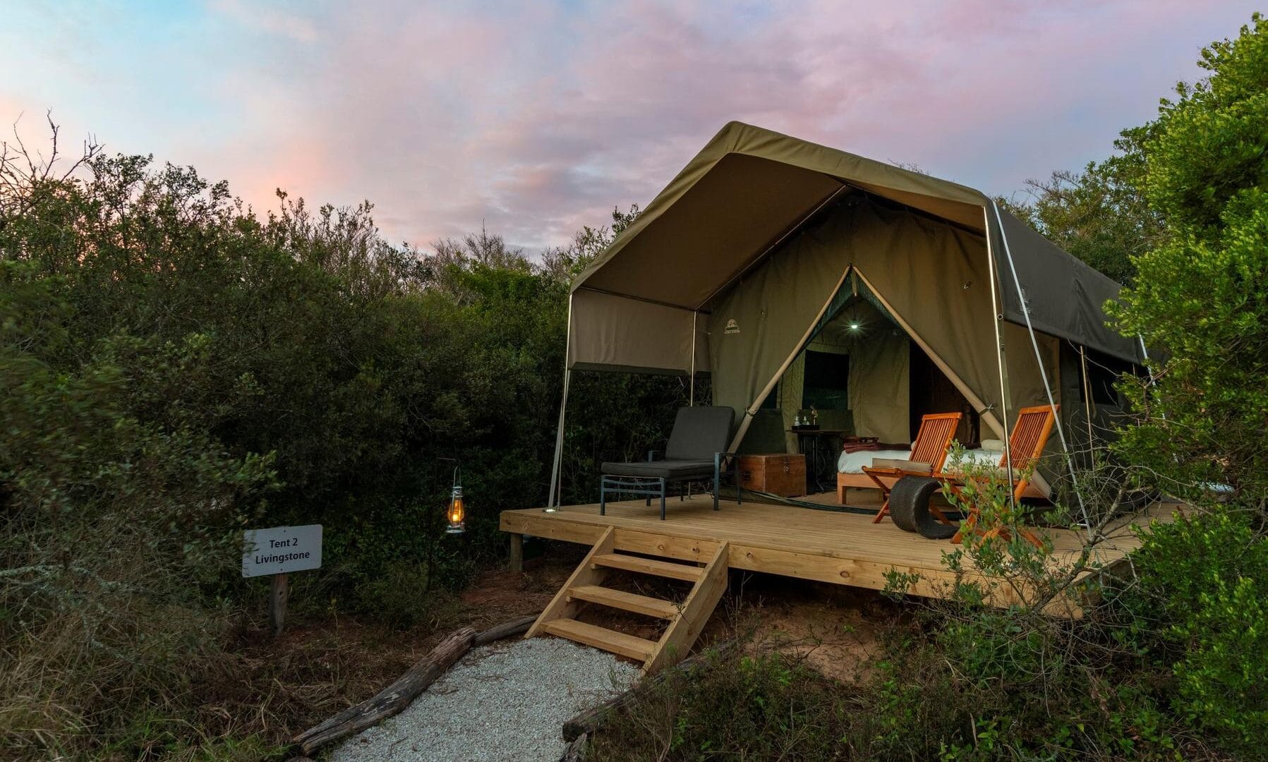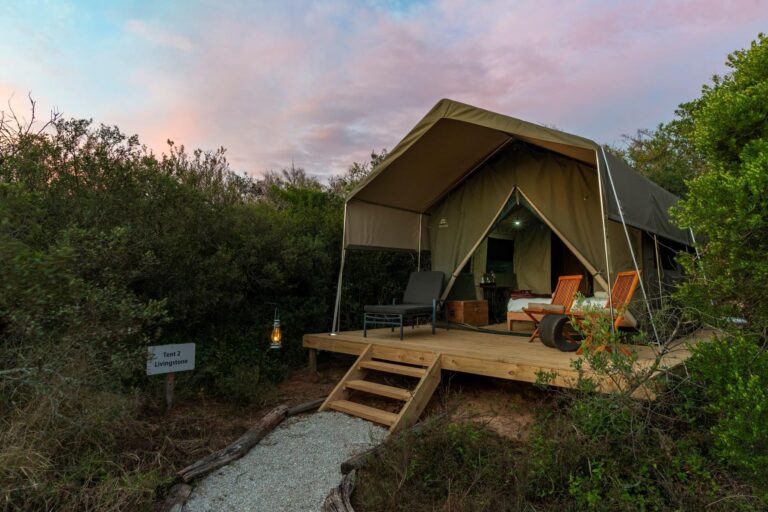 Situated within the Shamwari Private Game Reserve in the Eastern Cape, Explorer Camp captures the essence of a traditional safari with its intimate setting. This small, exclusive camp features canvas tents on a plateau amidst natural sandstone formations.
