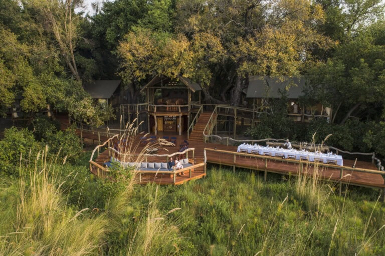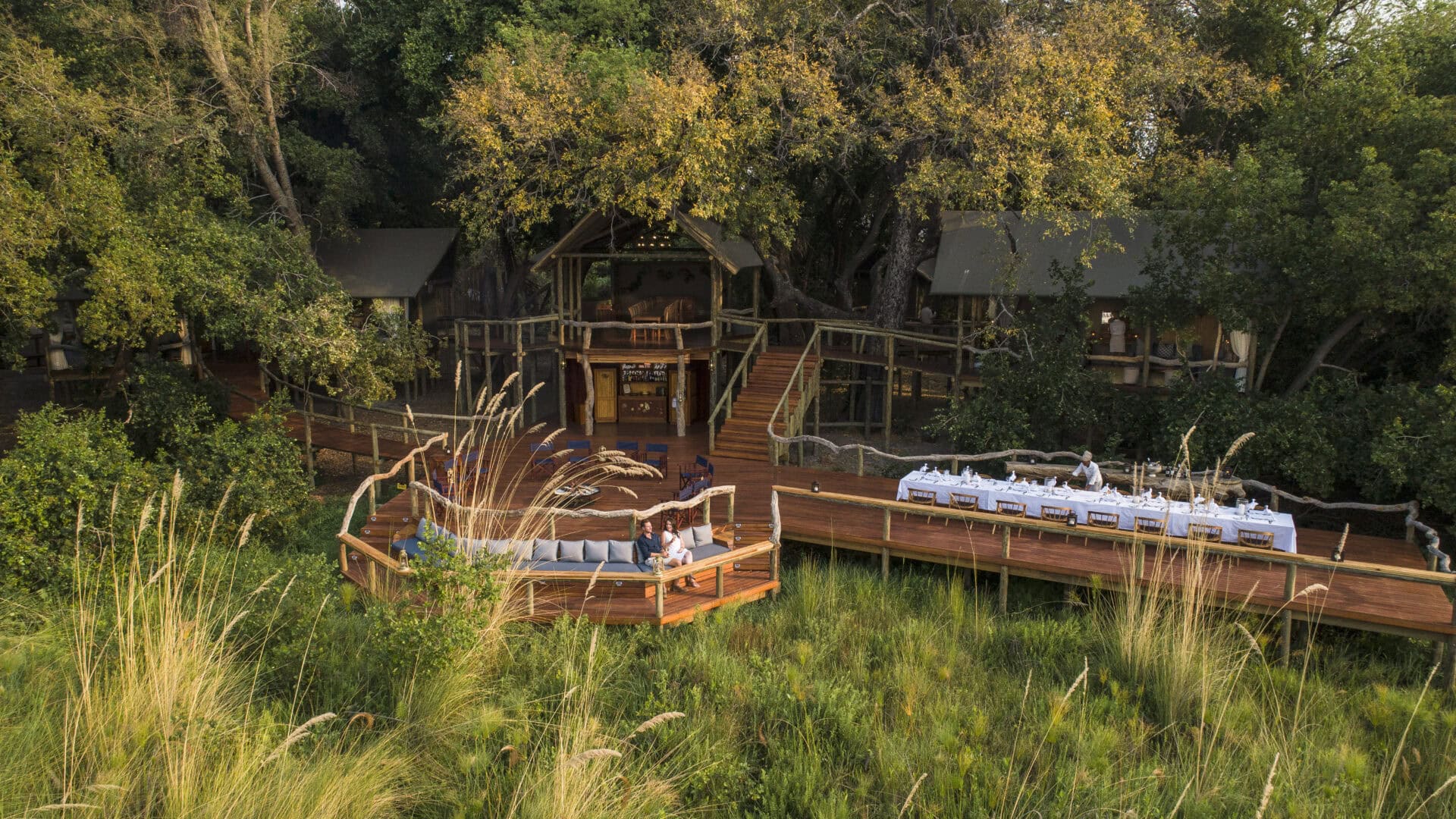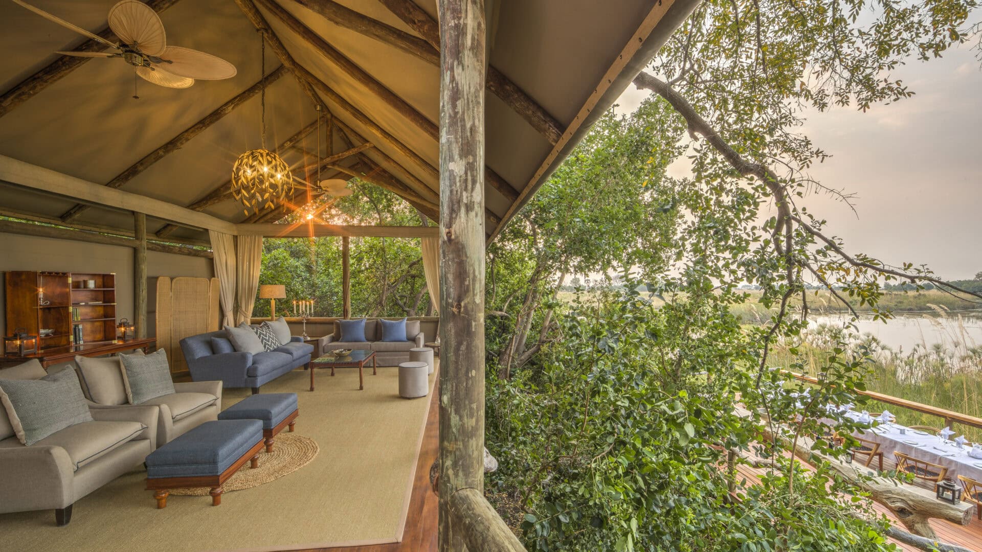 The camps unique main area comprises of a multi-tiered dining room and lounge which is set under canvas under the shade of ebony and mangosteen trees.