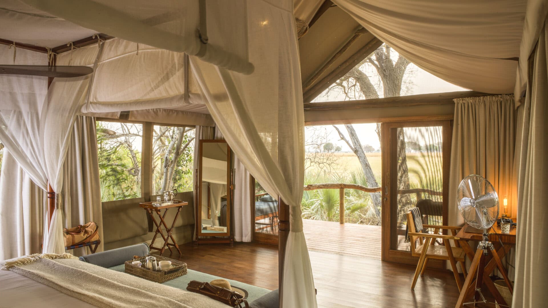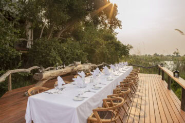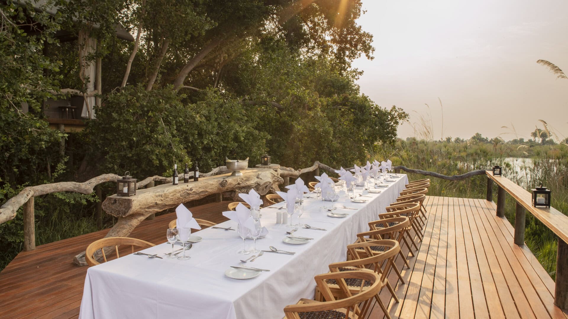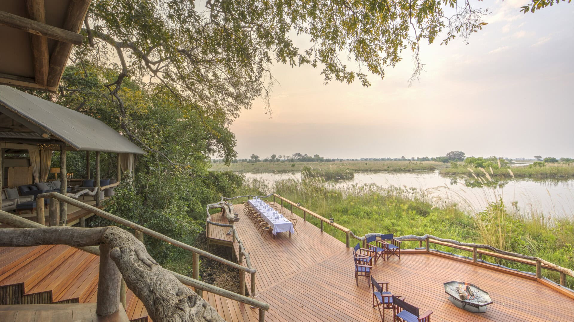 The camps unique main area comprises of a multi-tiered dining room and lounge which is set under canvas under the shade of ebony and mangosteen trees.