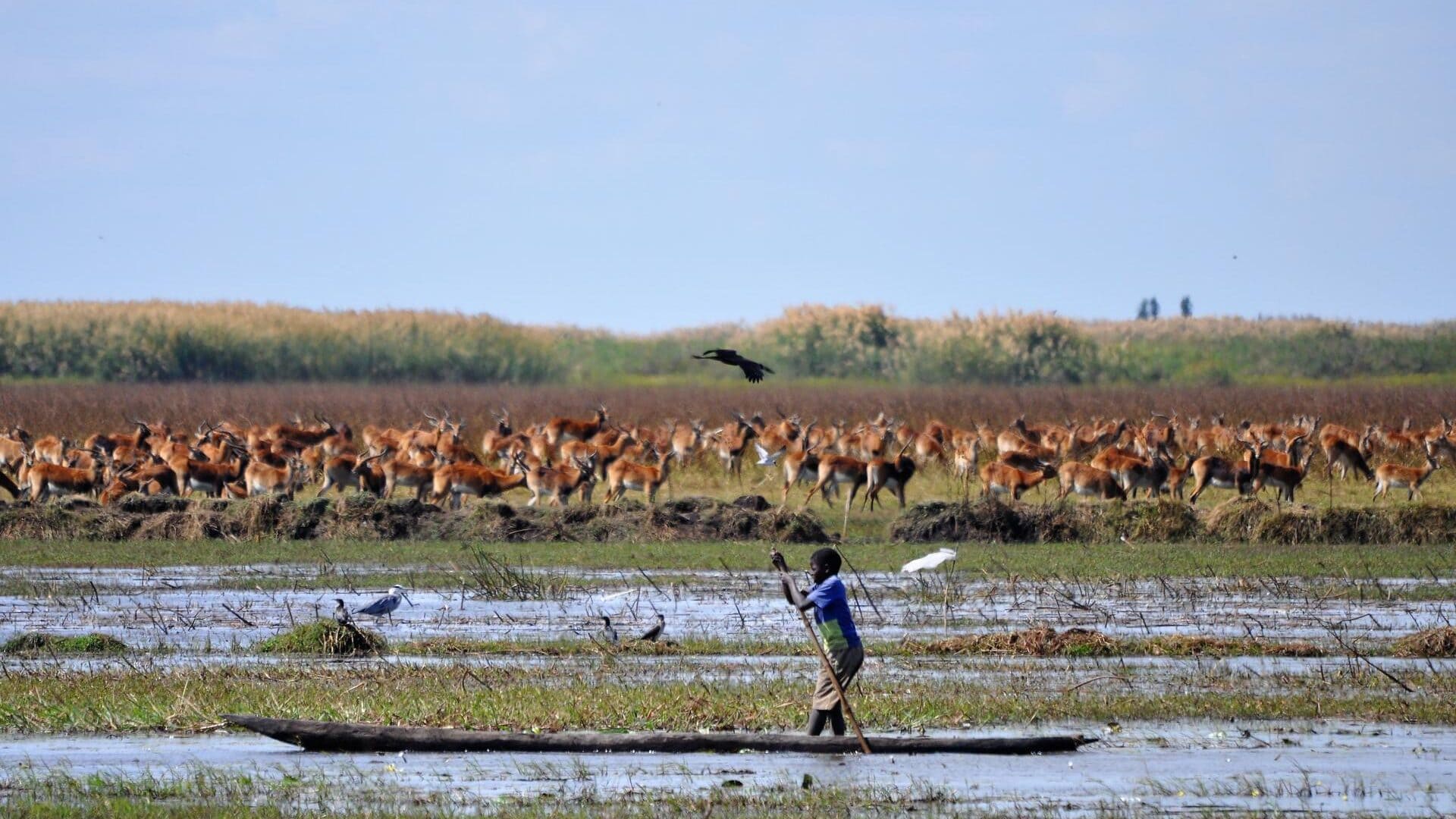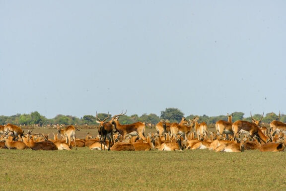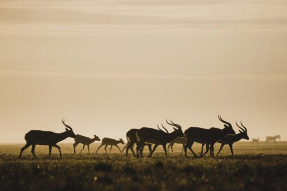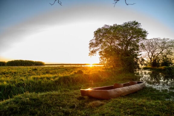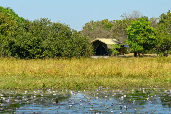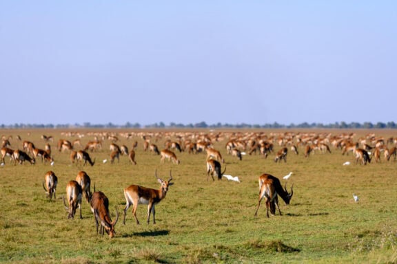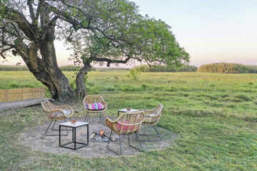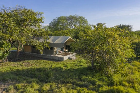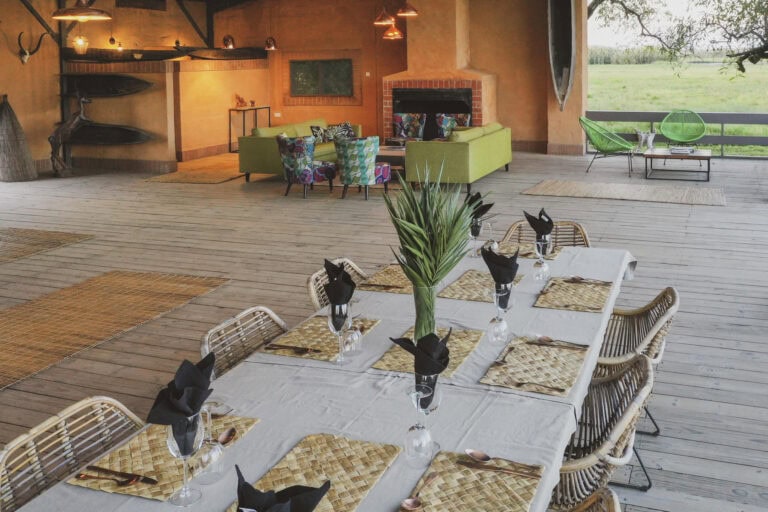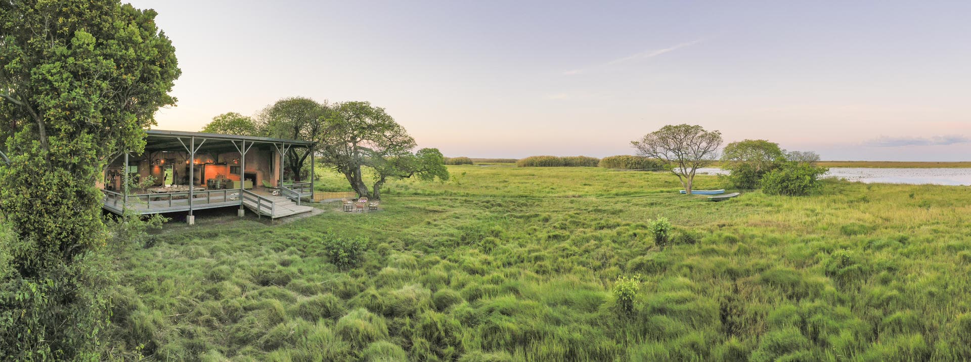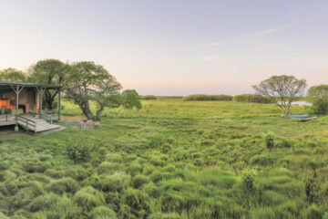 Nestled in a grove of trees on the high flood line of Bangweulu wetland, Shoebill Island Camp’s main area opens onto the vast plains filled with black lechwe and flocks of diverse water birds.