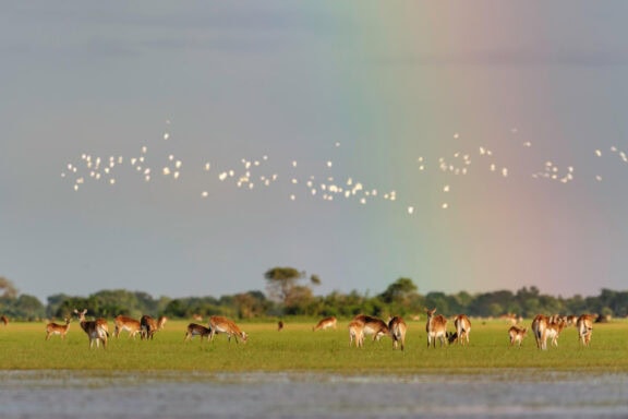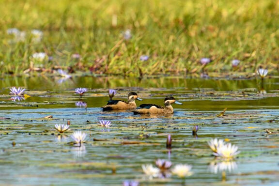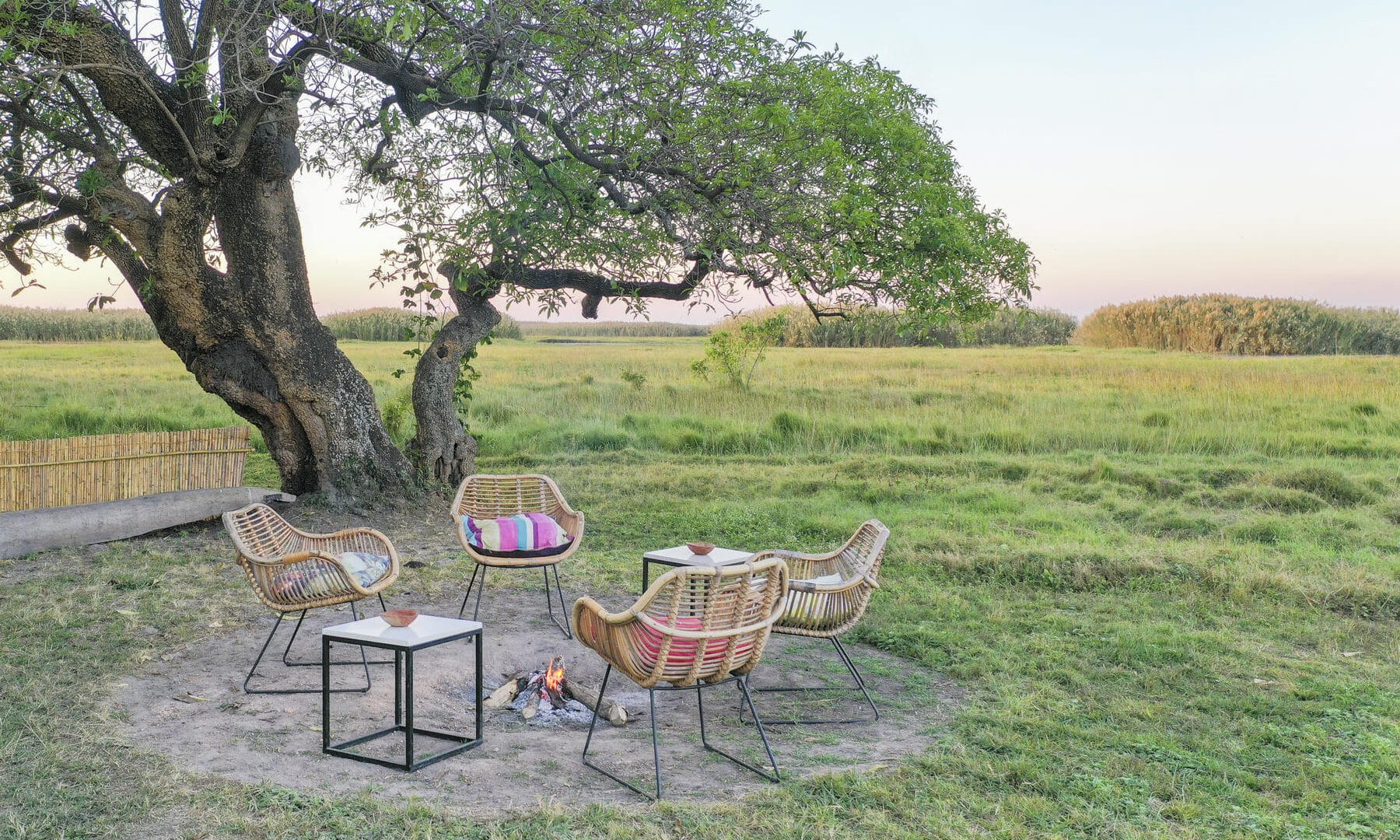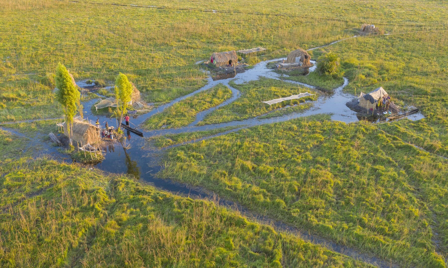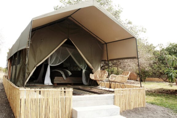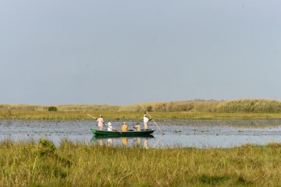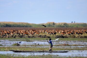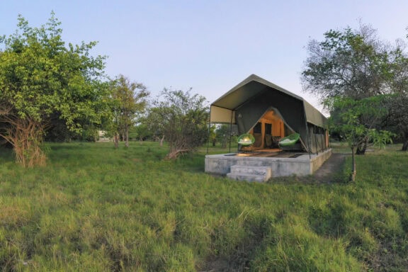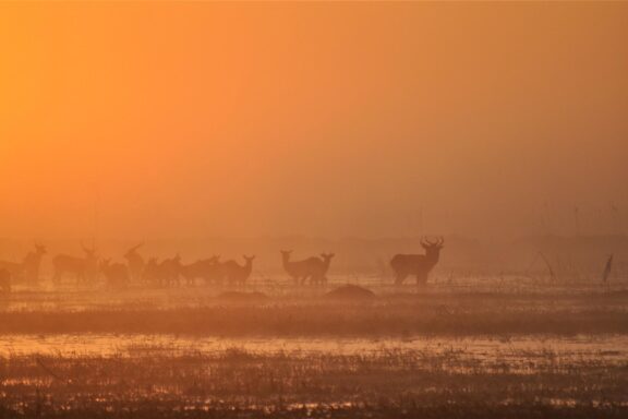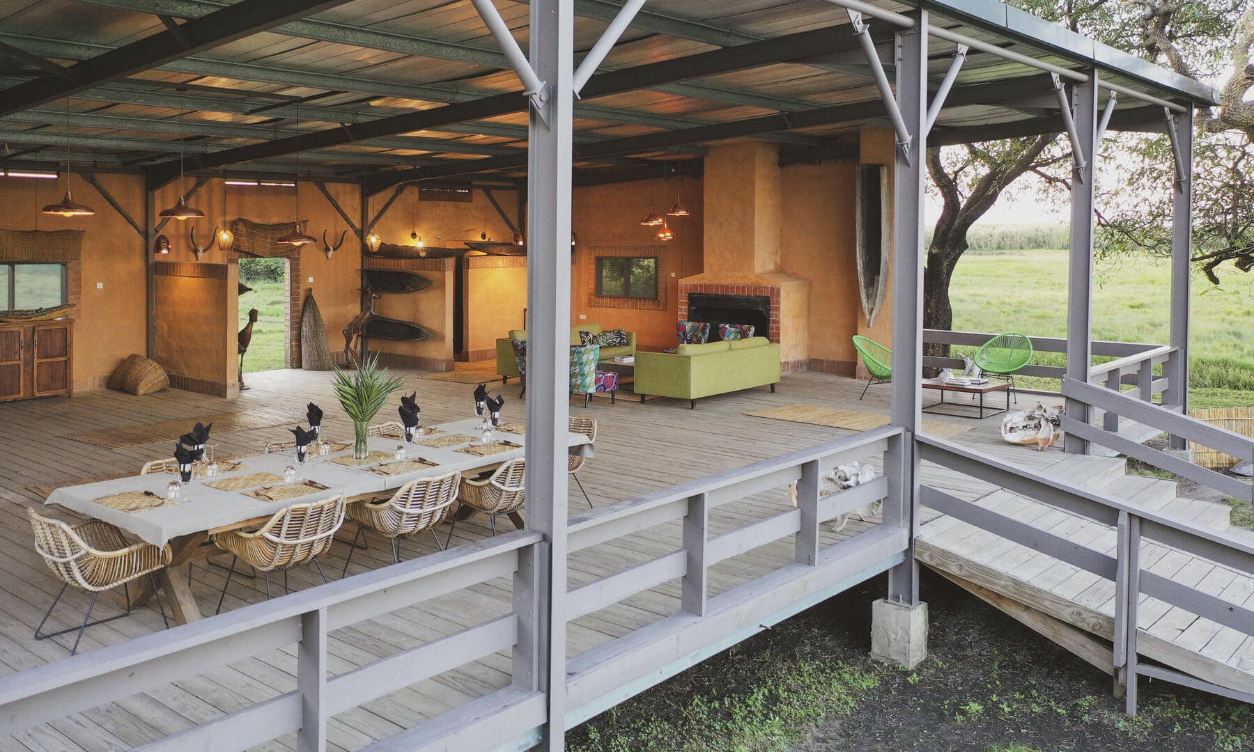 Nestled in a grove of trees on the high flood line of Bangweulu wetland, Shoebill Island Camp’s main area opens onto the vast plains filled with black lechwe and flocks of diverse water birds.