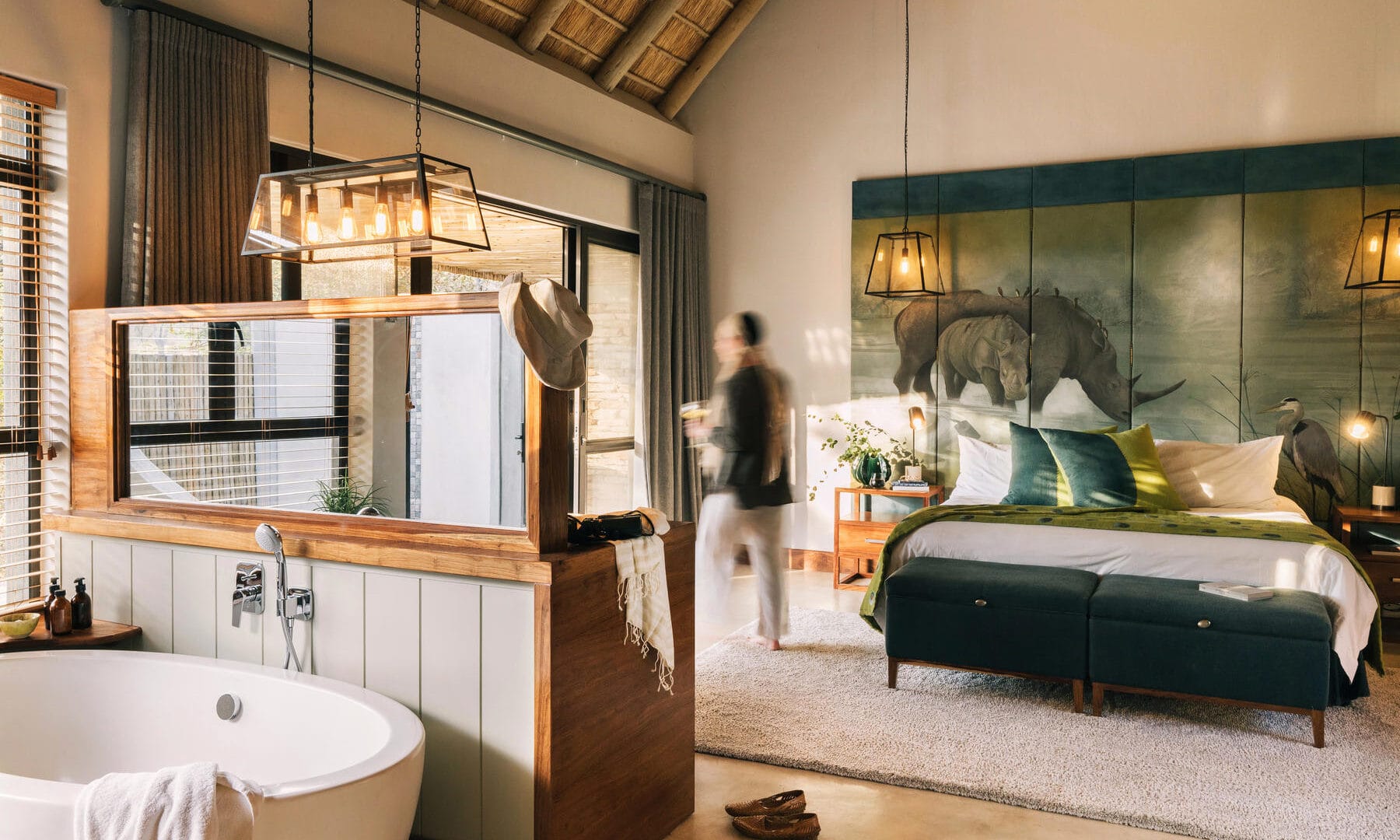 The lodge features a collection of elegant suites, each with a private deck overlooking the bush. The atmosphere is calm and unhurried, with walking paths winding through cycads and indigenous planting. You can spend your day on game drives or guided bush walks, returning to relax beside the pool or enjoy quiet time in the garden.