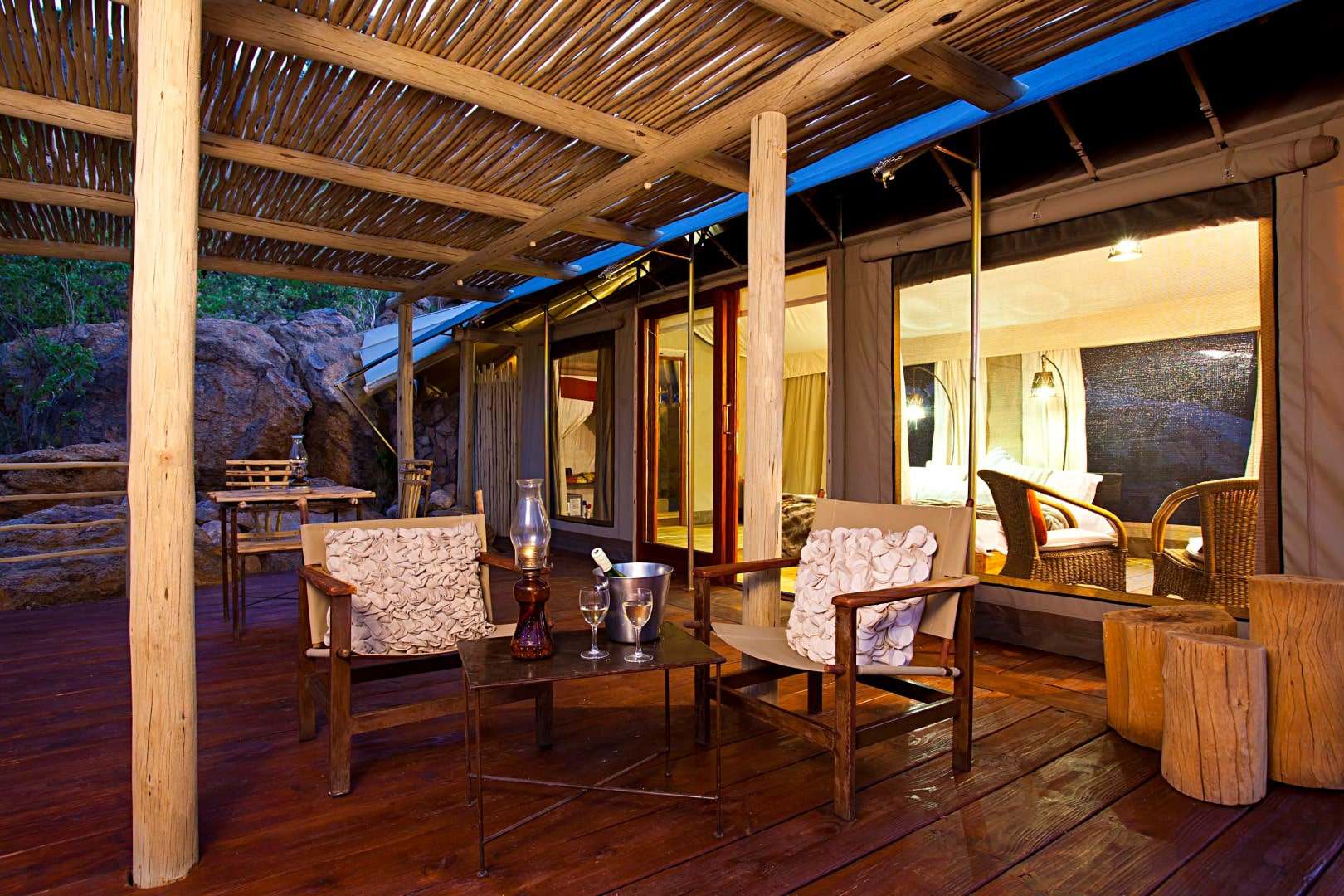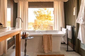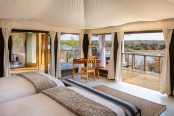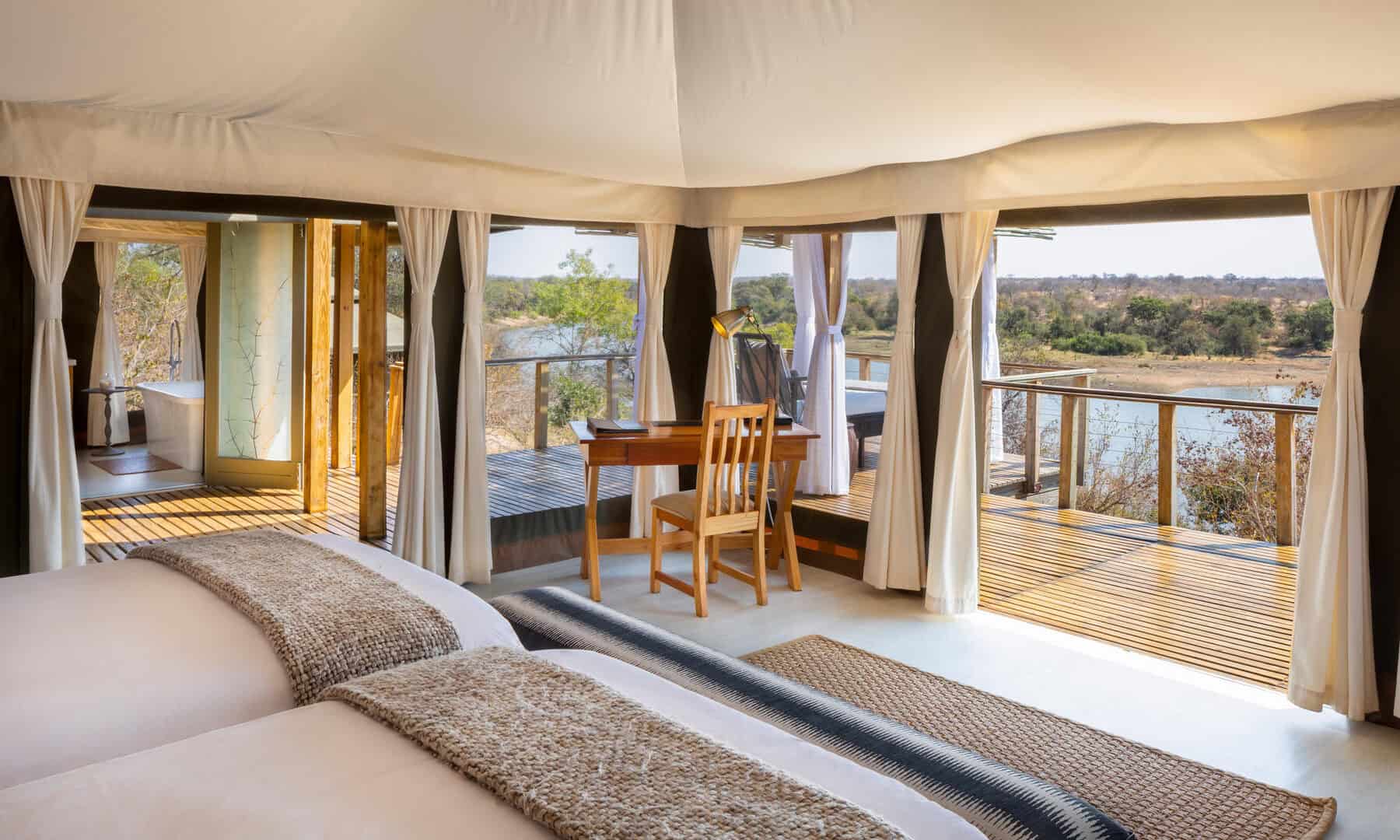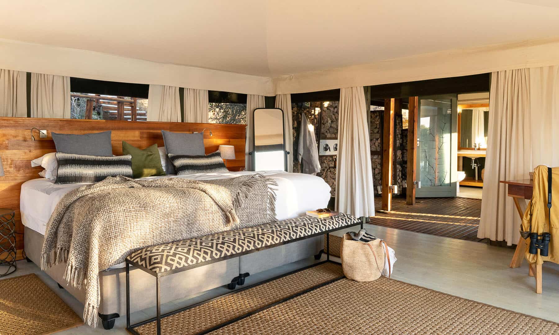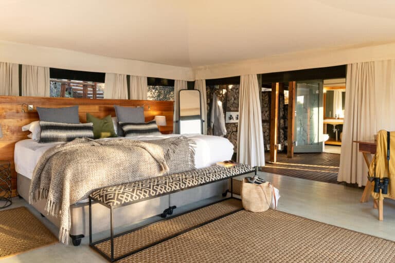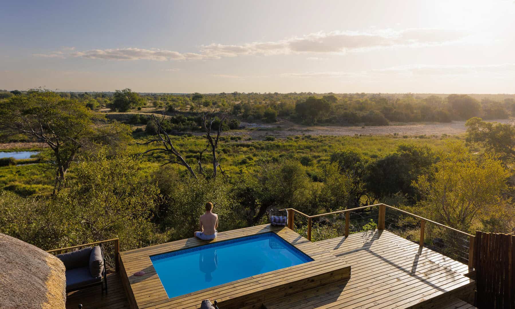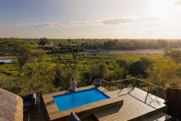 The lodge features eight tented suites, spaced for privacy and panoramic outlooks. Each suite includes a private deck and plunge pool, offering a quiet retreat between activities. Days are shaped by game drives through the Greater Kruger, where sightings of leopards, lions, wild dogs, and other species are common.