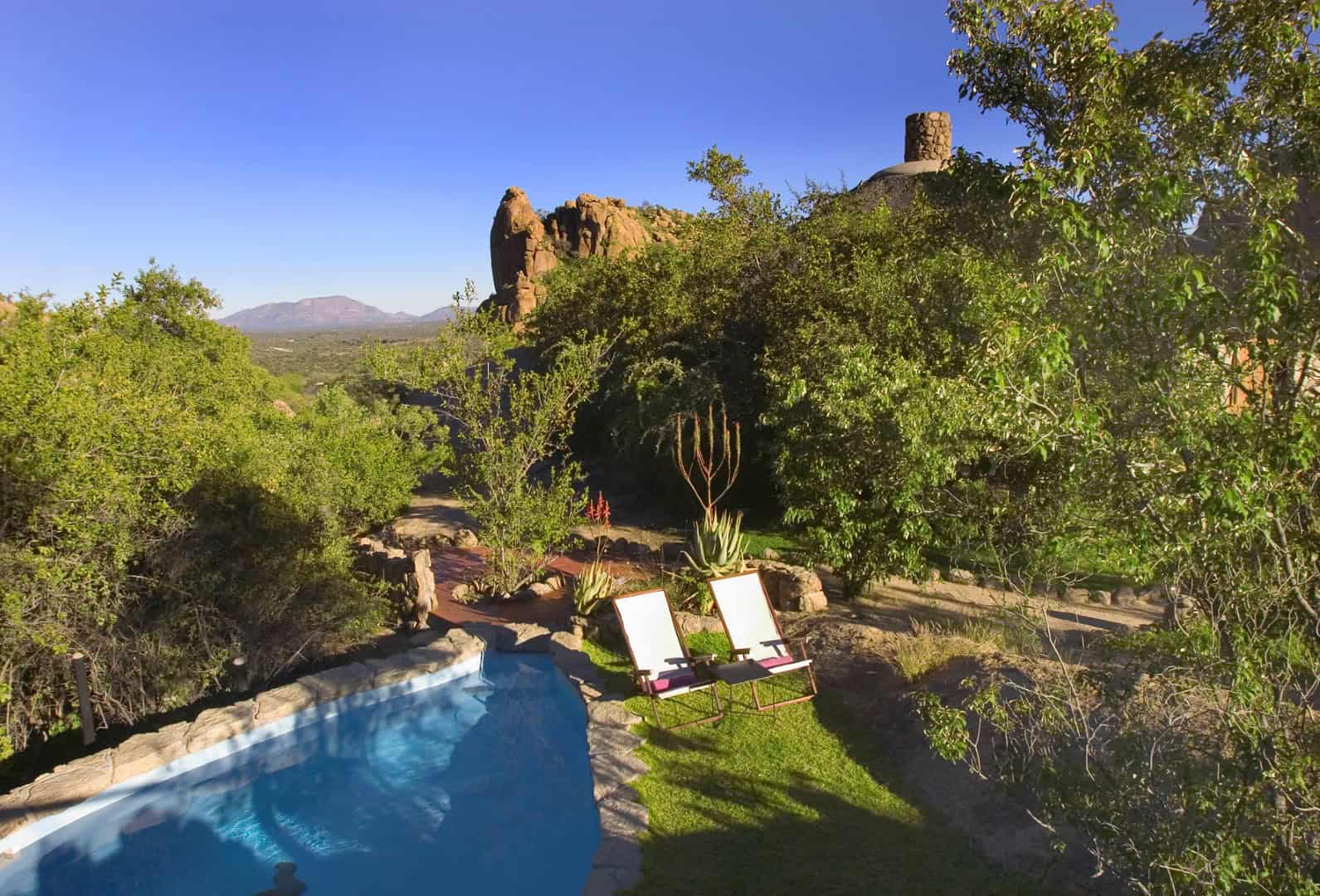 Situated on a hillside in the Timbavati Private Nature Reserve, Simbavati Hilltop Lodge boasts scenic views over the bushveld, with the Drakensberg Mountains rising in the distance and the Mbali Dam and Nhlaralumi River below. This elevated setting offers dramatic scenery and attracts a steady flow of wildlife, from elephants and buffalo to an abundance of birdlife.