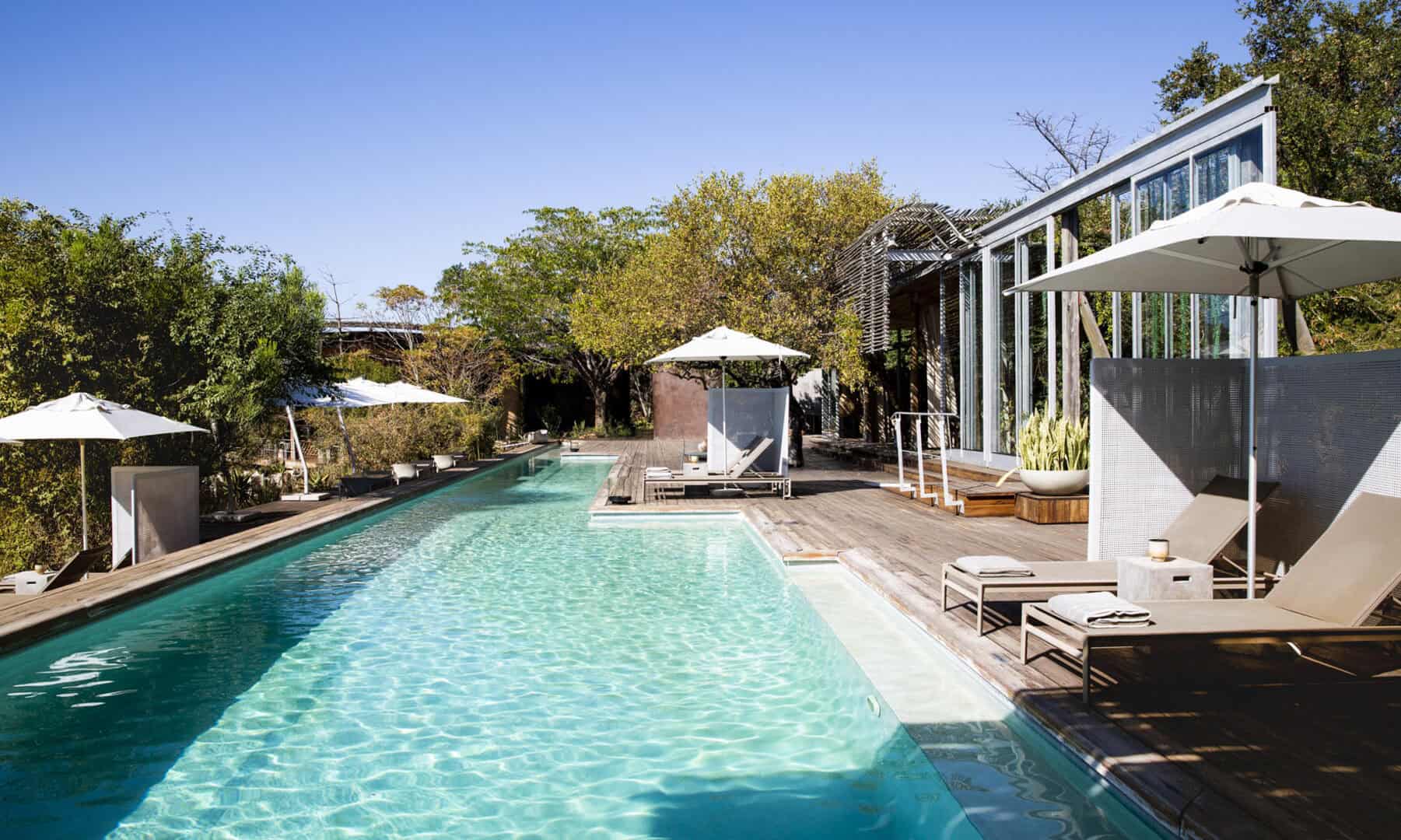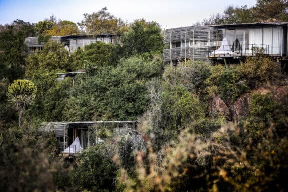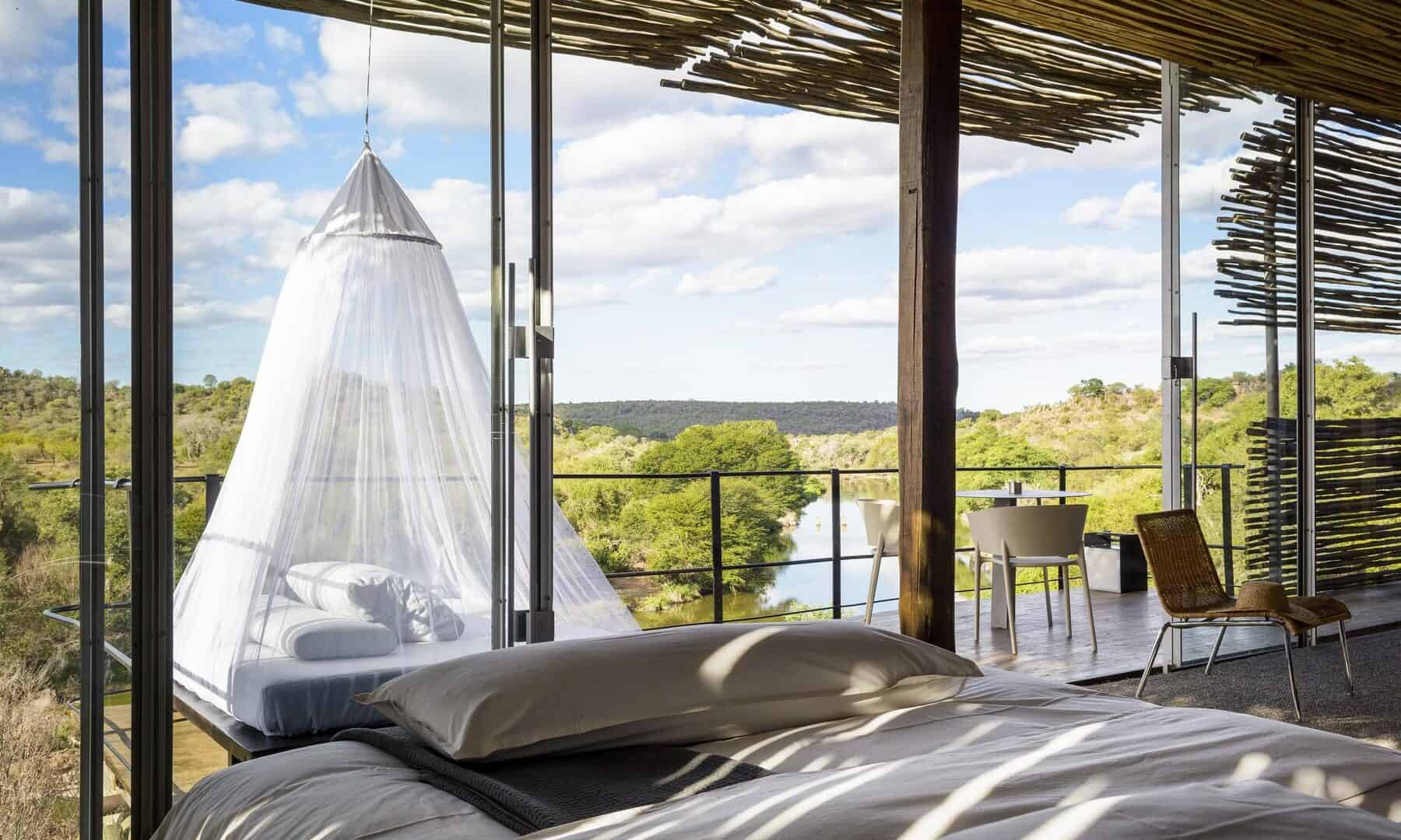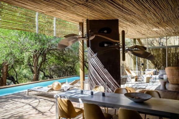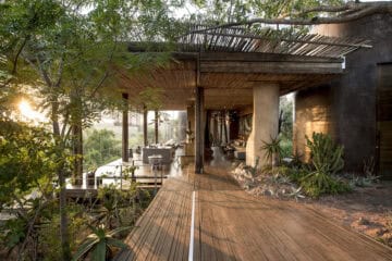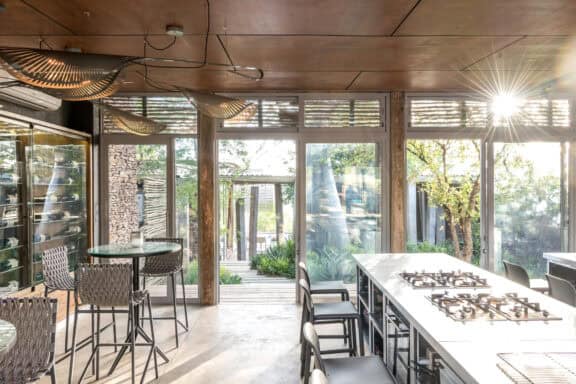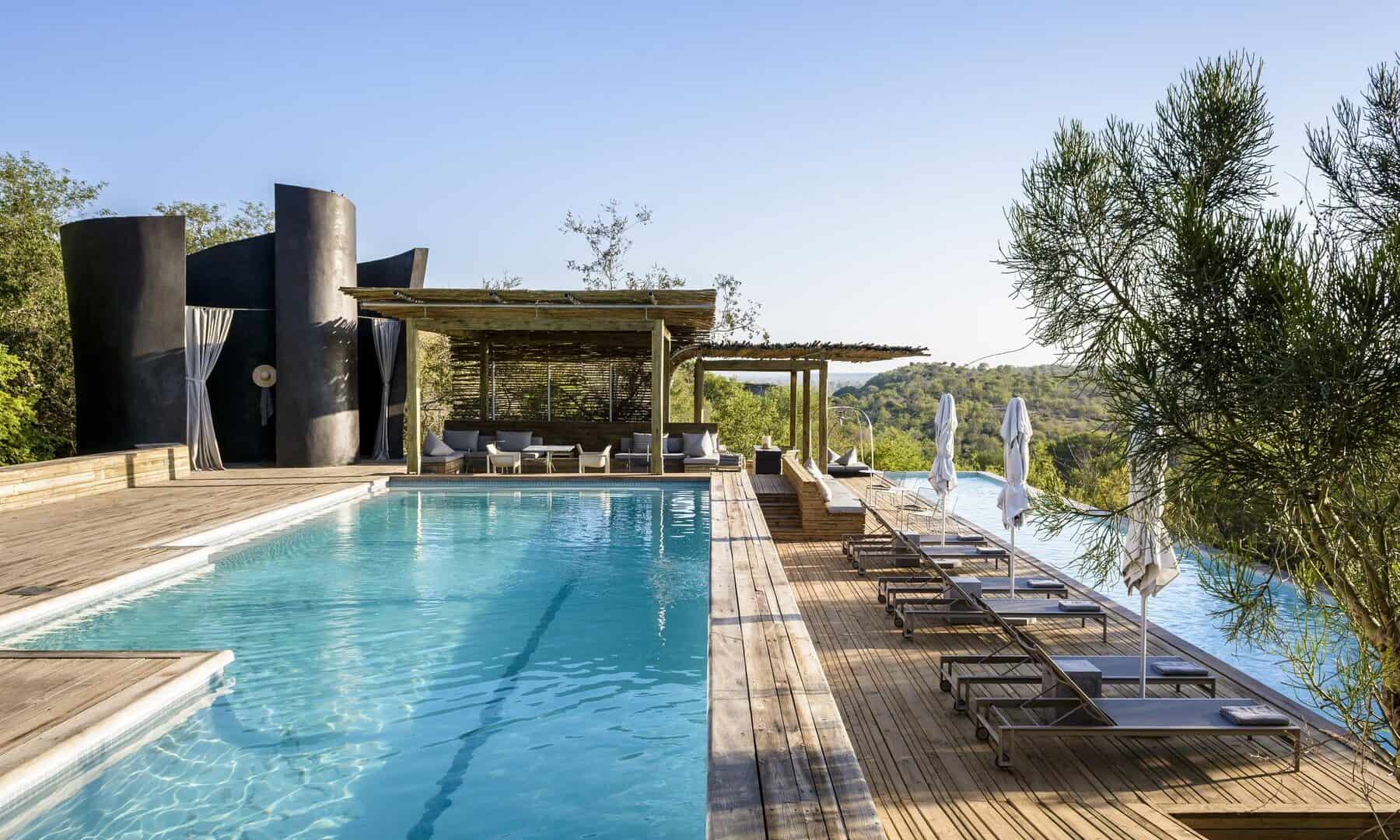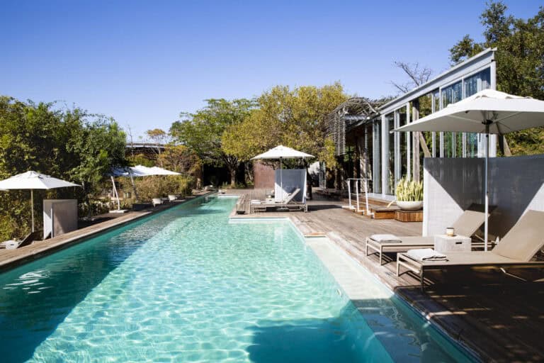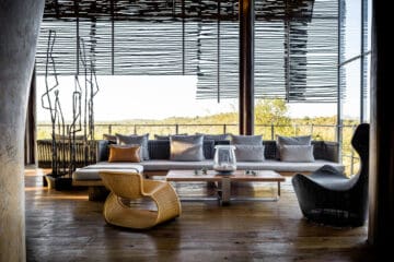 The Lebombo Lodge comprises 13 suites and one private-use villa that give guests a front row seat to the Kruger National Park with bold, contemporary open plan suites suspended above the N’Wanetsi River. The exclusive concession is a richly diverse habitat, teeming with game, beneath endless African skies. Set apart from the main lodge, the private villa features two 2-bedroom suites, each with a private pool. Built low down on the river bank beneath mature trees, the private villa is fully staffed, has an open-plan kitchen and its own boma. The lodge also features a roof terrace and wine studio, an interactive kitchen, an espresso bar and help-yourself deli, and a 25-metre lap pool.