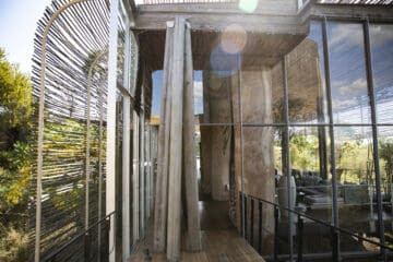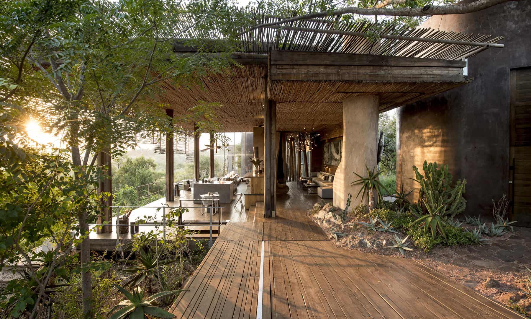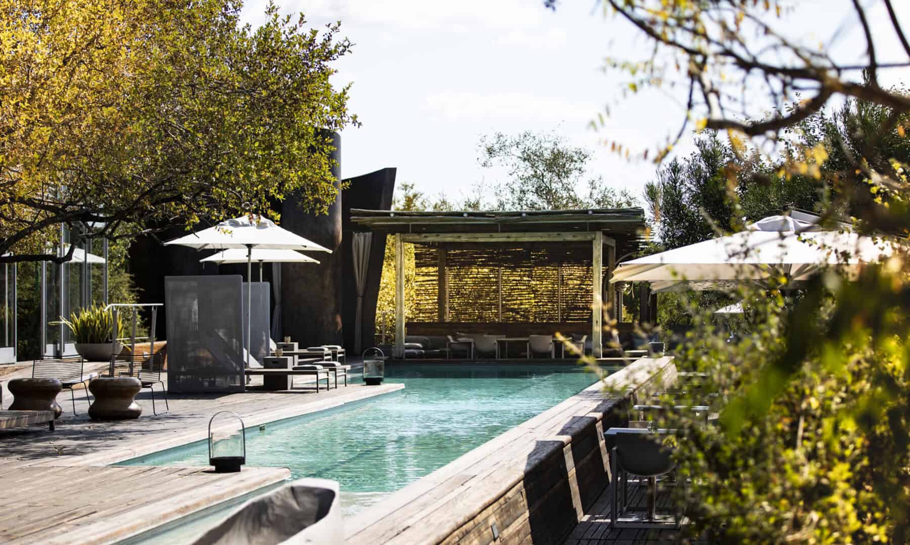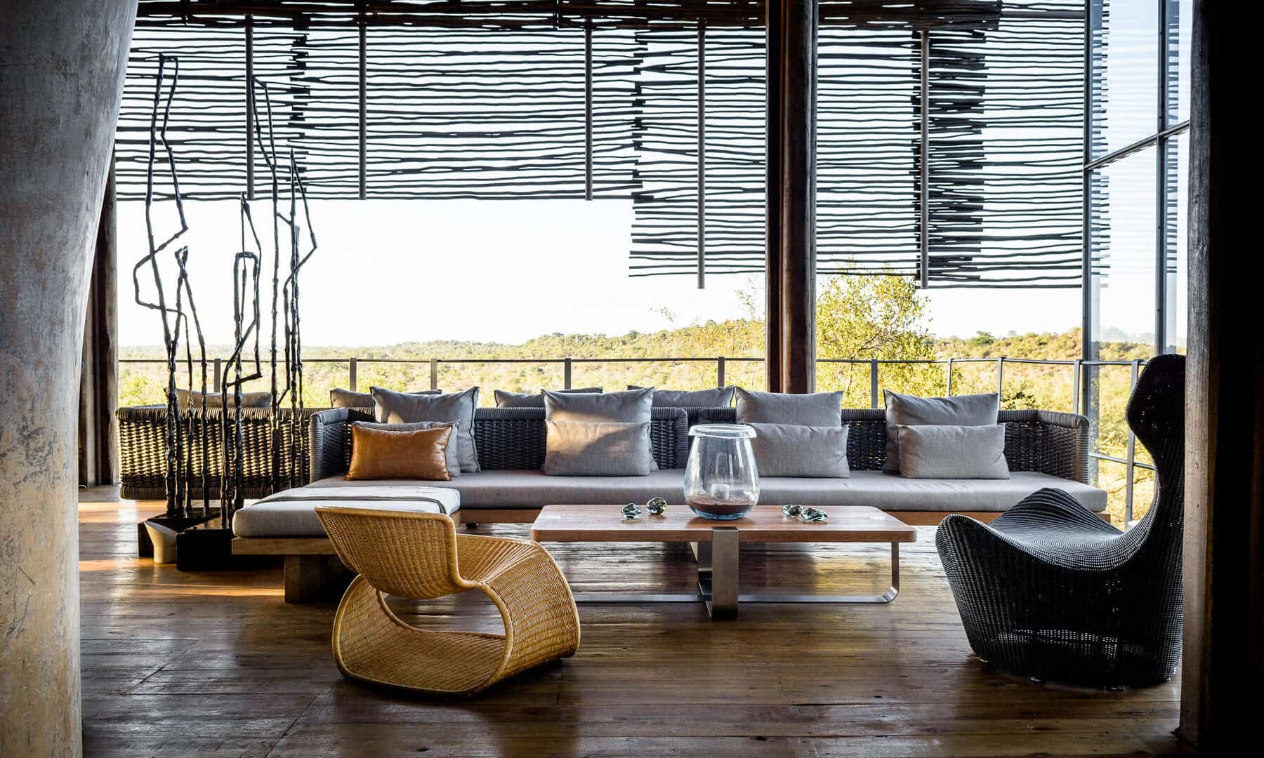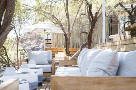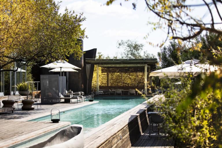 The Lebombo Lodge comprises 13 suites and one private-use villa that give guests a front row seat to the Kruger National Park with bold, contemporary open plan suites suspended above the N’Wanetsi River. The exclusive concession is a richly diverse habitat, teeming with game, beneath endless African skies. Set apart from the main lodge, the private villa features two 2-bedroom suites, each with a private pool. Built low down on the river bank beneath mature trees, the private villa is fully staffed, has an open-plan kitchen and its own boma. The lodge also features a roof terrace and wine studio, an interactive kitchen, an espresso bar and help-yourself deli, and a 25-metre lap pool.