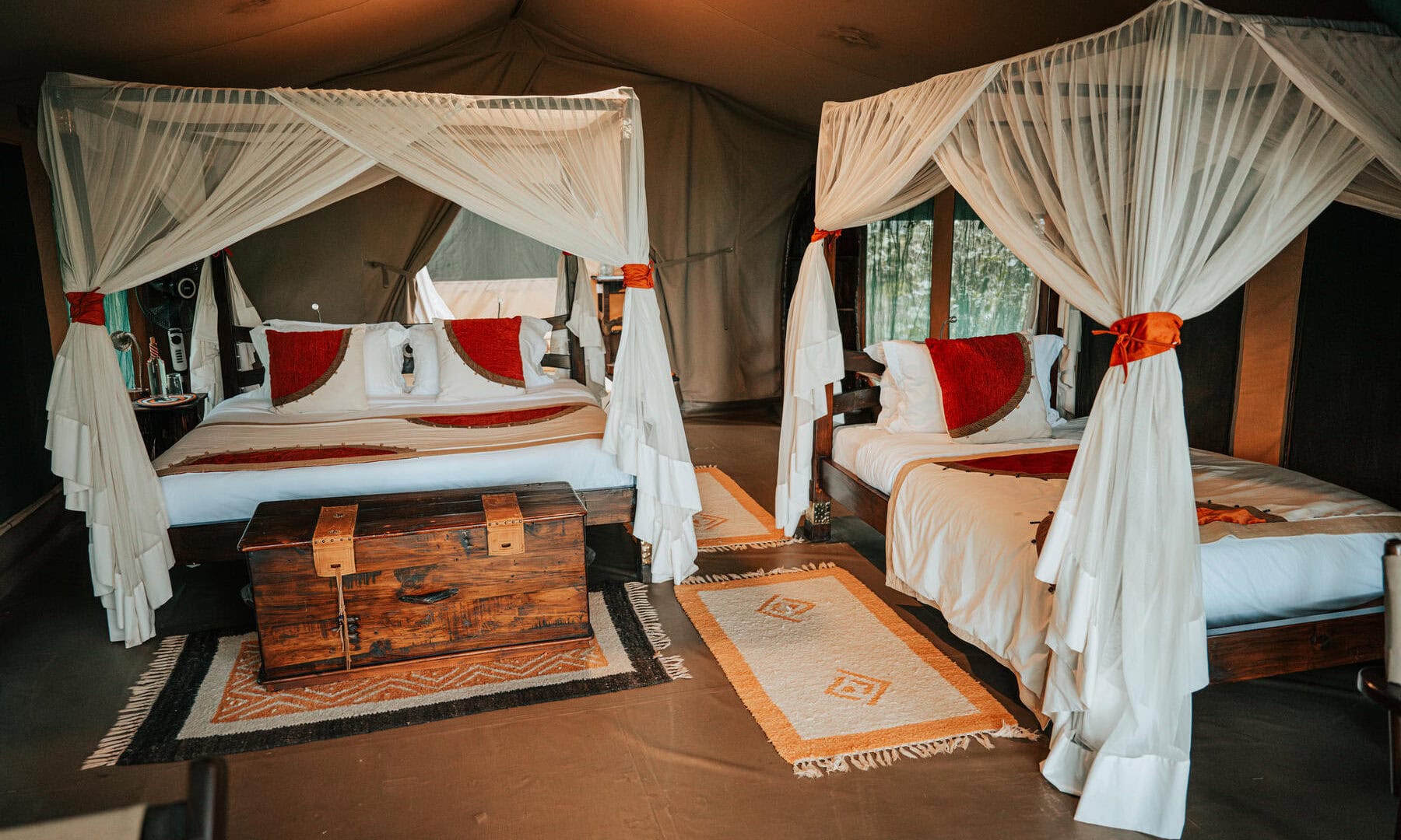 Soroi Mara Bush Camp is designed for couples and families, providing an intimate, luxurious, and memorable safari experience with a Gold Eco Rating. This camp ensures comfort and privacy with ten river-facing luxury tents, accommodating two adults and one child each, and two spacious family tents that can house up to four guests.
