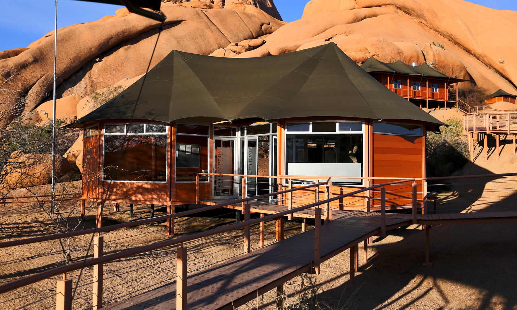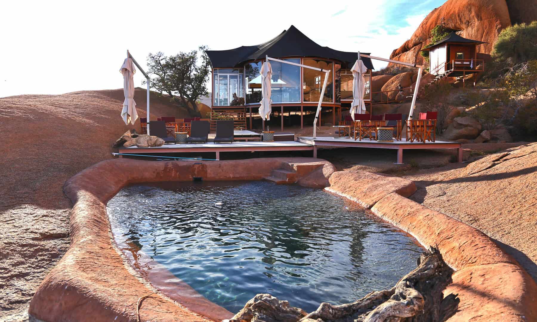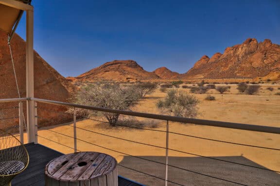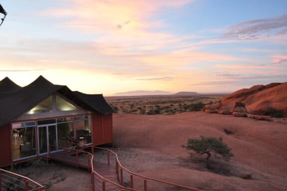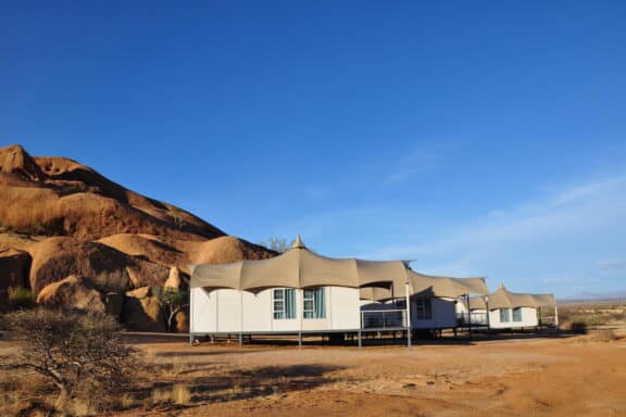 The lodge is situated on the northern periphery of the Spitzkoppe inselberg, between huge granite boulders, which were created more than 150 million years ago, with breath-taking views onto the Brandberg and Erongo Mountains. The stylish, private accommodation consists of 15 spacious, tastefully furnished chalets, each with a private bathroom and outside viewing deck, which connects the guest with the vast stretches of untouched sand and boulders beyond.