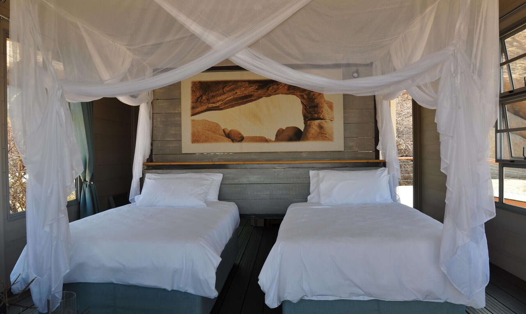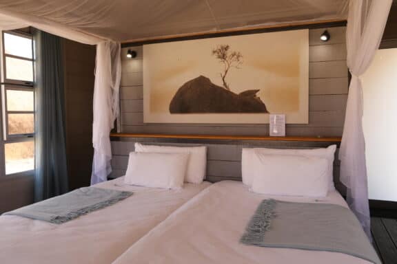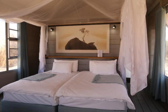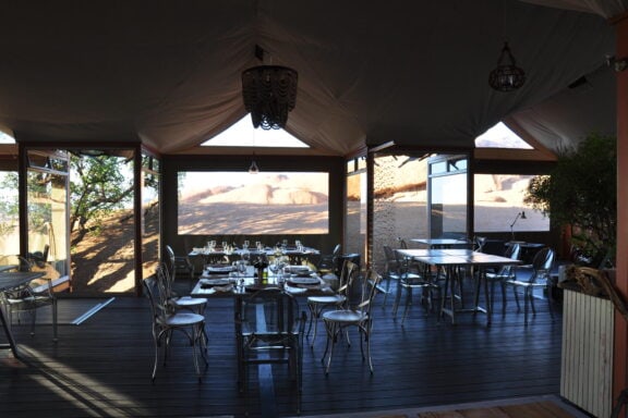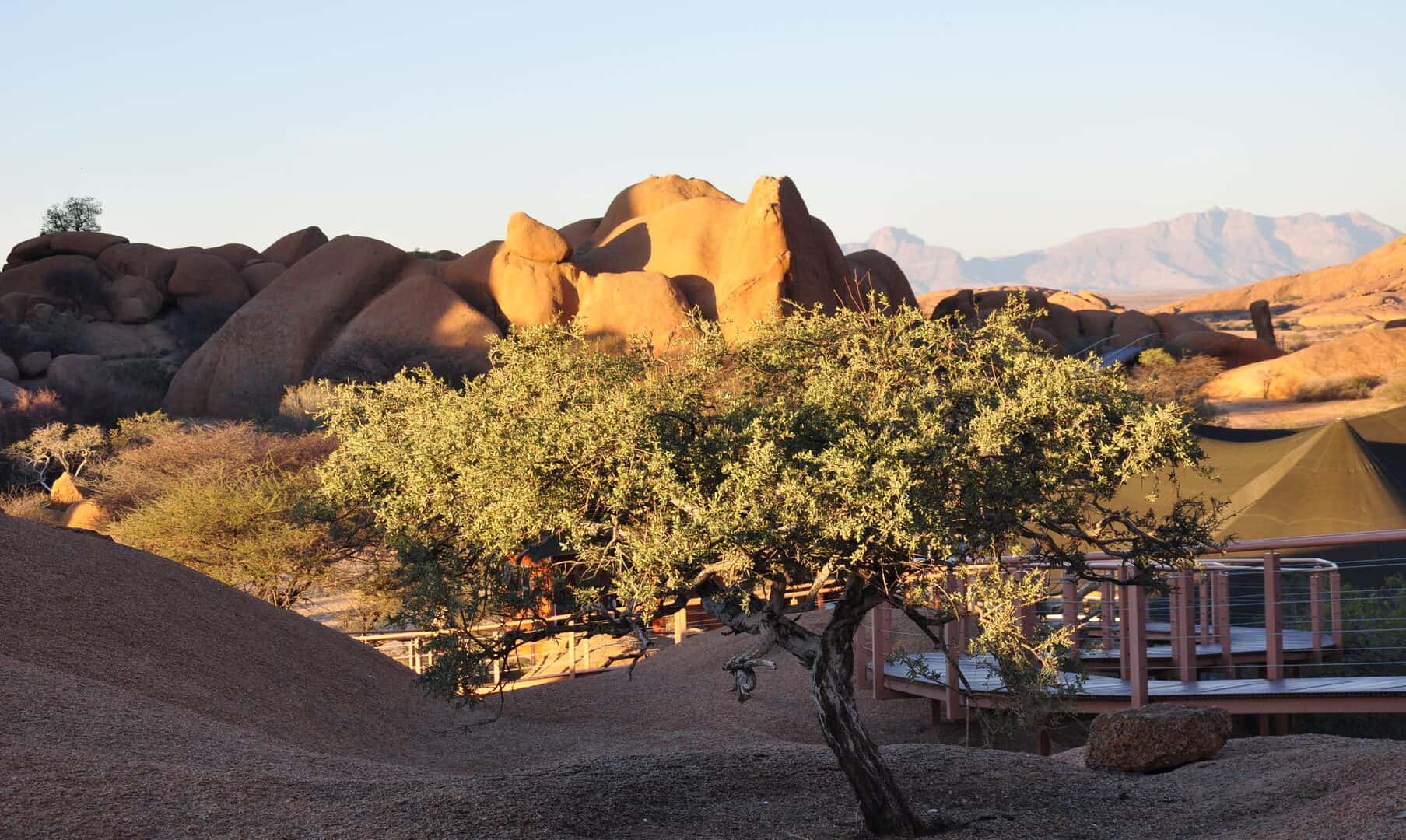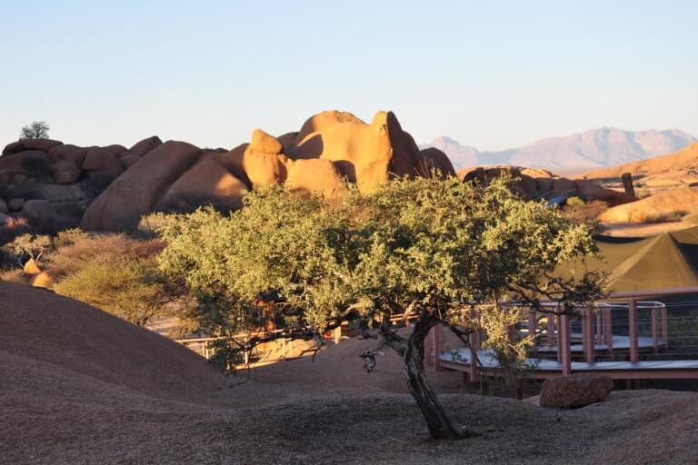 The lodge is situated on the northern periphery of the Spitzkoppe inselberg, between huge granite boulders, which were created more than 150 million years ago, with breath-taking views onto the Brandberg and Erongo Mountains. The stylish, private accommodation consists of 15 spacious, tastefully furnished chalets, each with a private bathroom and outside viewing deck, which connects the guest with the vast stretches of untouched sand and boulders beyond.