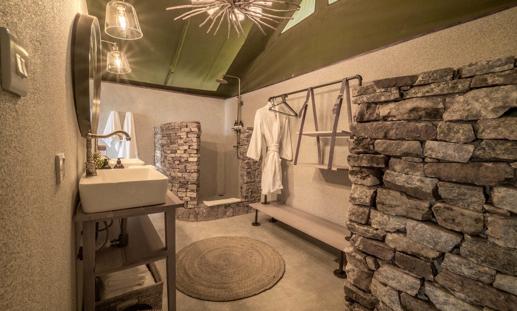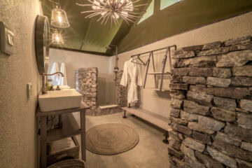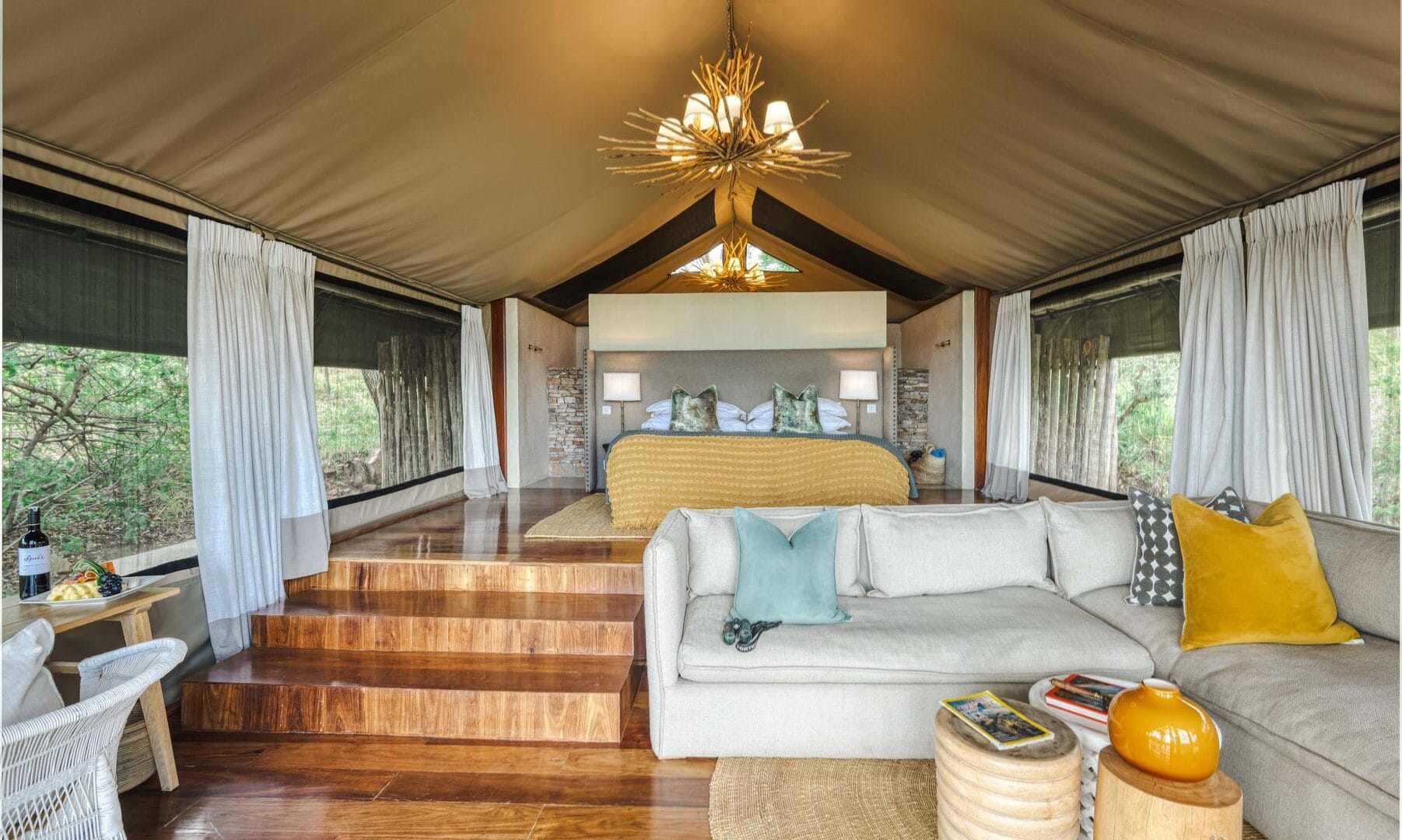 The camp consists of 12 split-level accommodation tents. Each tent measures 50 square meters (or 500 square feet) and provides a verandah, comfortable lounge area, bedroom area, and fully serviced bathroom.