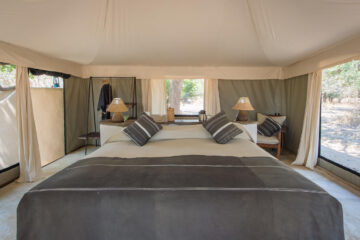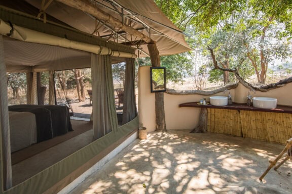 Constructed with a beautiful mix of contemporary styling and natural materials, this camp showcases the surrounding environment with details like tree trunk tent poles, stunning textiles, and a central common area moulded around a large termite mound.