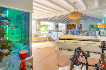 The Villa itself is a masterpiece of coastal elegance, decorated in soothing whites, greens, and blues. It boasts an expansive living area complete with an indoor aquarium, an impressive wine collection, and wraparound dining spaces offering 180-degree views of the Indian Ocean.