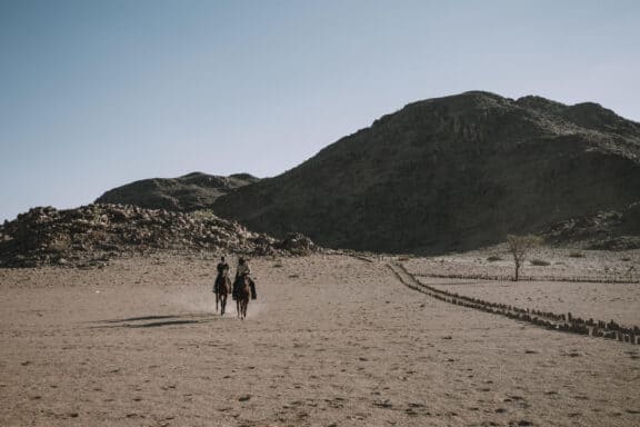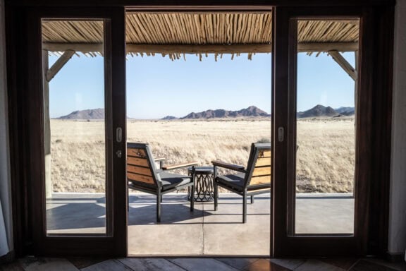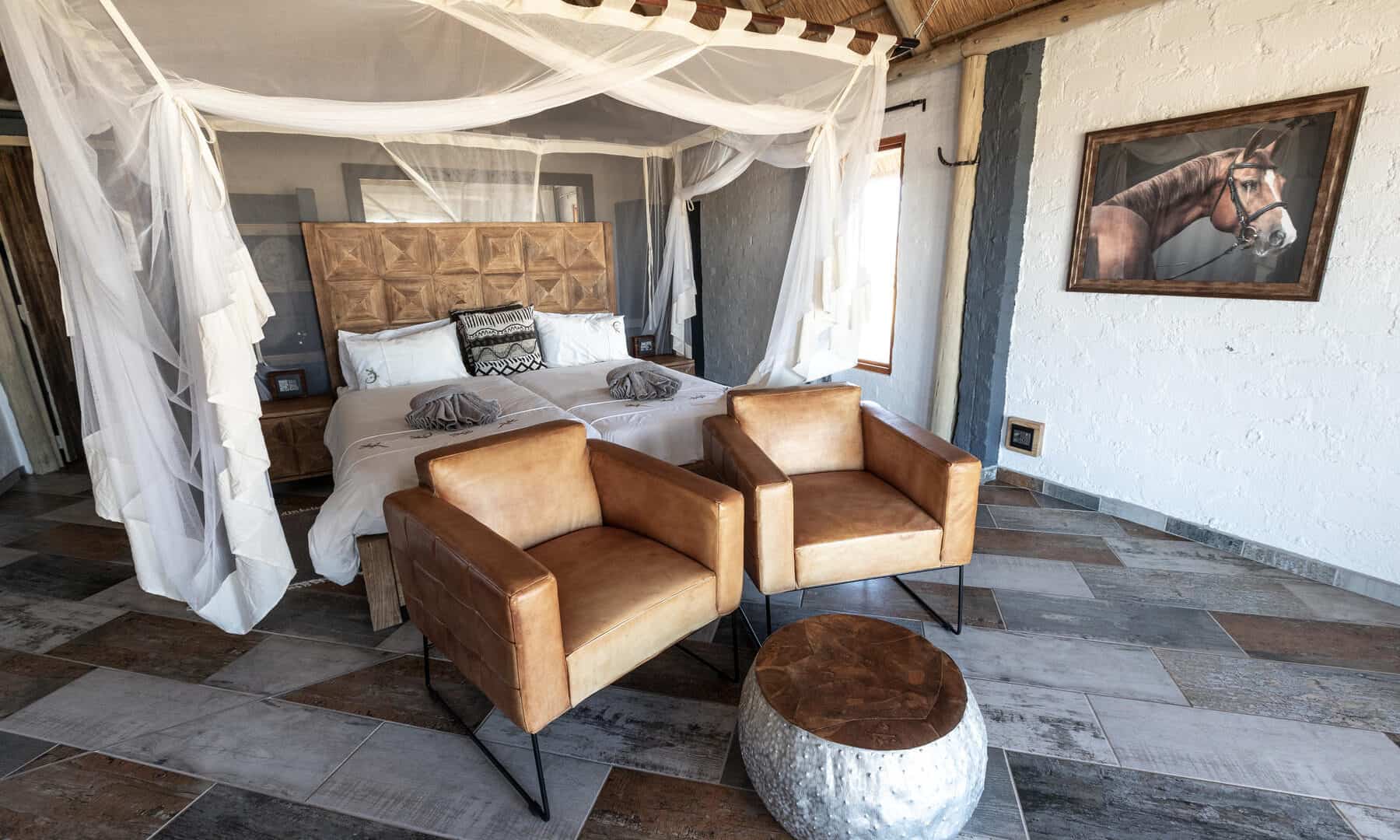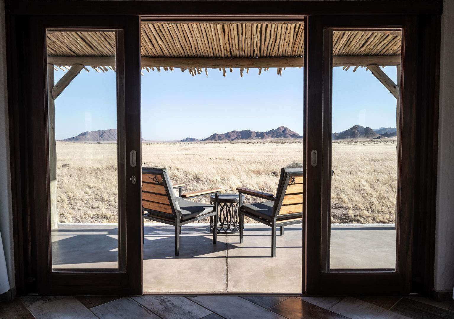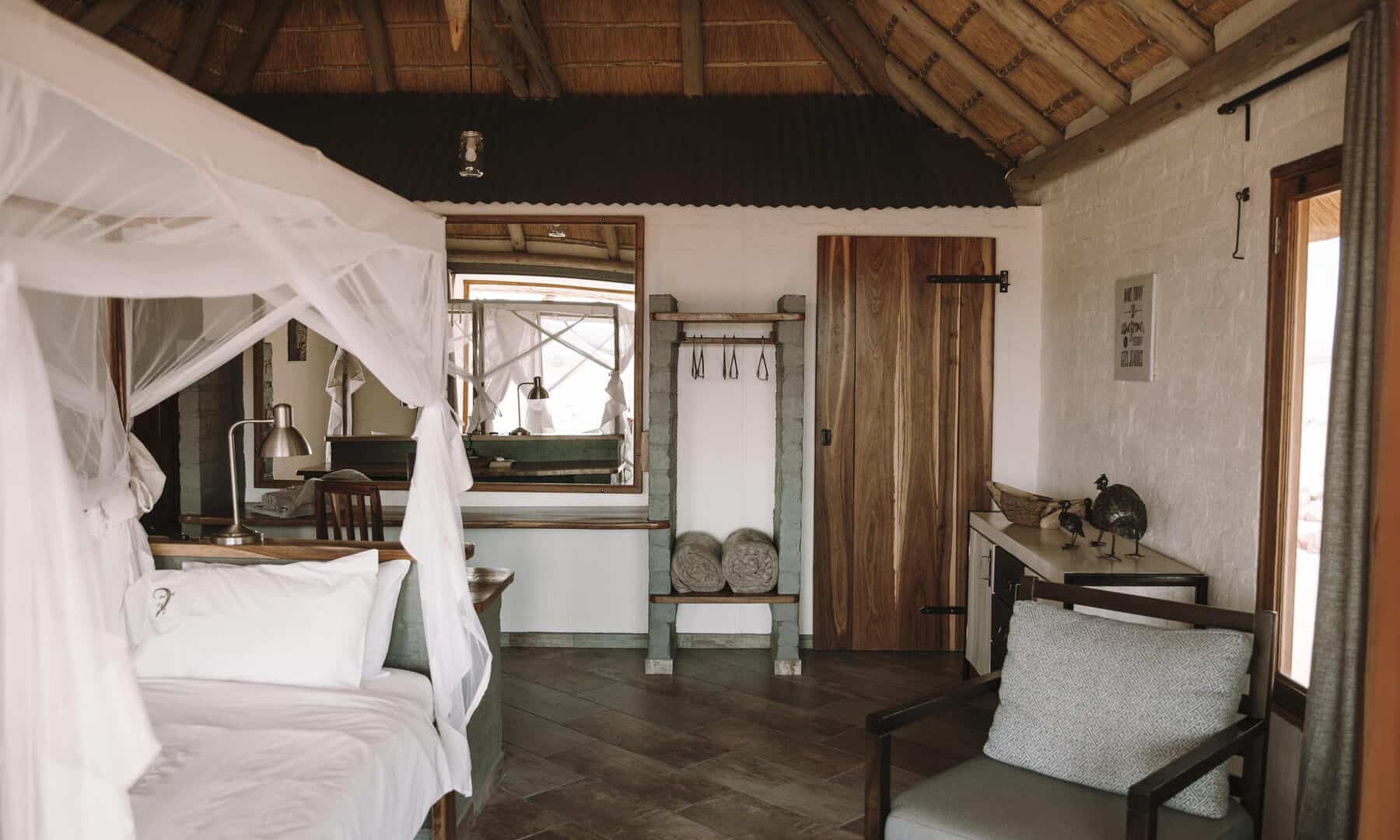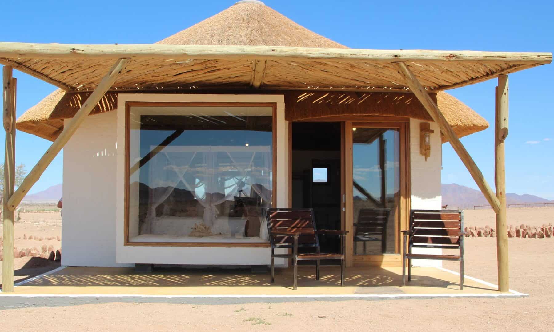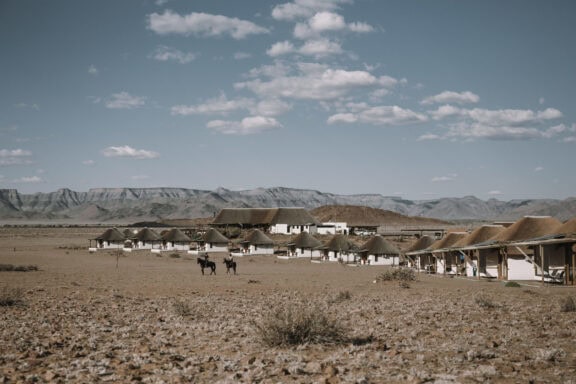 The wide valley in which the lodge is situated is sheltered by the Nubib, Tsaris and Naukluft Mountains with a view reaching the distant dunes of the Namib Desert in the west. In this exquisite position, the lodge offers stylish accommodation in thatched chalets which were designed with the fragile beauty of this remarkable environment in mind. Desert Homestead Lodge will ensure an unrivalled respite from the desert extremes. Tranquil surroundings, al fresco dining, delectably fresh farm cuisine, refreshing dips in the pool, stunning sunsets and sunrises are the basic pleasures at the lodge. And meandering across endless plains or discovering ancient water courses on a beautifully groomed steed is a magical and alternative way to appreciate the surroundings. The final remnants of each day see nature at her most profound. Rugged landscapes bathed in hues of pastel … a truly humbling experience.