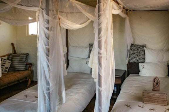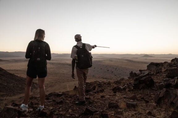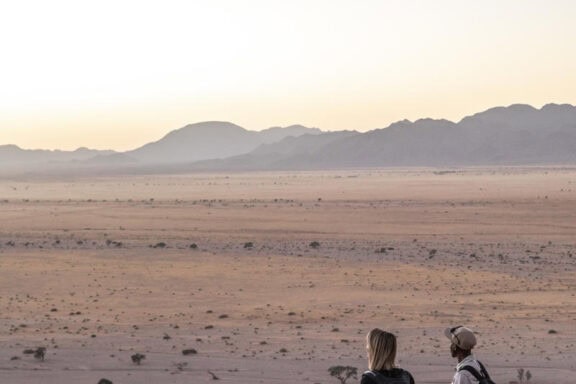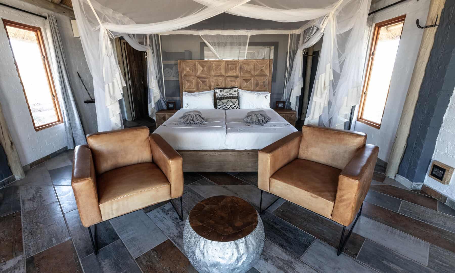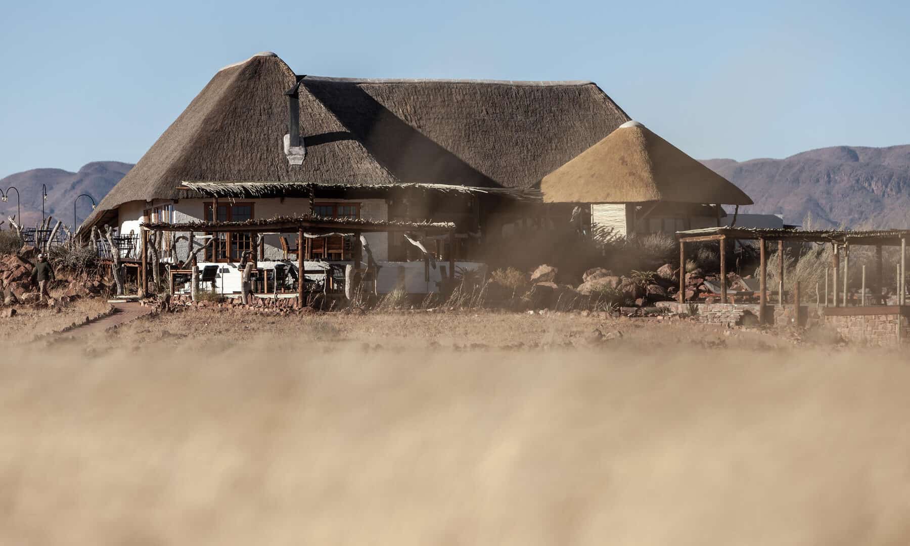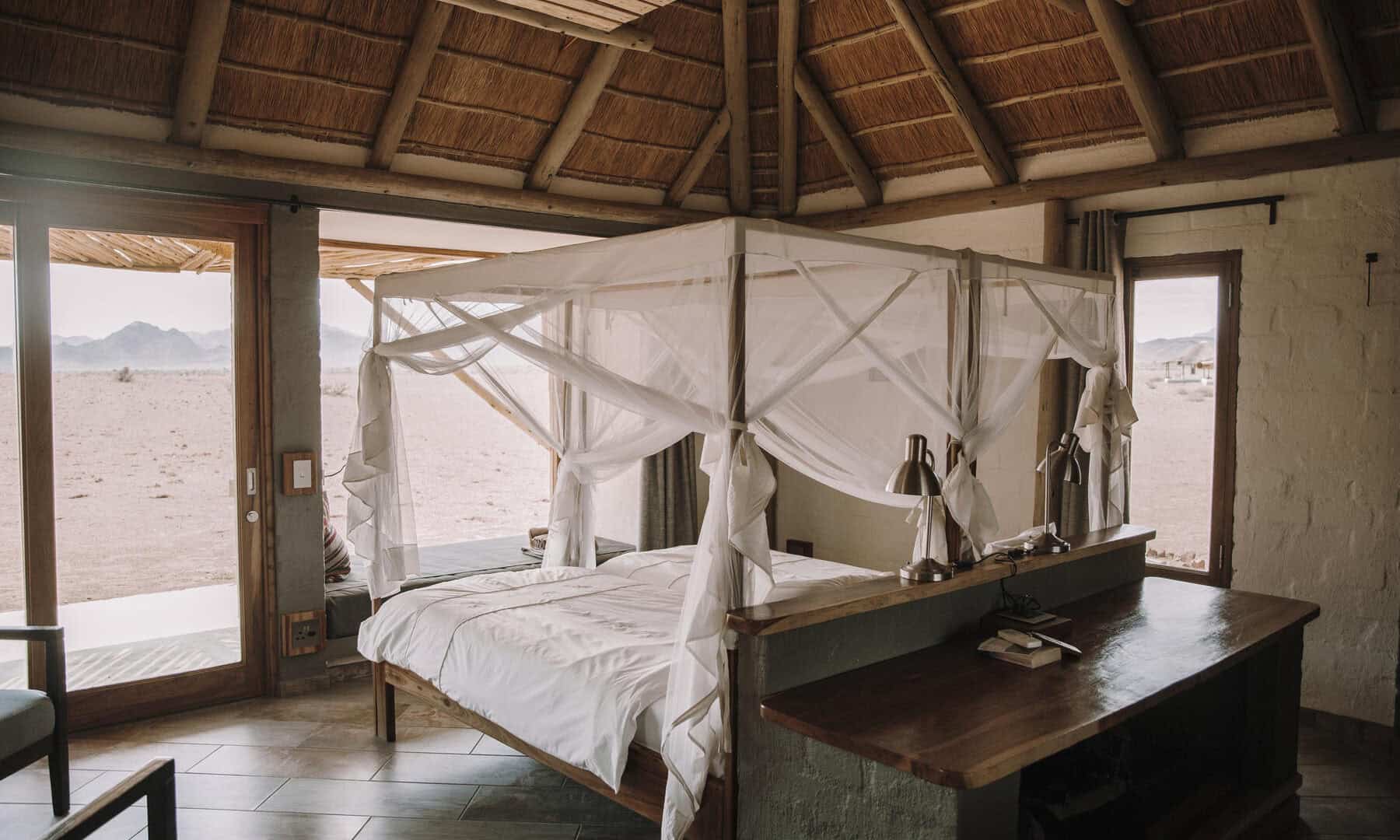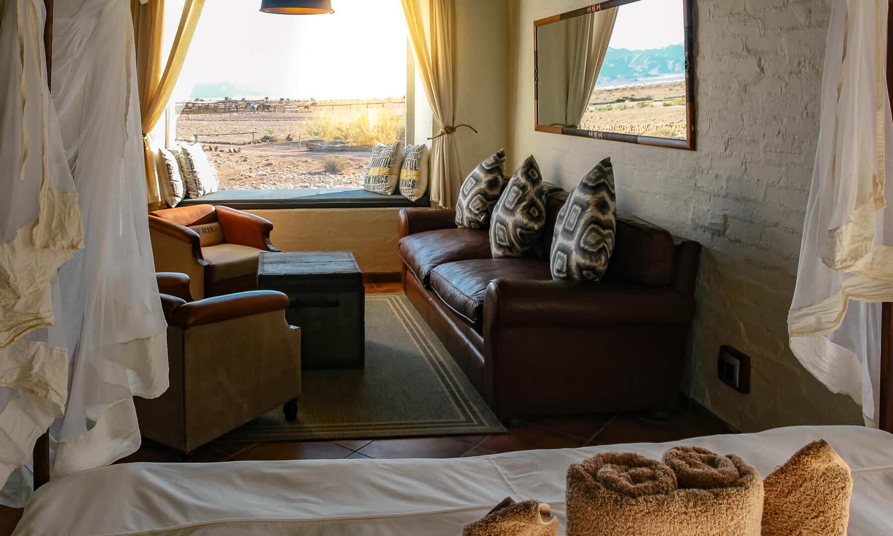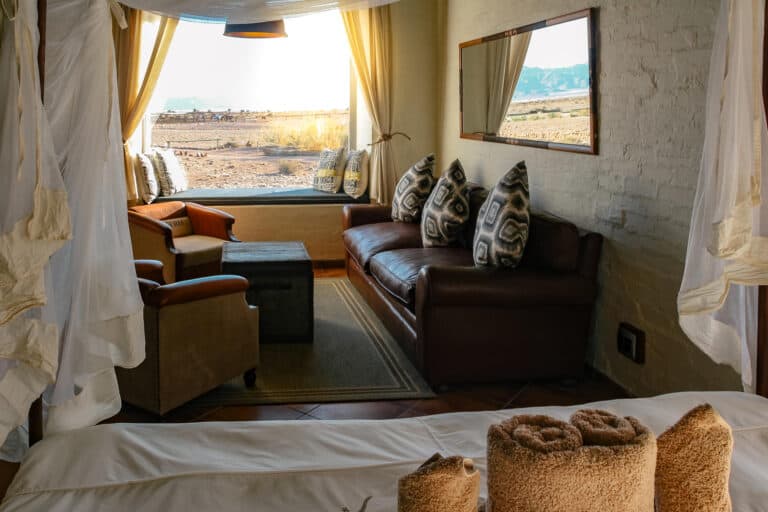 The wide valley in which the lodge is situated is sheltered by the Nubib, Tsaris and Naukluft Mountains with a view reaching the distant dunes of the Namib Desert in the west. In this exquisite position, the lodge offers stylish accommodation in thatched chalets which were designed with the fragile beauty of this remarkable environment in mind. Desert Homestead Lodge will ensure an unrivalled respite from the desert extremes. Tranquil surroundings, al fresco dining, delectably fresh farm cuisine, refreshing dips in the pool, stunning sunsets and sunrises are the basic pleasures at the lodge. And meandering across endless plains or discovering ancient water courses on a beautifully groomed steed is a magical and alternative way to appreciate the surroundings. The final remnants of each day see nature at her most profound. Rugged landscapes bathed in hues of pastel … a truly humbling experience.