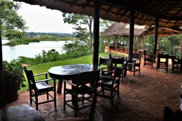 The restaurant and bar are in the centre of the lodge, overlooking the mighty river Nile and the waterfall.