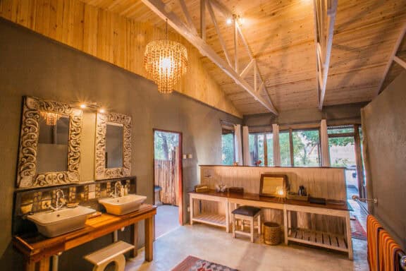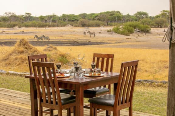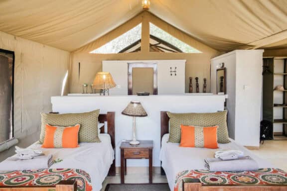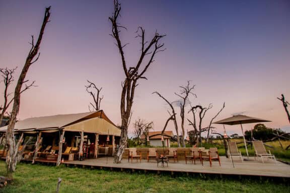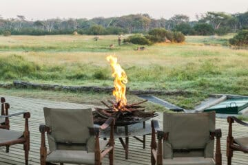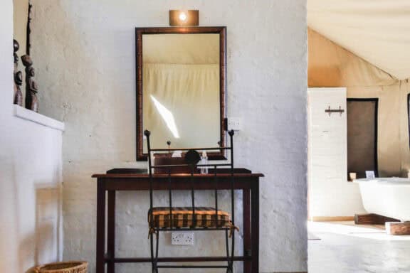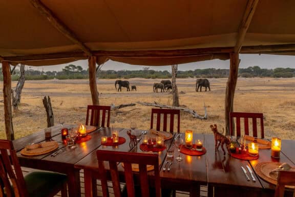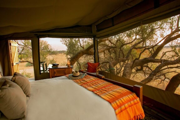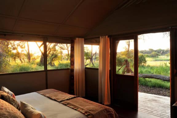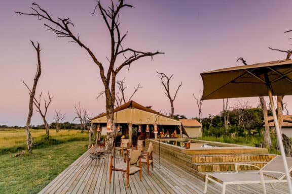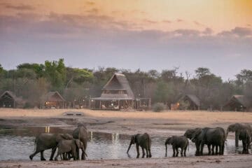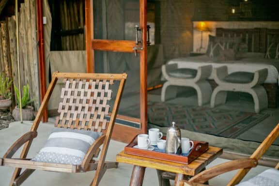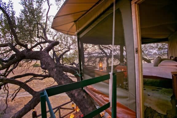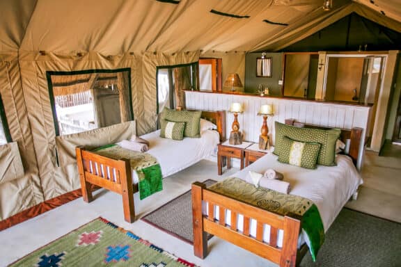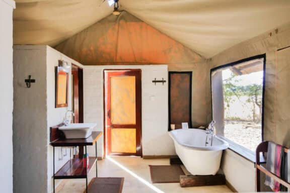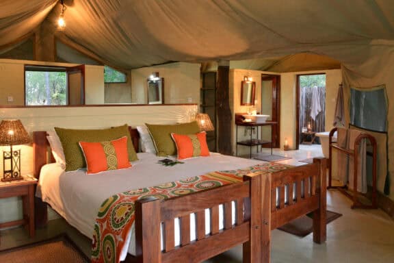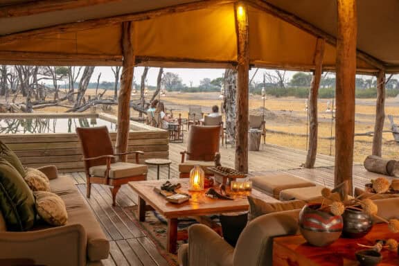 Guests are accommodated in 10 beautifully-furnished deluxe tents, all boasting en-suite bathrooms and private verandas overlooking the busy waterhole. As well as 2 exclusive use options for private groups or families. Keep your binoculars on hand, as elephant, lion and buffalo can often be seen satisfying their thirst.