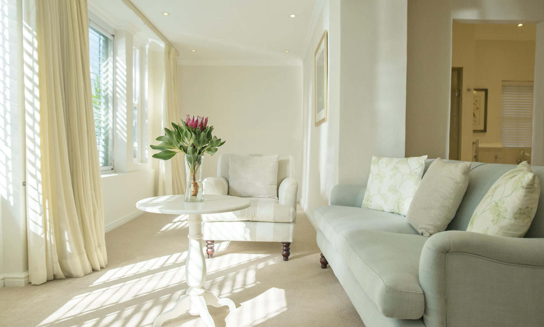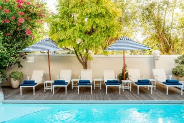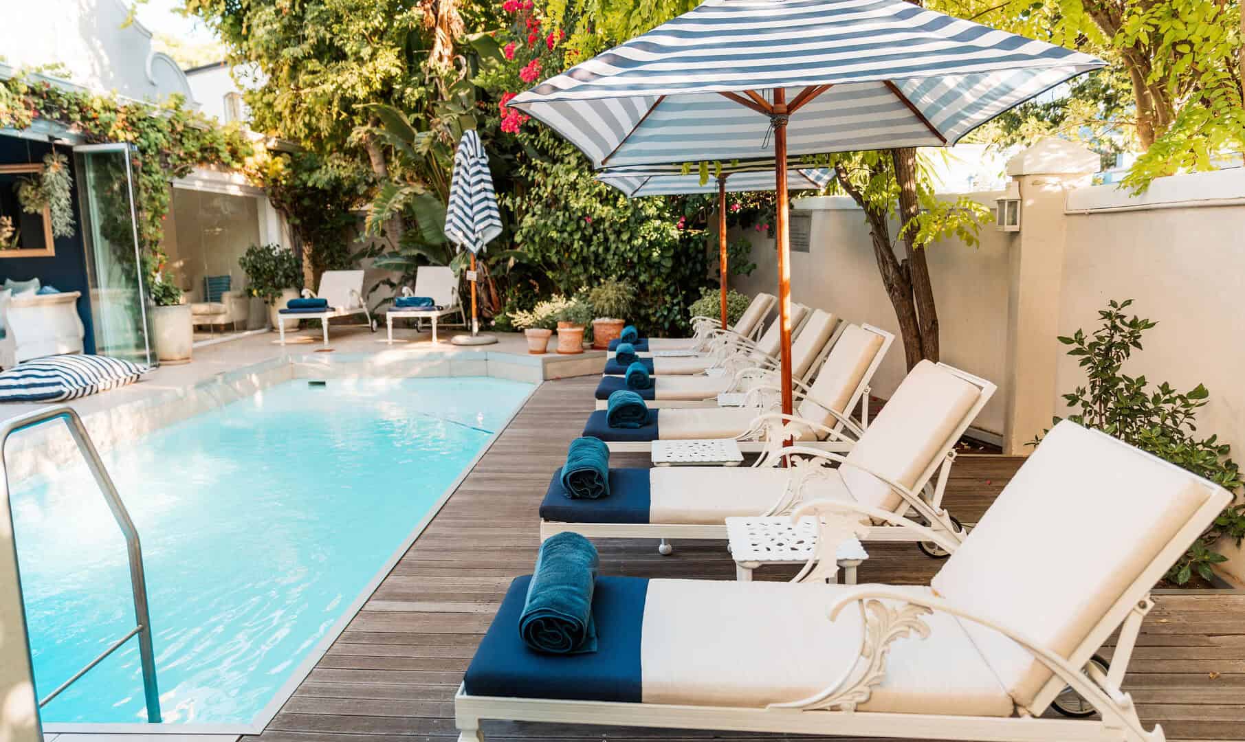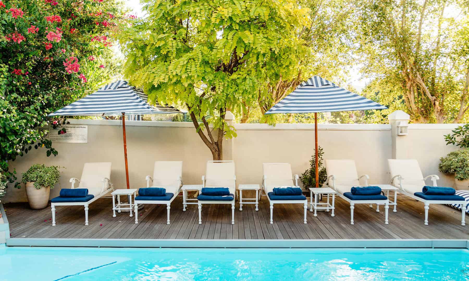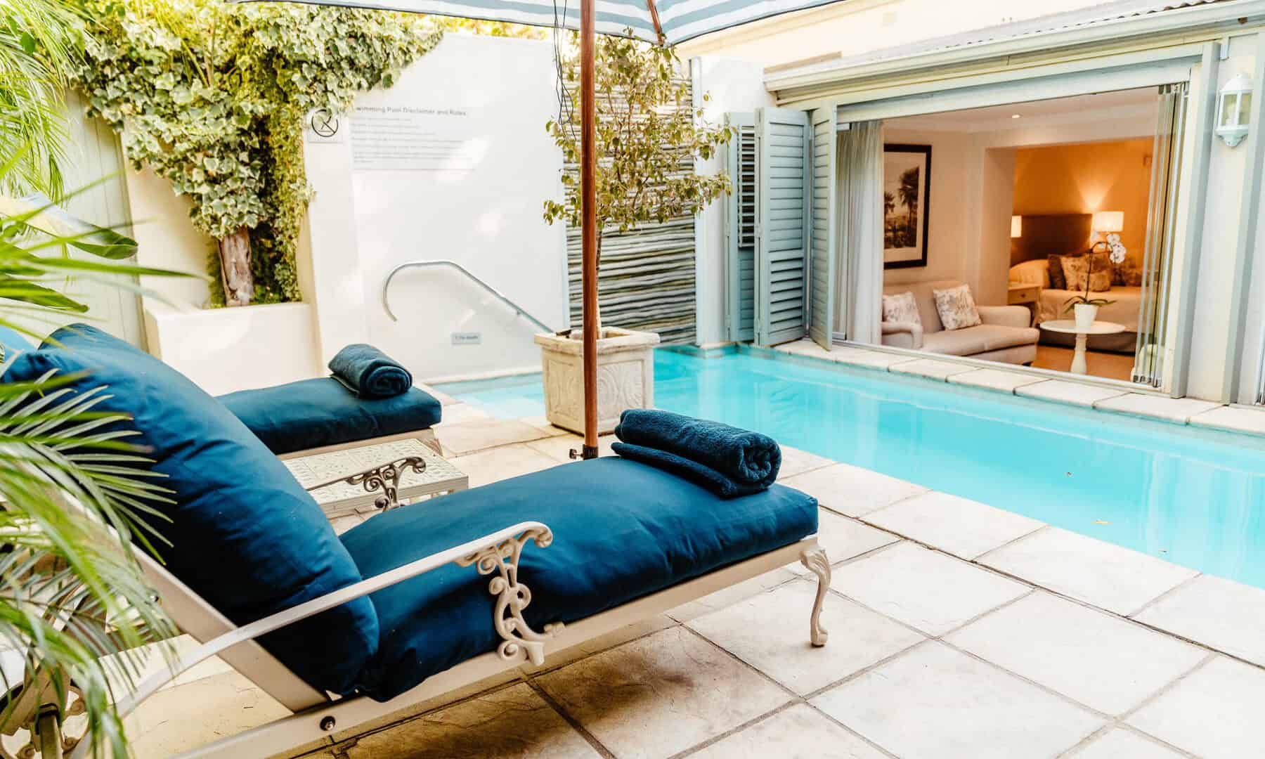 The generous guest lounge at our Franschhoek ‘beyond boutique’ hotel opens on to a sun-drenched, poolside patio and courtyard featuring a sizeable, sparkling pool.