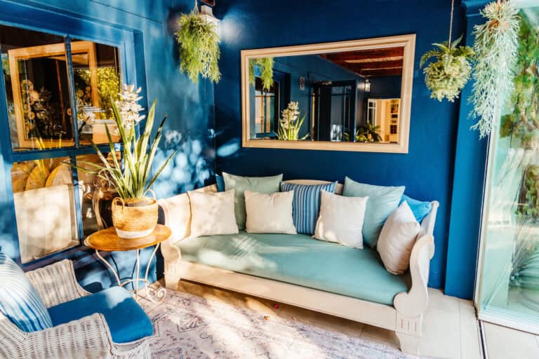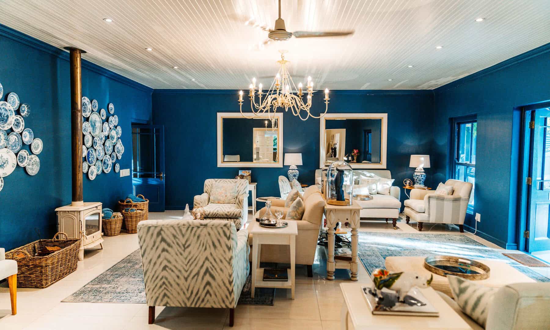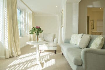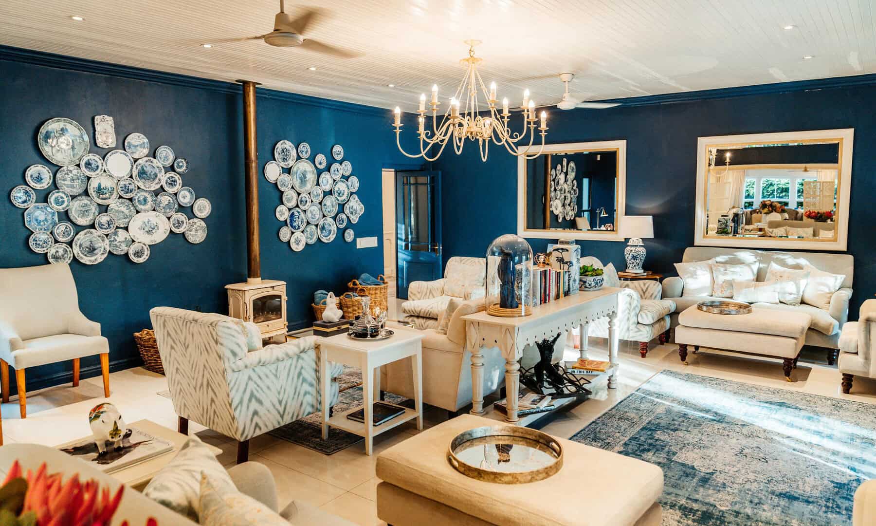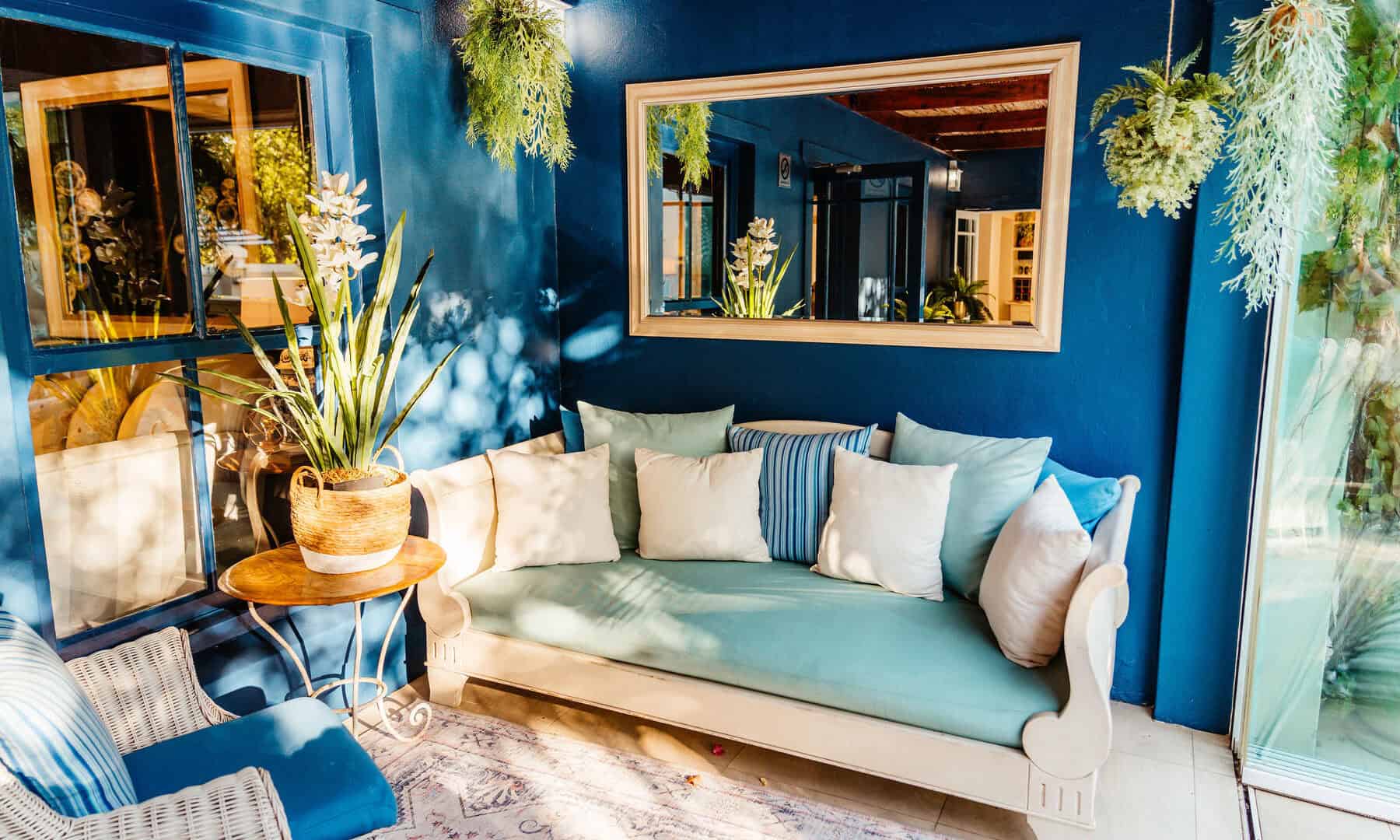 The generous guest lounge at our Franschhoek ‘beyond boutique’ hotel opens on to a sun-drenched, poolside patio and courtyard featuring a sizeable, sparkling pool.