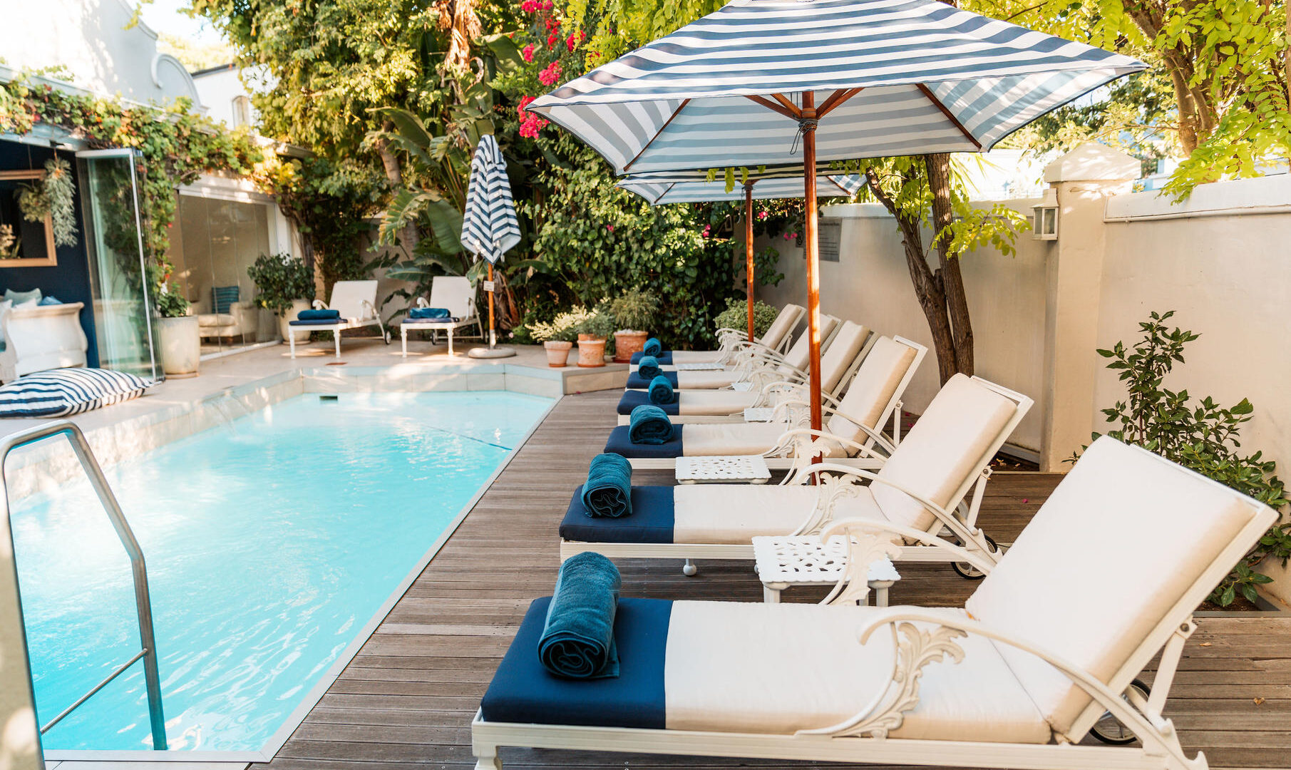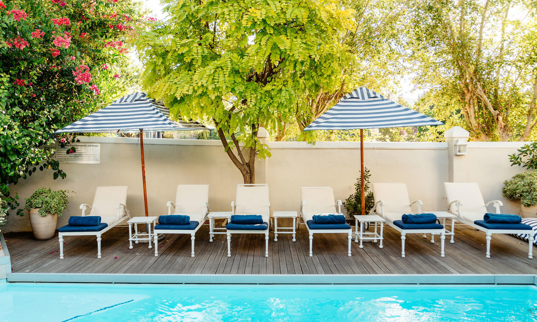 The generous guest lounge at our Franschhoek ‘beyond boutique’ hotel opens on to a sun-drenched, poolside patio and courtyard featuring a sizeable, sparkling pool.
